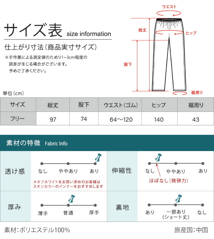 フリー:総丈97、股下74、ウエスト(ゴム)64~120、ヒップ140、裾周り43