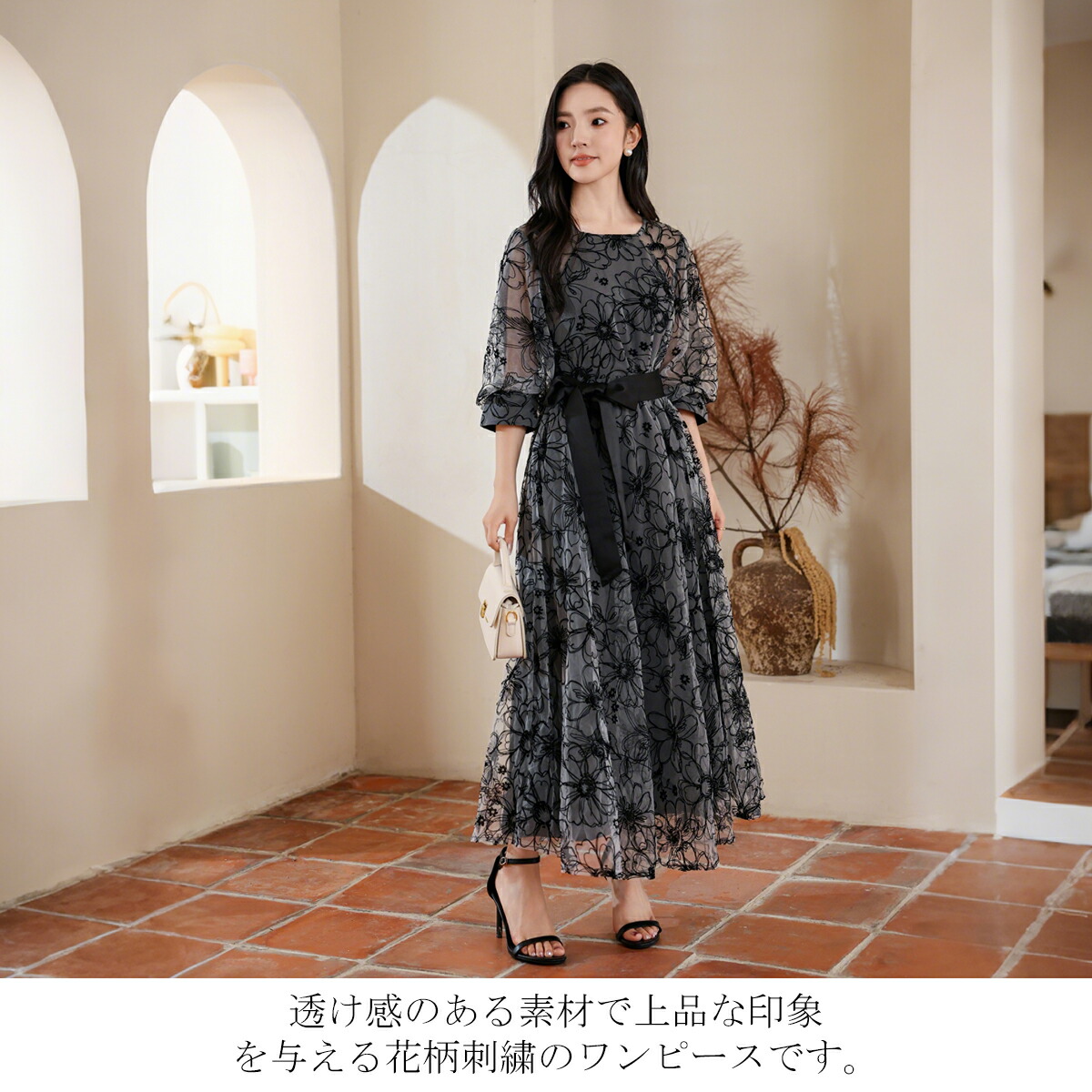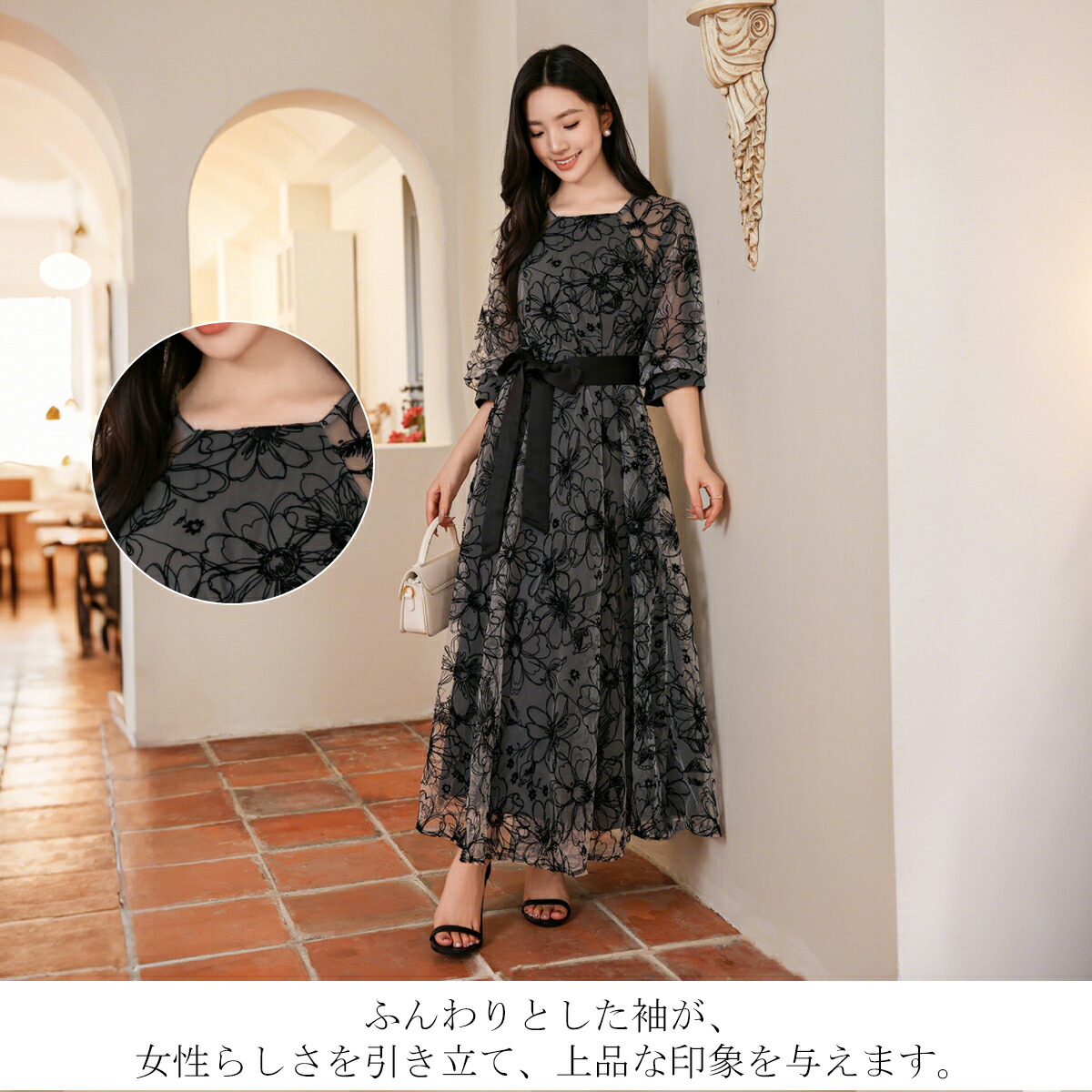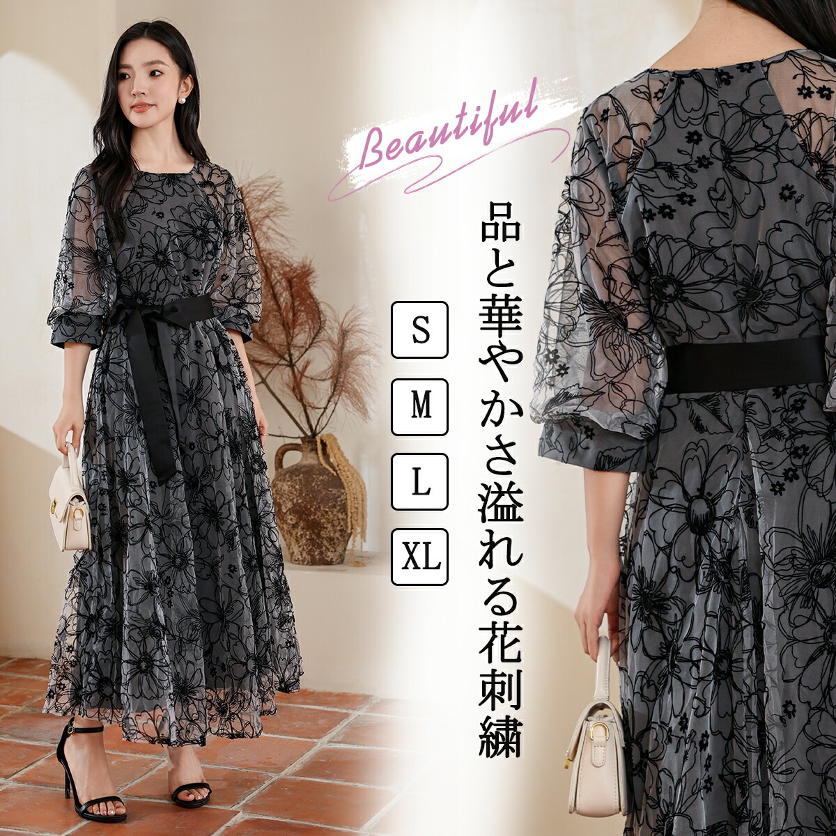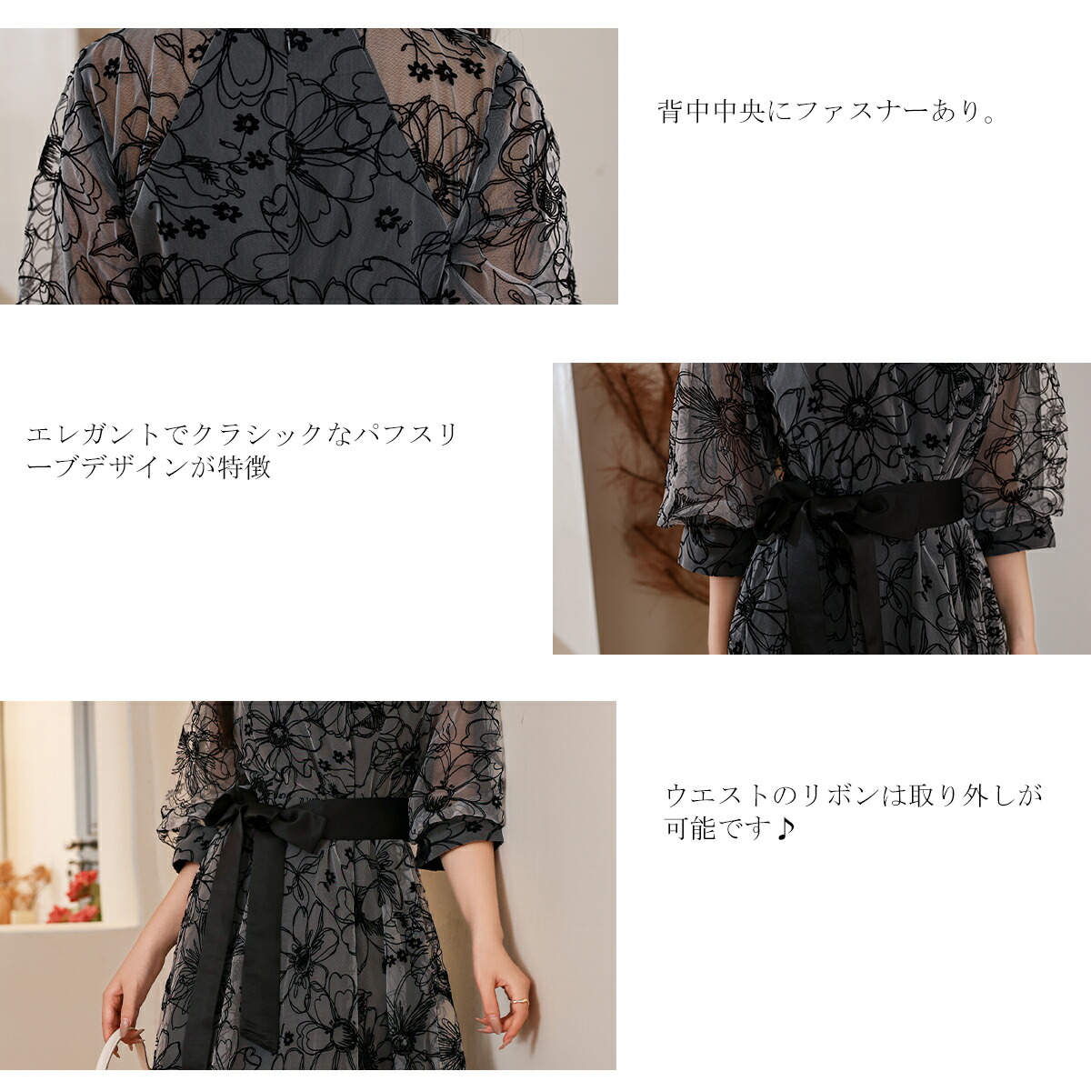 パーティードレス レース ワンピース ロング丈 透け感 体型カバー ロング 長袖 冬 花柄刺繍 ミディアム丈 袖レース 5分袖 パフスリーブ 結婚式 二次会 シースルー 裏地 春 秋 クラシカルド 黒