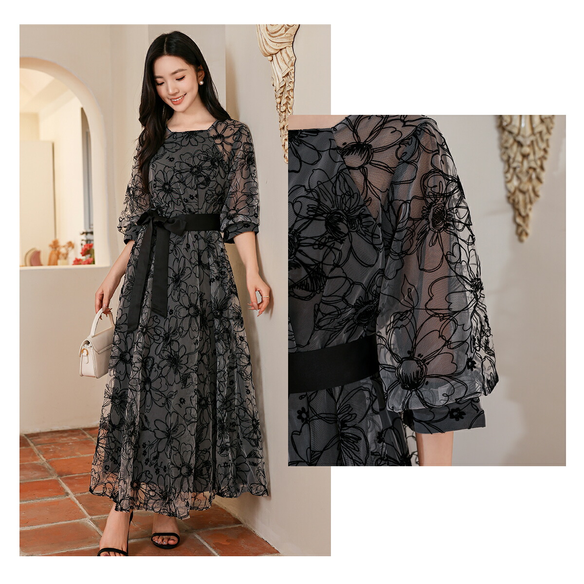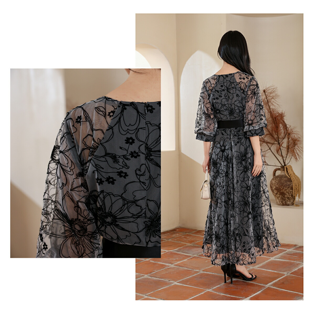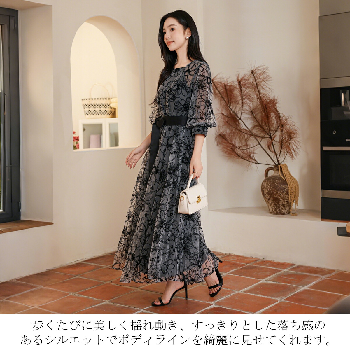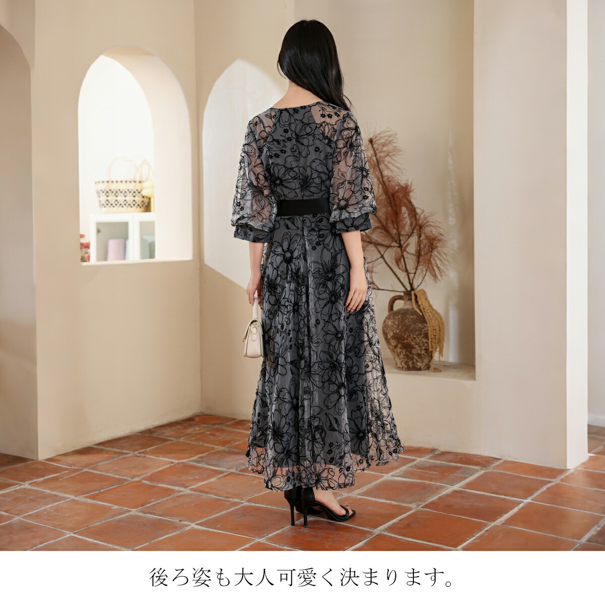 パーティードレス レース ワンピース ロング丈 透け感 体型カバー ロング 長袖 冬 花柄刺繍 ミディアム丈 袖レース 5分袖 パフスリーブ 結婚式 二次会 シースルー 裏地 春 秋 クラシカルド 黒