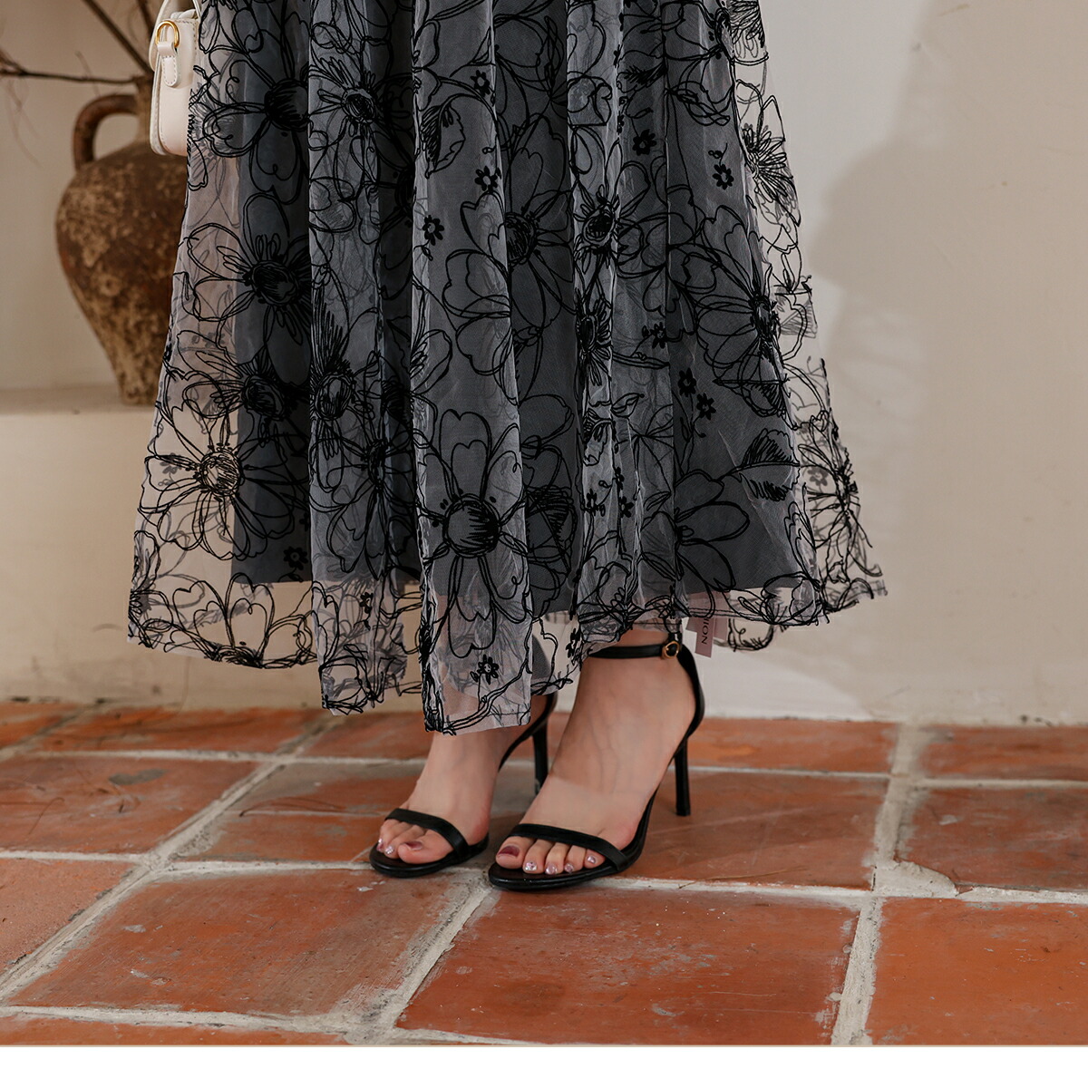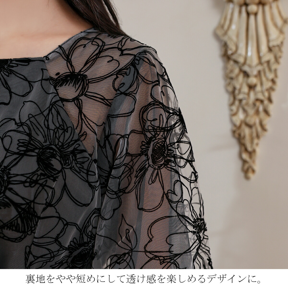 透け感のある素材で上品な印象を与える花柄刺繍のワンピースです。