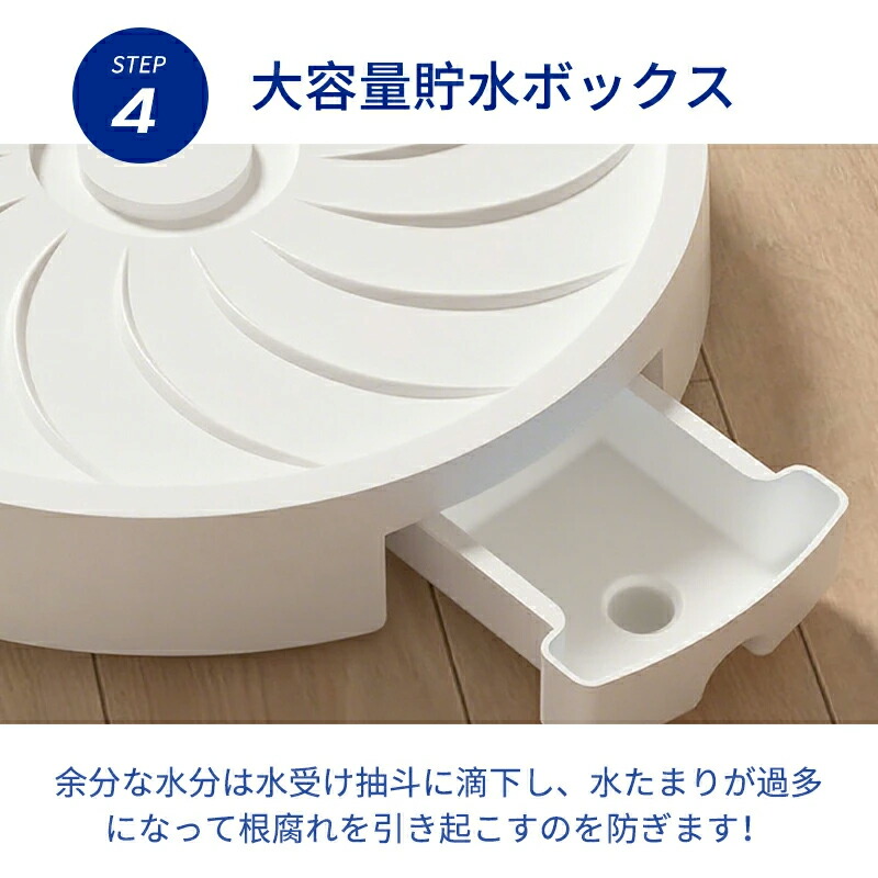 【排水機能と通気性で植物を健康に】この鉢置き台は、植物の健康を第一に考えた設計が魅力です。 排水穴付きのベースデザインが水はけを良くし、鉢底の通気性を確保することで、根腐れのリスクを軽減。また、鉢の底面が直接地面に触れないため湿気の影響を最小限に抑えます。 さらに、耐久性のある素材を使用しており、屋内外問わず長くお使いいただけます。日常の手入れが楽になるだけでなく、植物も生き生きと育ちます。