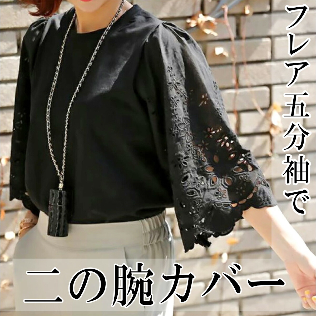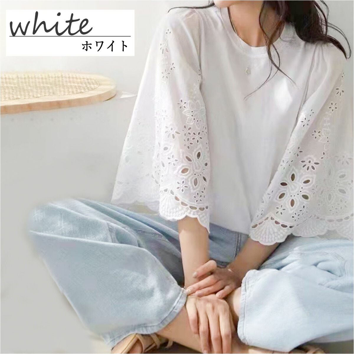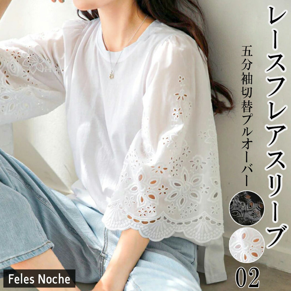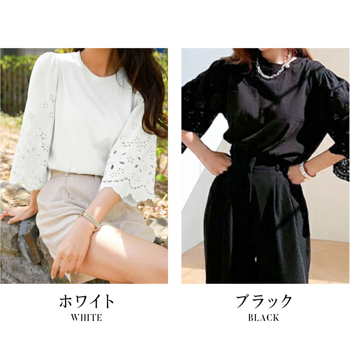 コットンレース フレアスリーブ プルオーバー 5分袖 花柄パンチングレース春 夏 きれいめ 可愛い クルーネック 綿混 二の腕隠し ラウンドネック ブラウス カットソー レディース 白 黒 大人 無地