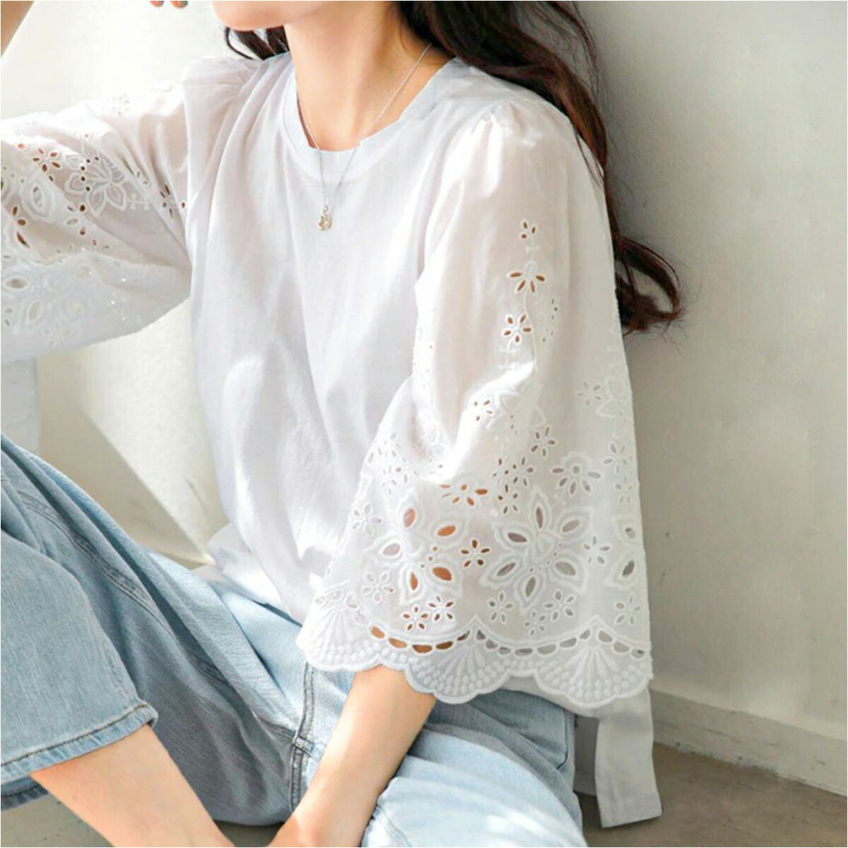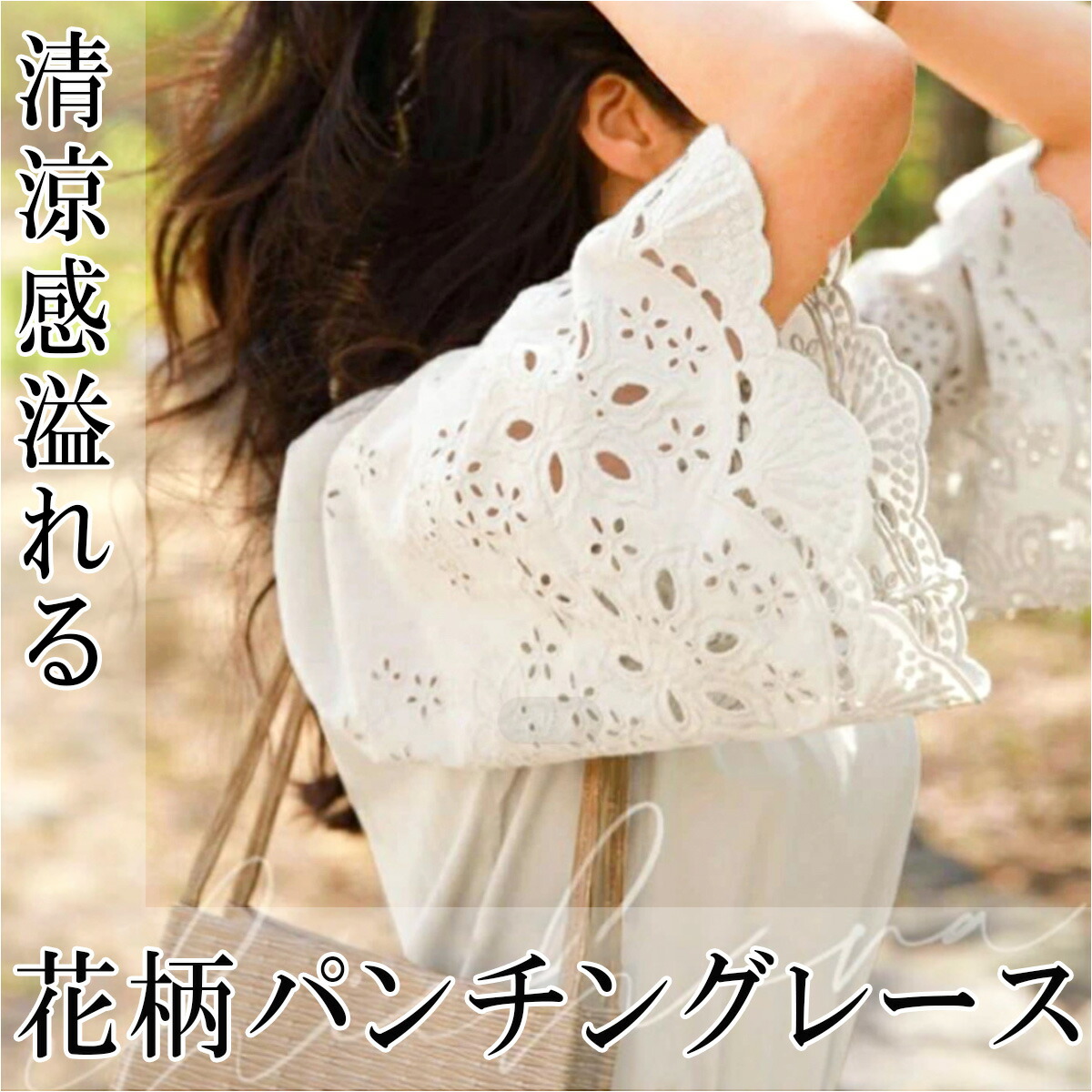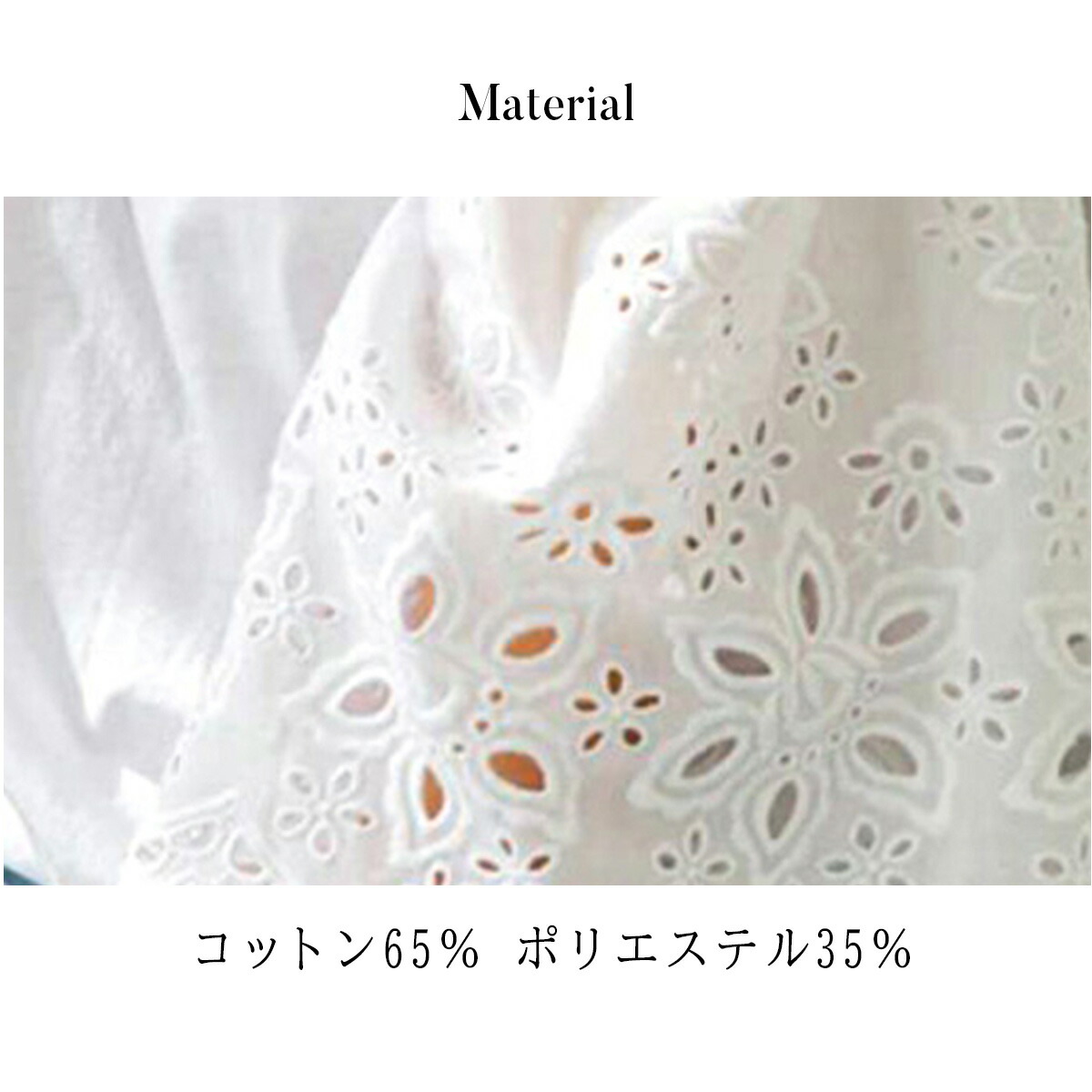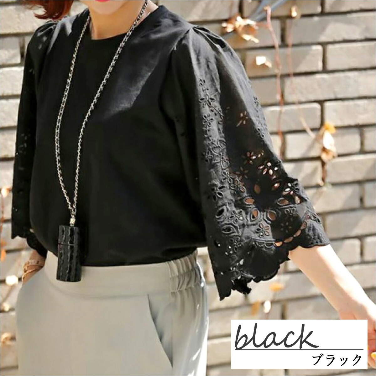 コットンレース フレアスリーブ プルオーバー 5分袖 花柄パンチングレース春 夏 きれいめ 可愛い クルーネック 綿混 二の腕隠し ラウンドネック ブラウス カットソー レディース 白 黒 大人 無地
