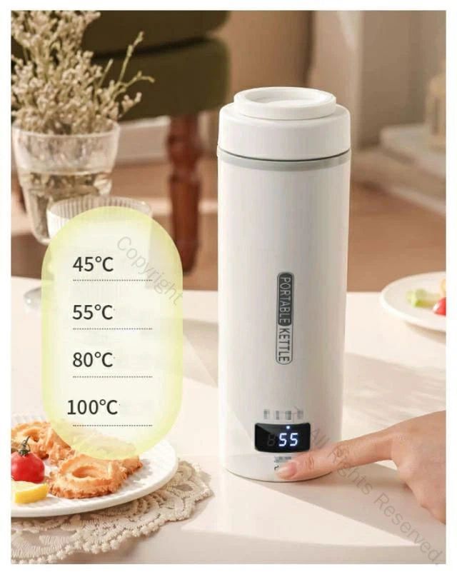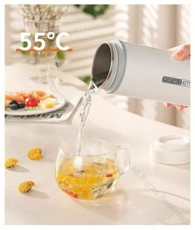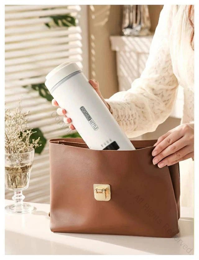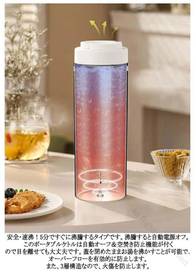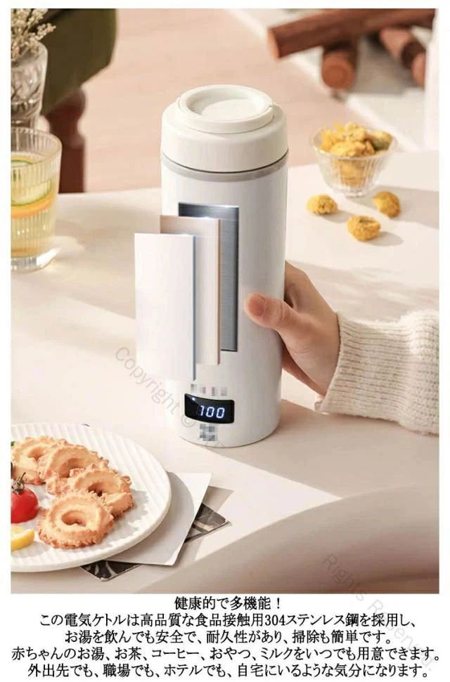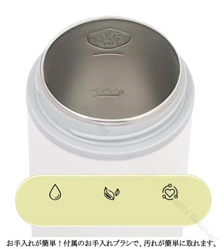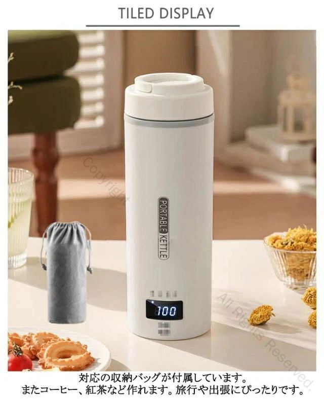 USB保温 ポータブル電気ケトル。対応の収納バッグが付属しています。またコーヒー、紅茶など作れます。旅行や出張にぴったりです。安全・速沸!5分ですぐに沸騰するタイプです。沸騰すると自動電源オフ。このポータブルケトルは自動オーフ&空焚き防止機能が付くので目を離せても大丈夫です。蓋を閉めたままお湯を沸かすことが可能で、オーバーフローを有効的に防止します。また、3層構造なので、火傷を防止します。健康的で多機能!この電気ケトルは高品質な食品接触用304ステンレス鋼を採用し、お湯を飲んでも安全で、耐久性があり、掃除も簡単です。赤ちゃんのお湯、お茶、コーヒー、おやつ、ミルクをいつでも用意できます。 外出先でも、職場でも、ホテルでも、自宅にいるような気分になります。お手入れが簡単!付属のお手入れブラシで、汚れが簡単に取れます。