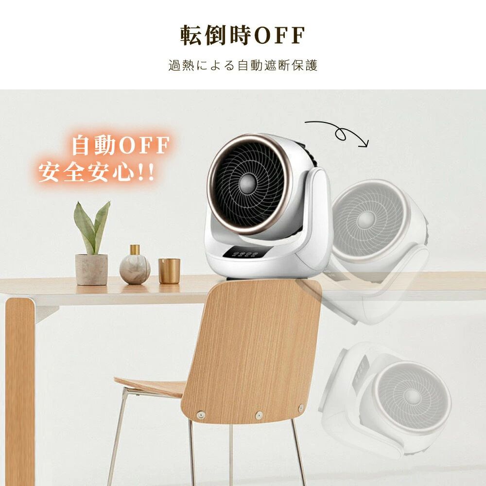 【安心安全な機能】転倒自動OFF機能:地震や不意の転倒に備えた転倒時電源遮断装置を搭載しており、衝撃して転んだときに自動的に電源も切ります。 万が一不意の衝撃でもこの電気ヒーターが倒れても、自動的に電源が切ります。過熱防止機能:本体が連続運転によって過熱すると、自動的に過熱保護機能が起動され、電源が自動的に切ってくれます。直火なし:PTCセラミックを活用して発熱し温風で温めるため、ガスや石油などのオイルをを使わないため、明火なしに室内空気を汚さず、換気しにくい場所での使用にもビックリ!また本製品はPSE認証済み暖房器具です。赤ちゃんやペットのいるご家庭でも安心に使えます