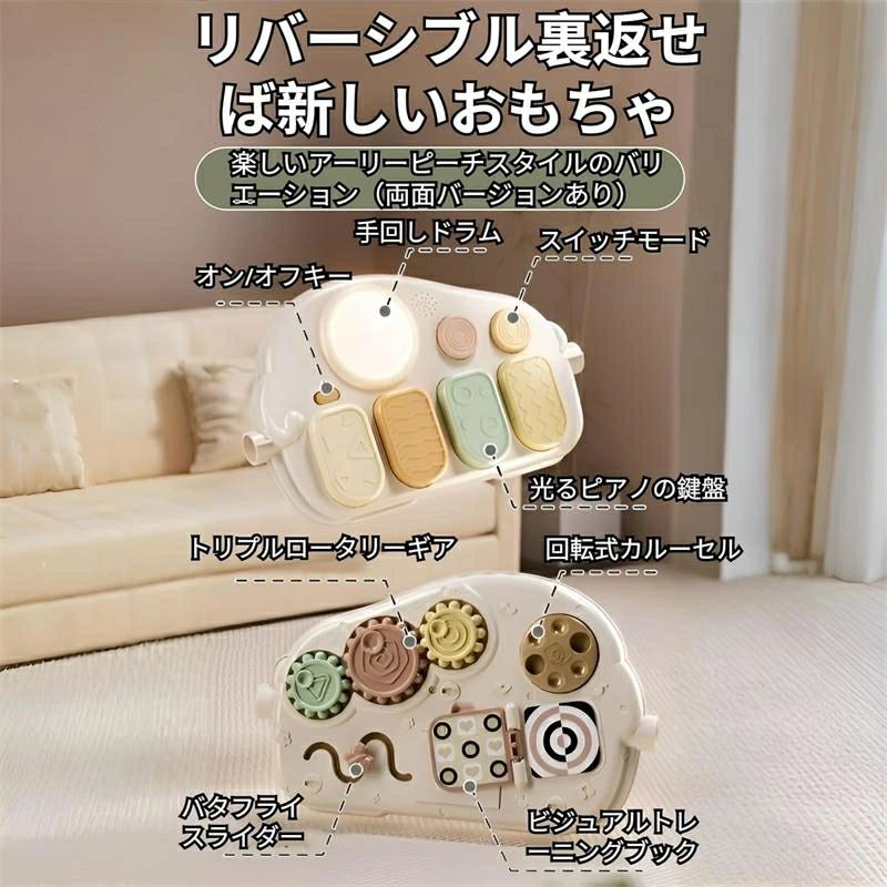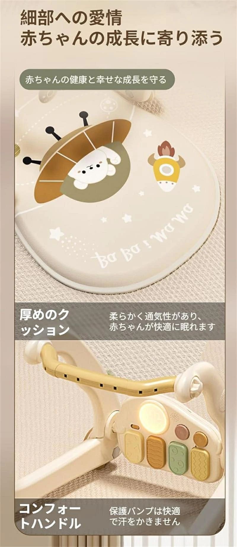 【五感を育む仕掛け】カラフルな視覚トレーニングパーツ・リズムに反応する音楽キー・触って楽しい回転ディスクを搭載。見る・聞く・触る体験を通じて、赤ちゃんの感覚機能と知的好奇心を自然に伸ばします。