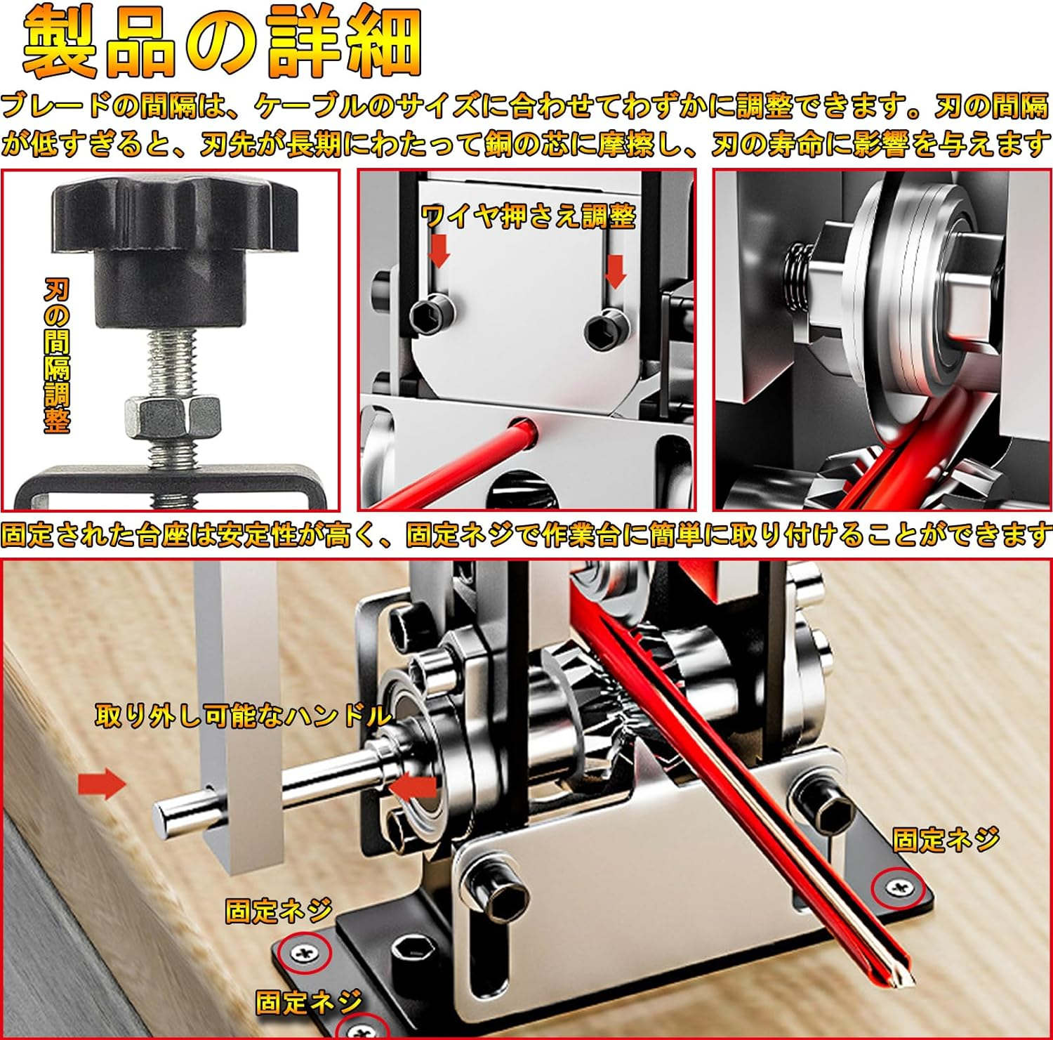 【刃の間隔調整可能】ブレードの間隔は、ケーブルのサイズに合わせてわずかに調整できます。刃の間隔が低すぎると、刃先が長期にわたって銅の芯に摩擦し、刃の寿命に影響を与えます。