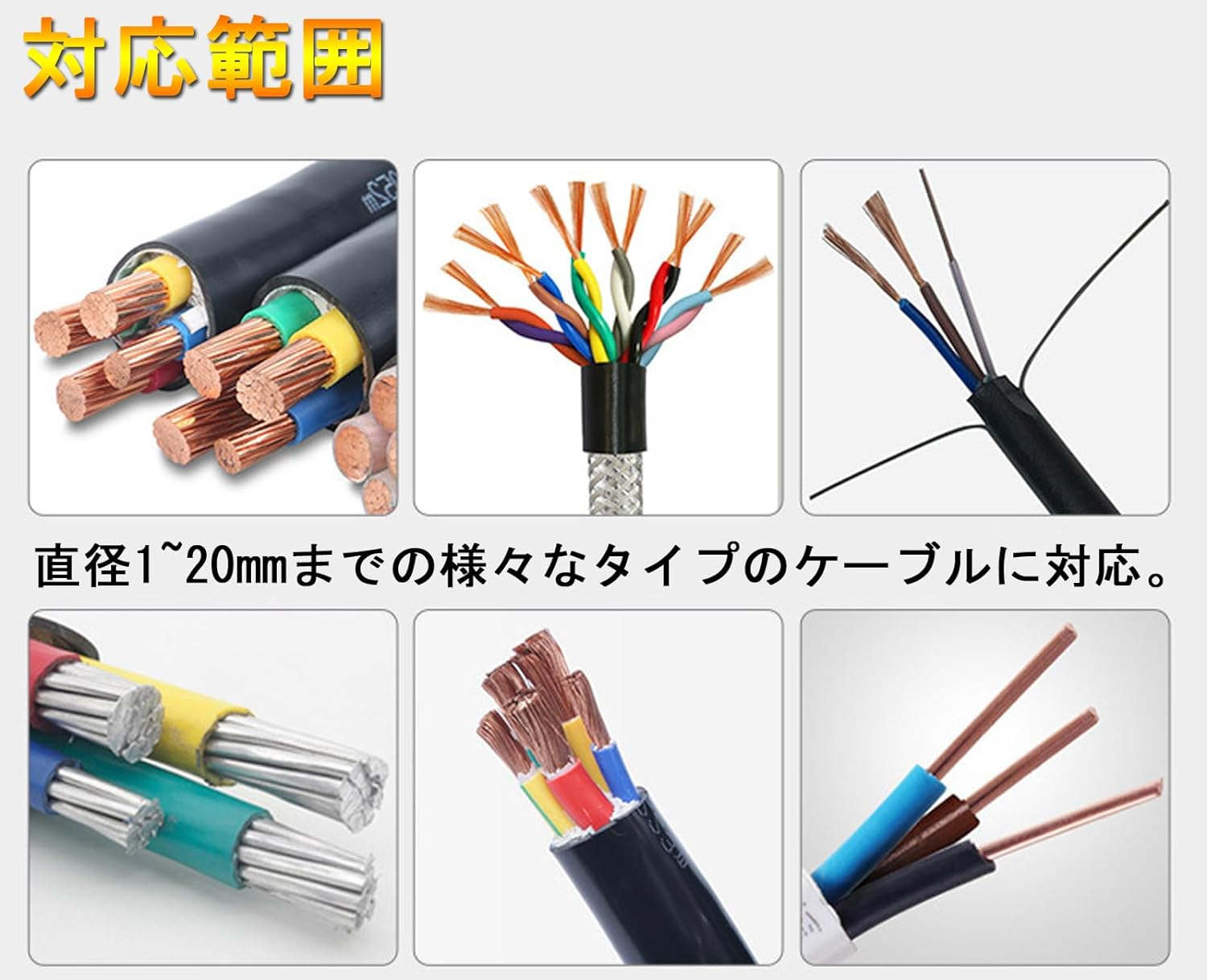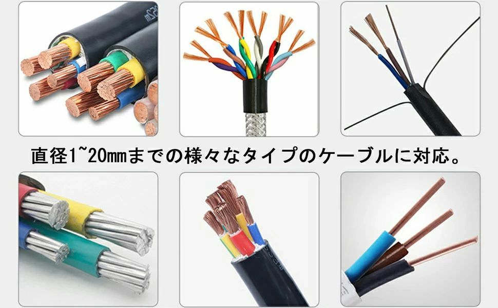 【対応範囲】直径1~20mmまでの様々なタイプのケーブルに対応。3つの異なるサイズの入口があり、ケーブルの直径に応じて入口を選択できます。