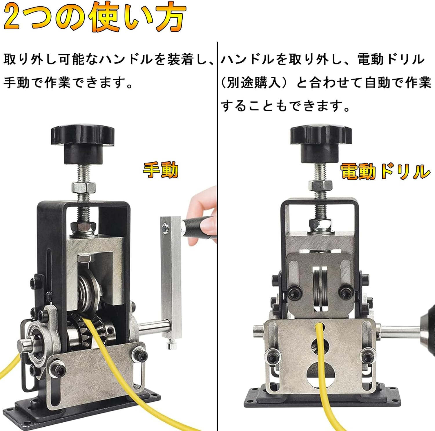 【2つの使い方】取り外し可能なハンドルを装着し、手動で作業できます。ハンドルを取り外し、電動ドリル(別途購入)と合わせて自動で作業することもできます。使いやすく、作業効率が大幅に向上します。
