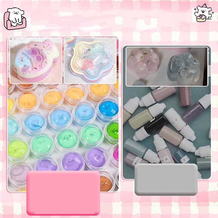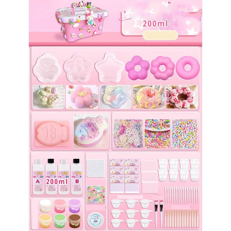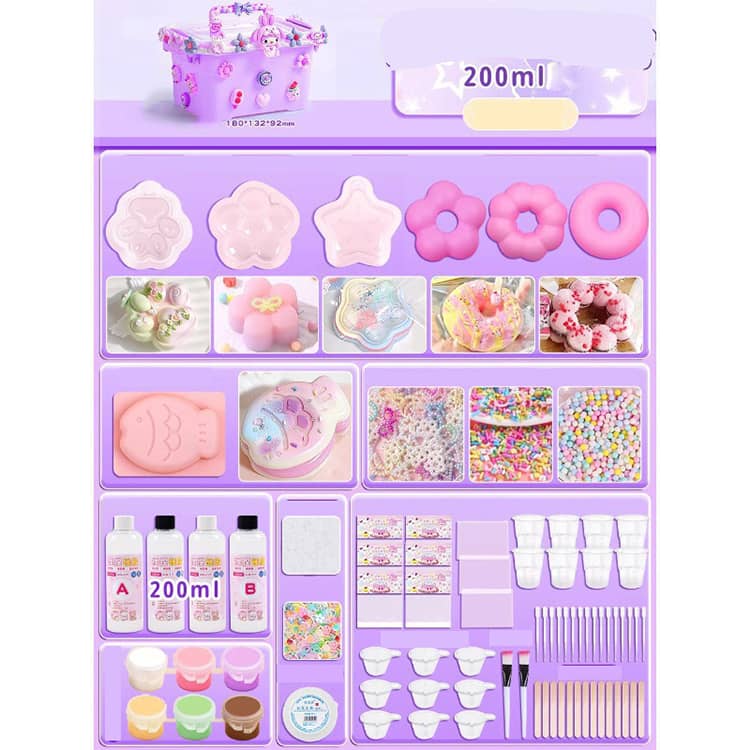 セット内容:収納ケース、シリコンモールド×6、スクイーズジェルAとB200ml、スクイーズ用着色剤×3(色ランダム発送)、パールリボン*20、飾りボール*2、EVA袋*10、ジッパー袋*2、カップ*2、30ml分膠カップ*10、ブラシ*1、かき混ぜ棒*10、ワセリン、スポイト*3、フロックパウダー、スパンコール