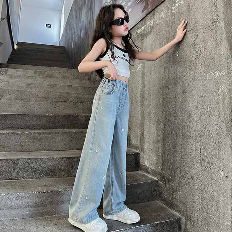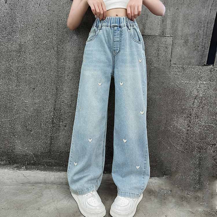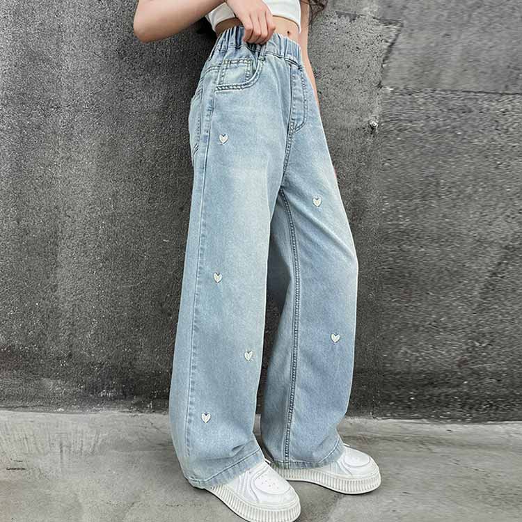 女の子 オシャレ デニムパンツ キッズ 春夏 ハート柄 子供服 ウエストゴム 刺繍 ワイドパンツ かわいい ジーパン ジーンズ ゆったり ボトムス 長ズボン 120 130 ダンス衣装