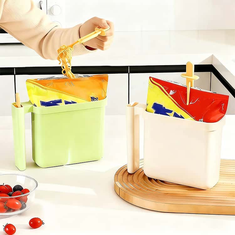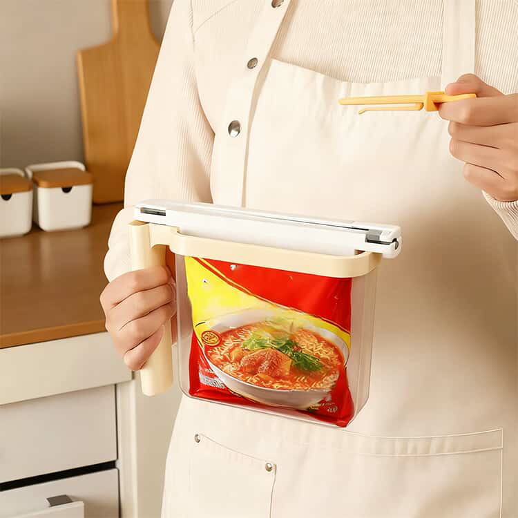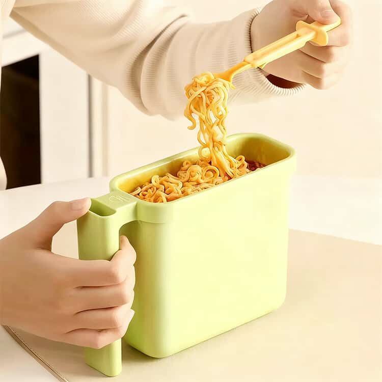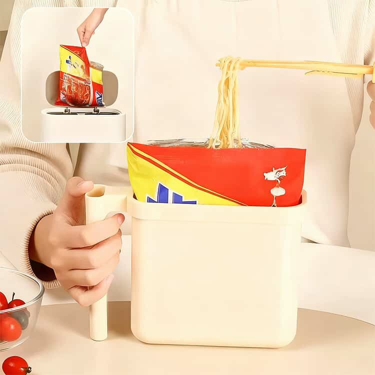 【時短生活を実現する多機能設計】袋入り麺をそのままセットできるインテリジェント構造。開封から食事まで3(開ける・注ぐ・待つ)の操作で、面倒な容器移し替え作業が不要に。