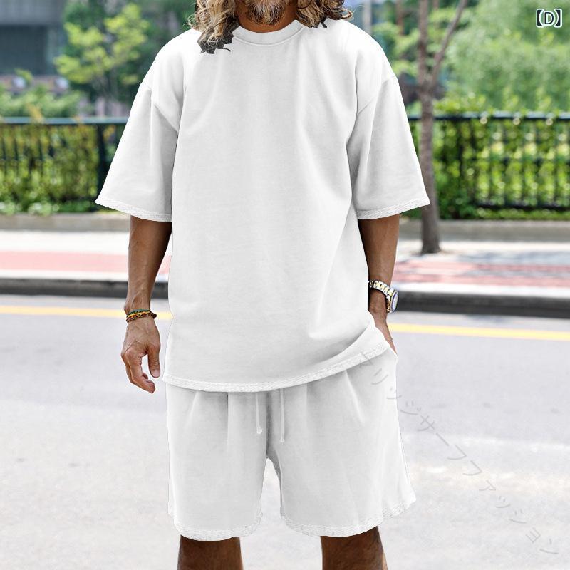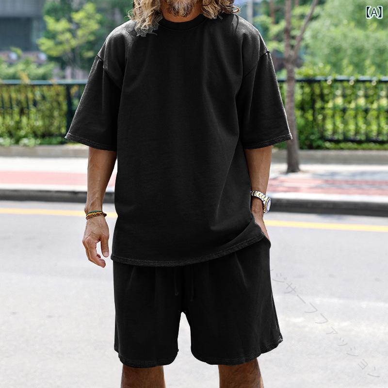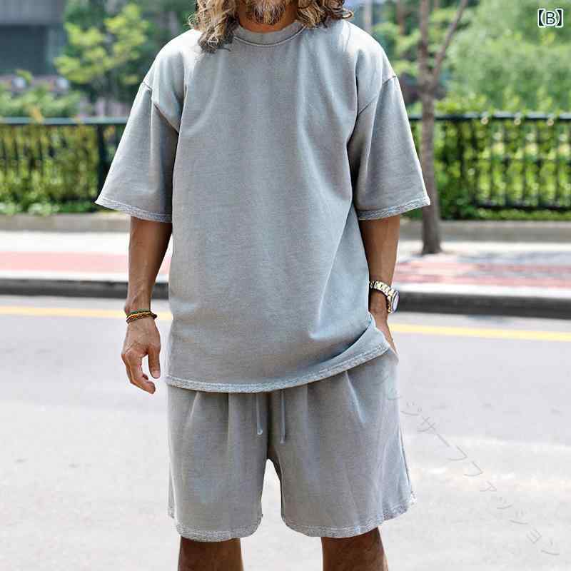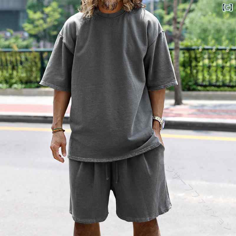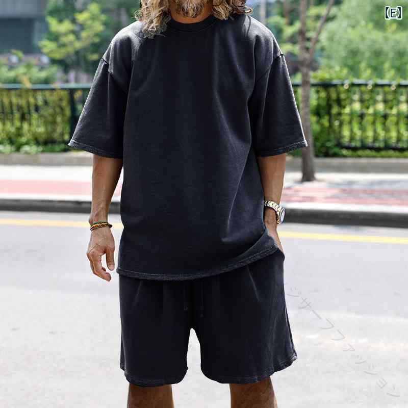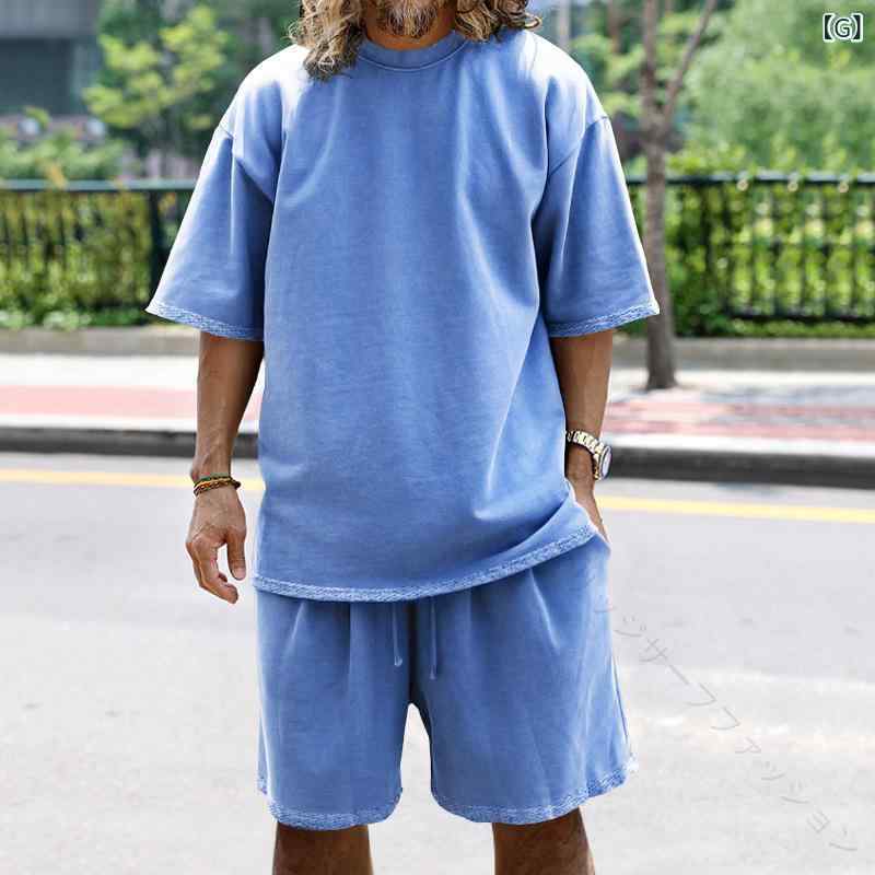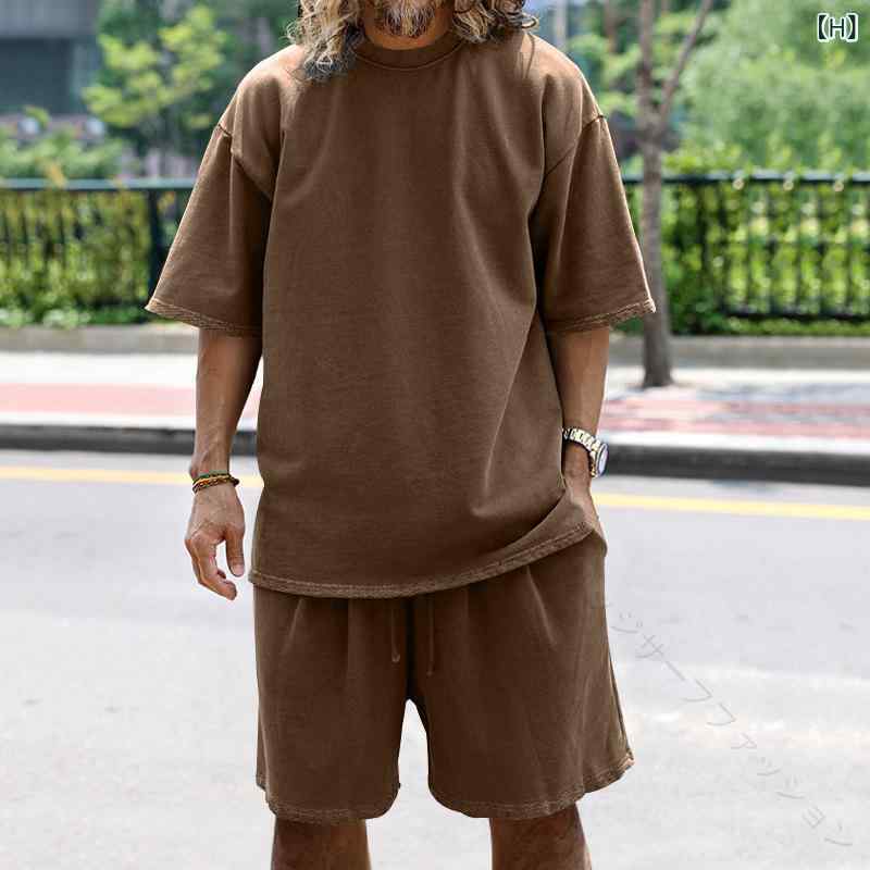 .メンズ セットアップ は 半袖 Tシャツ と ハーフパンツ の スウェット パイル生地 で ゆったり ルーズフィット の 薄手 綿混 素材 を 使用。夏 の カジュアル や スポーツ、 部屋着、 普段使い に 最適 で 多色展開 の トレンド ファッション です。快適 な 着心地 と リラックス ウェア としても 優秀。。