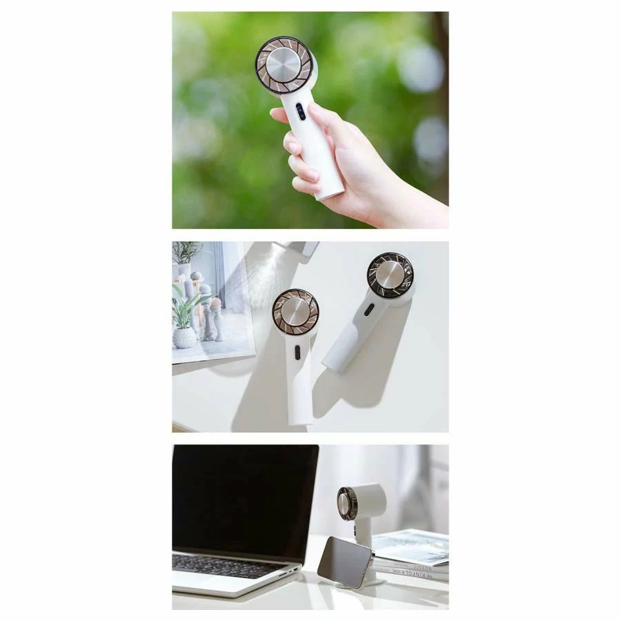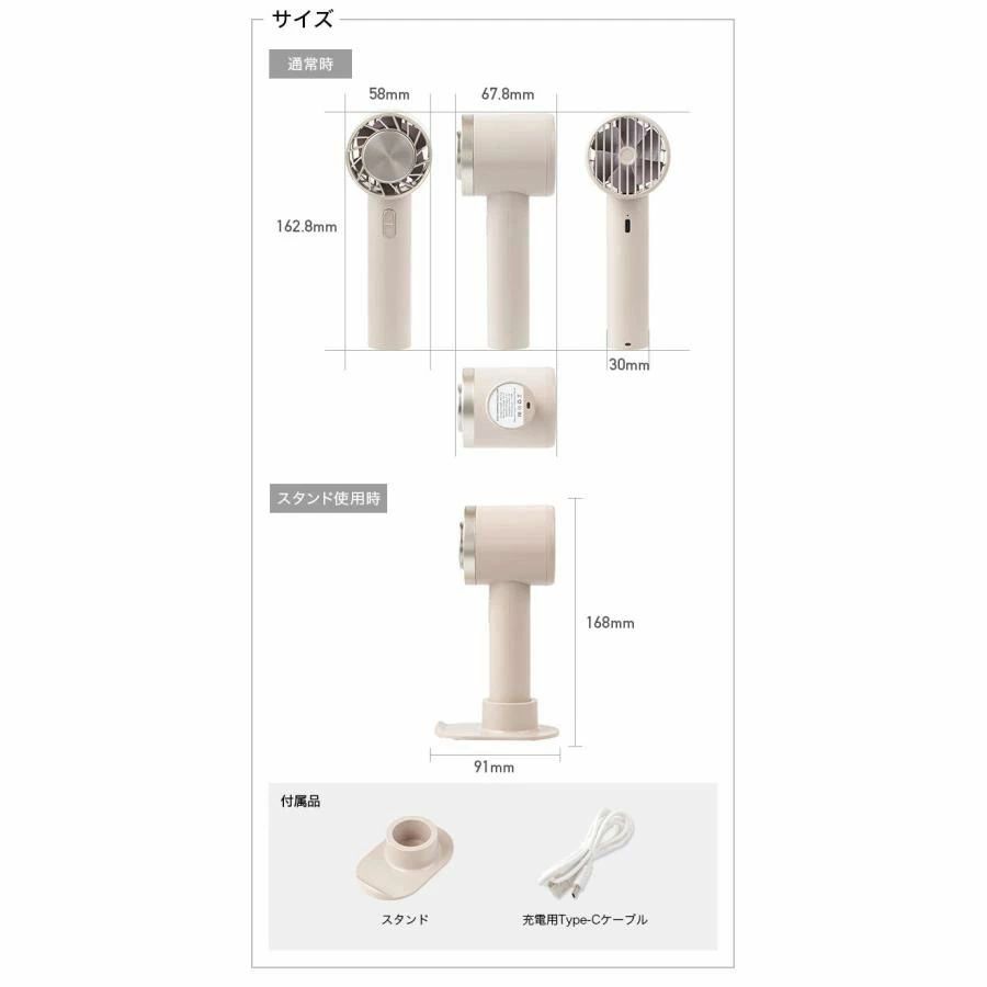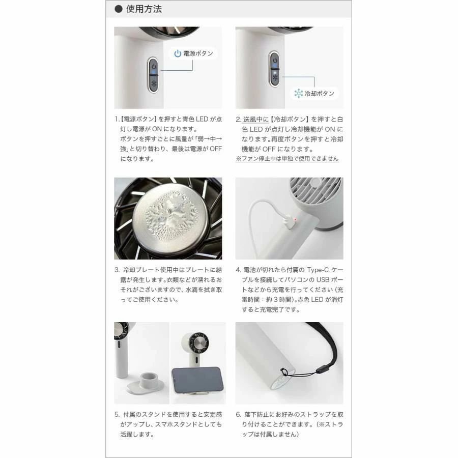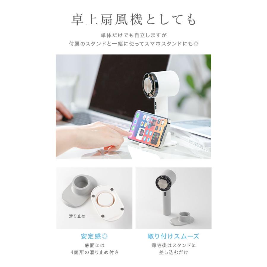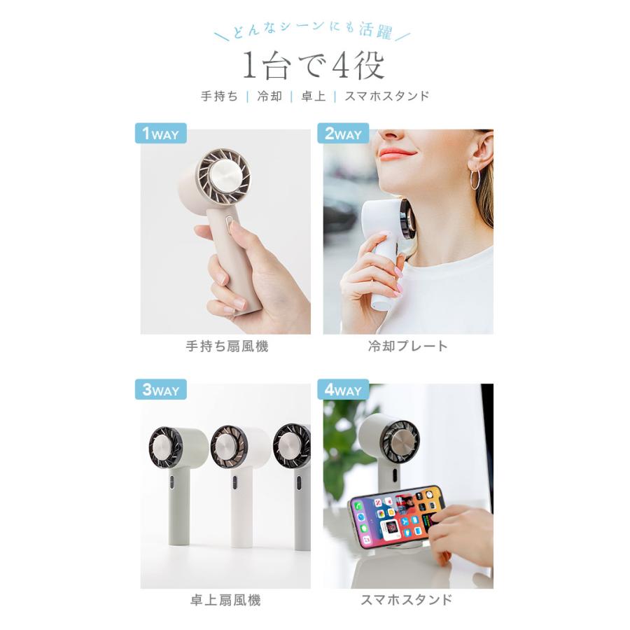 「手持ち扇風機」「卓上扇風機」「冷却プレート」「スマホスタンド」。これ1台で4役をこなす、マルチなハンディファンです。
