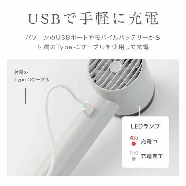 本体は付属のUSB Type-Cケーブルで充電。USB充電式なのでパソコンのUSBポートやモバイルバッテリー、USB-ACアダプタなどから手軽に充電できるのでお出かけ