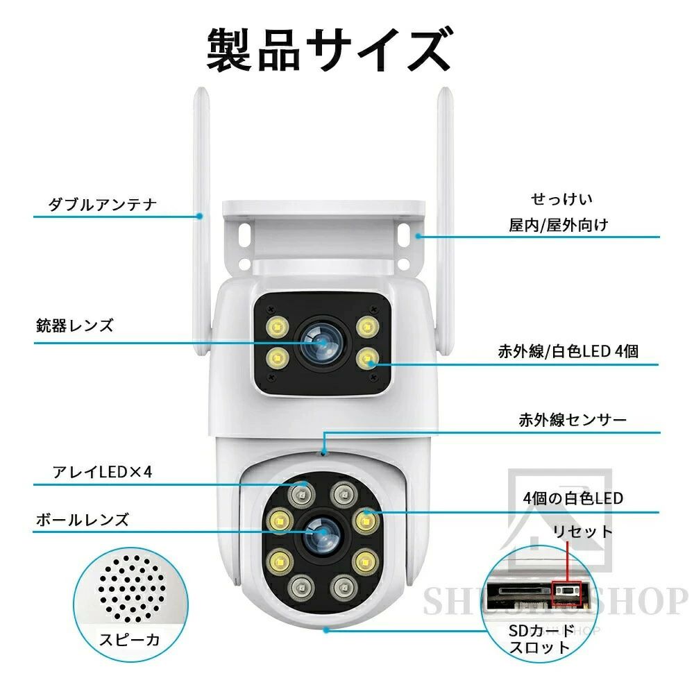 特徴(一台のカメラで二つの監視画面) 監視カメラは、上部には固定バレット型カメラ、下部にはPTZドームカメラが装備されています。死角なしで、2つの画面で同時に監視できます。上部の固定視野カメラは広範囲をカバーし、下部のドーム型PTZカメラは人体を検知して追跡できます。この一台のカメラで二台分の監視カメラの機能を得ることができ、コスト効率にも優れています! (AI人体検知+声光威嚇) AI人体検知機能は人体の形を検知し、警告を発します。これにより、木や葉、動物、車などの誤警報を有効に減らすことができます。また、動きを感知するとカメラが自動的に追跡し、重要な瞬間を逃さず記録します。夜間に不審者を検知すると、超高輝度ホワイトLEDが点灯し、同時にアラーム警報音も鳴り、威嚇効果が抜群です。これにより、犯罪の抑止効果も高まります。 (2.4GHz/5GHz Wi-Fiサポート) Wi-Fiネットワークカメラは専用アプリを使用して、画面をスワイプすることでカメラの角度を簡単に調整できます。最新のモジュールにより、2.4GHz Wi-Fiだけでなく、高速通信の5GHz Wi-Fi接続もサポートされています。これにより、よりクリアな映像をリアルタイムで表示できます。 (双方向通話・IP66防水) 内蔵された高品質スピーカーとマイクにより、双方向の通話を実現できる監視カメラです。留守時でも家の状況を確認し、泥棒に警告したり、家族と直接通話することができます。IP66の優れた防水防塵性があり、作業環境温度範囲は-10℃から+55℃まで対応しており、台風や大雨、大雪などの悪天候にも簡単に対応できる屋外防犯カメラです。