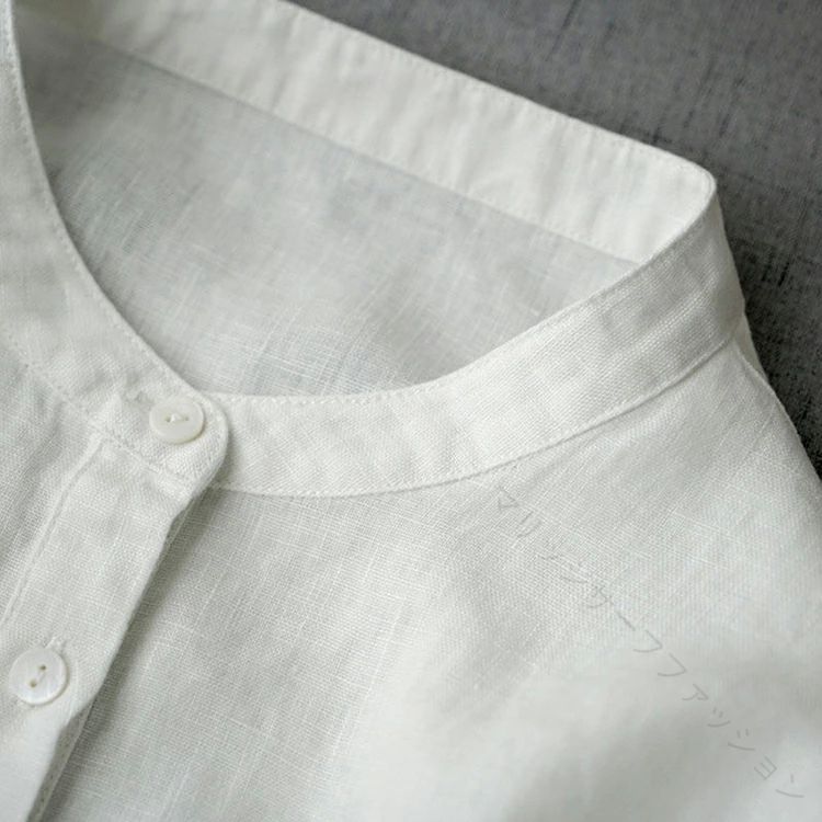 .きれいめ トップス の ゆったり スタンドカラー ボタンダウン ブラウス シャツ です。綿麻 素材 の 無地 長袖 デザイン で、カジュアル から オフィス まで 幅広く 活躍 します。快適 な 着心地 と シンプル な デザイン が 魅力 の 女性 向け アイテム です。。