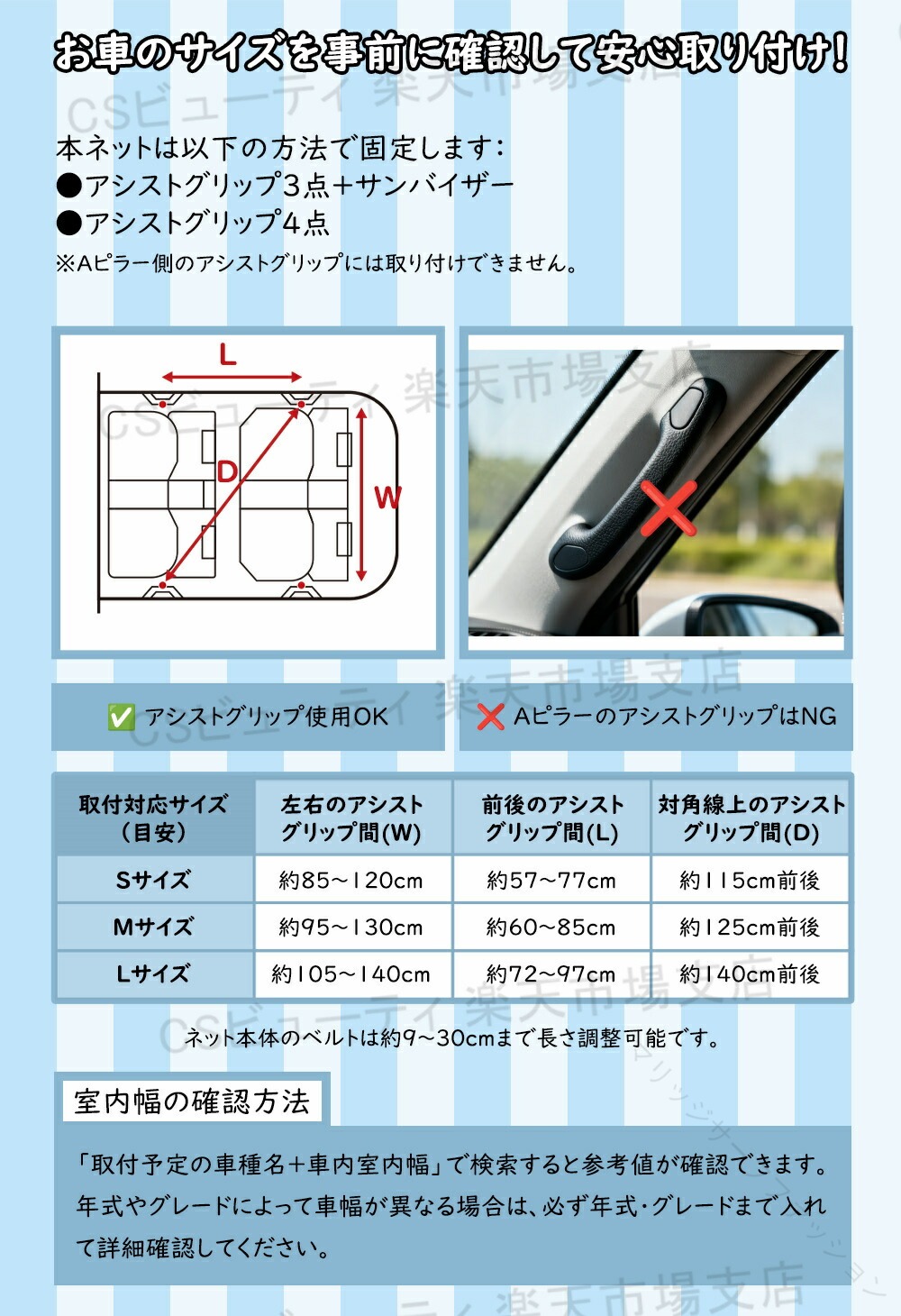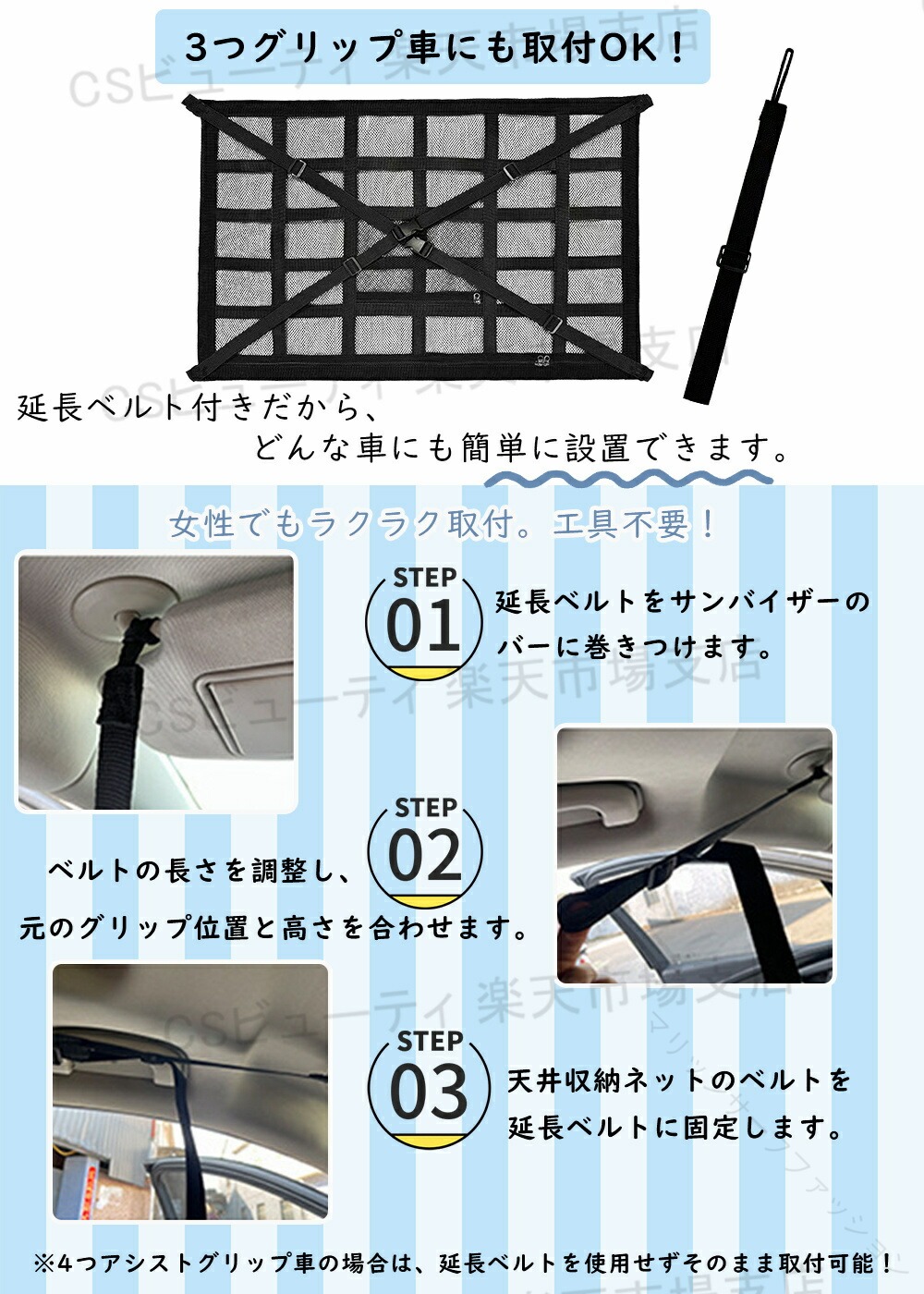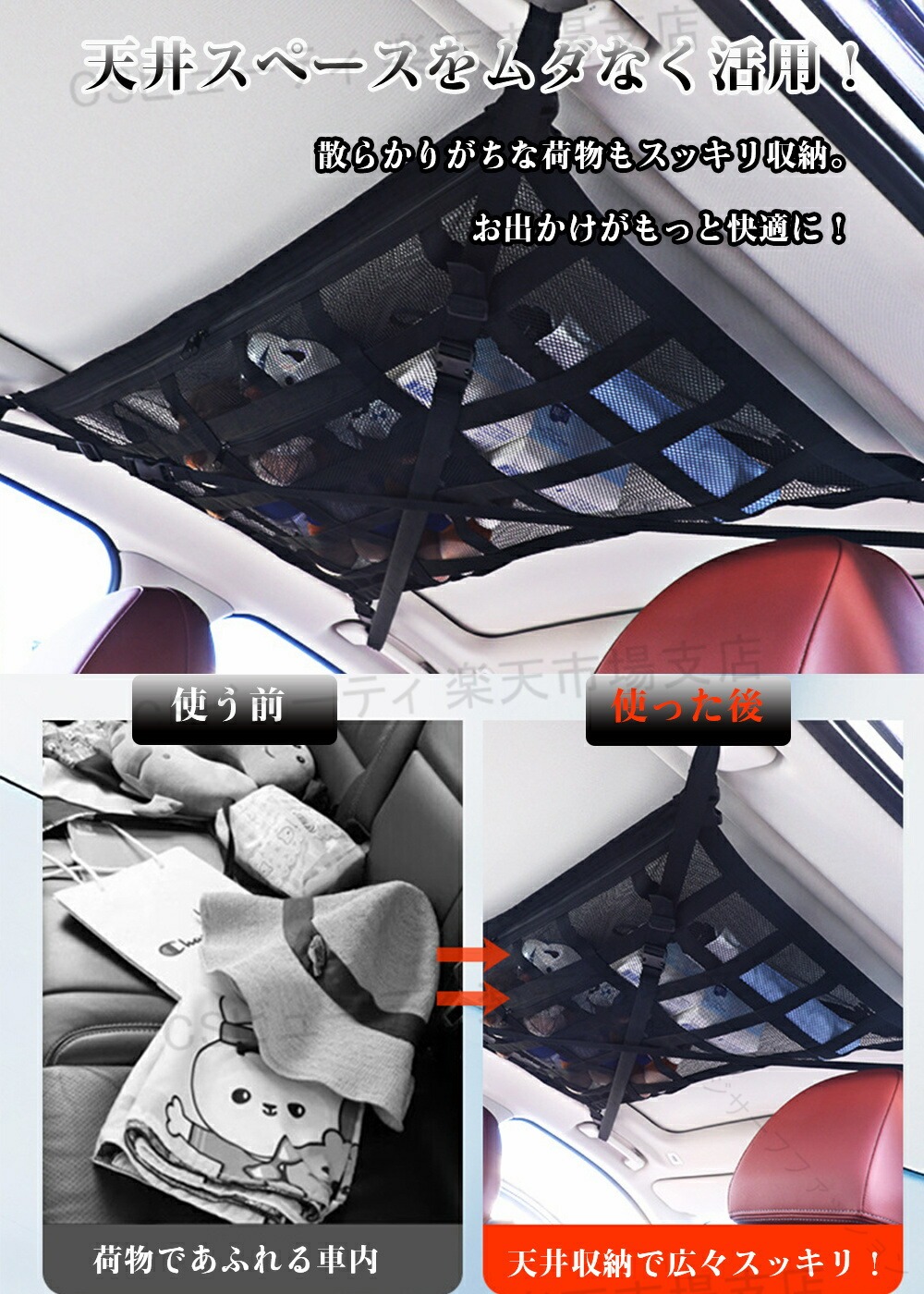.3つ グリップ 車 対応 の 天井 ネット は 車内 の 収納 に 最適 な 車用 天井 収納 ネット で 軽自動車 や ミニバン の 後部 座席 で 落下 防止 と 快適 な 収納 効果 を 発揮 します。 ジッパー 付き で 荷物 の 取り出し も 便利 な 汎用 サイズ S M L と 延長 ベルト 付き です。。