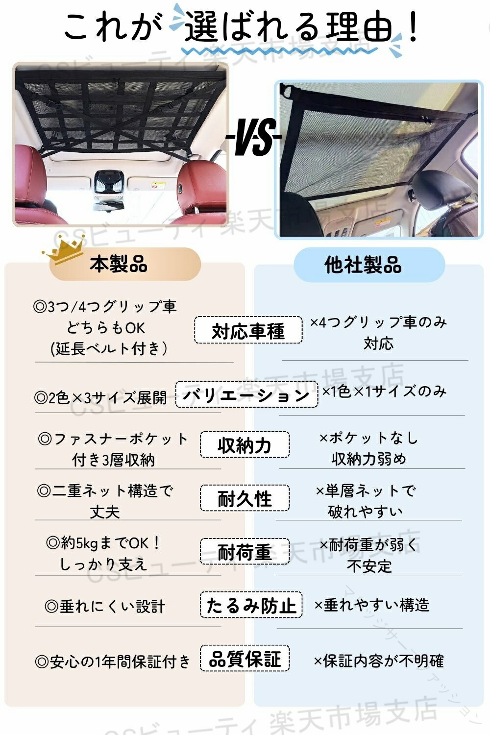 3つ グリップ 車 対応 天井 ネット 車内 収納 ジッパー 付き 軽自動車 ミニバン 落下 防止 座席 快適 車用 後部