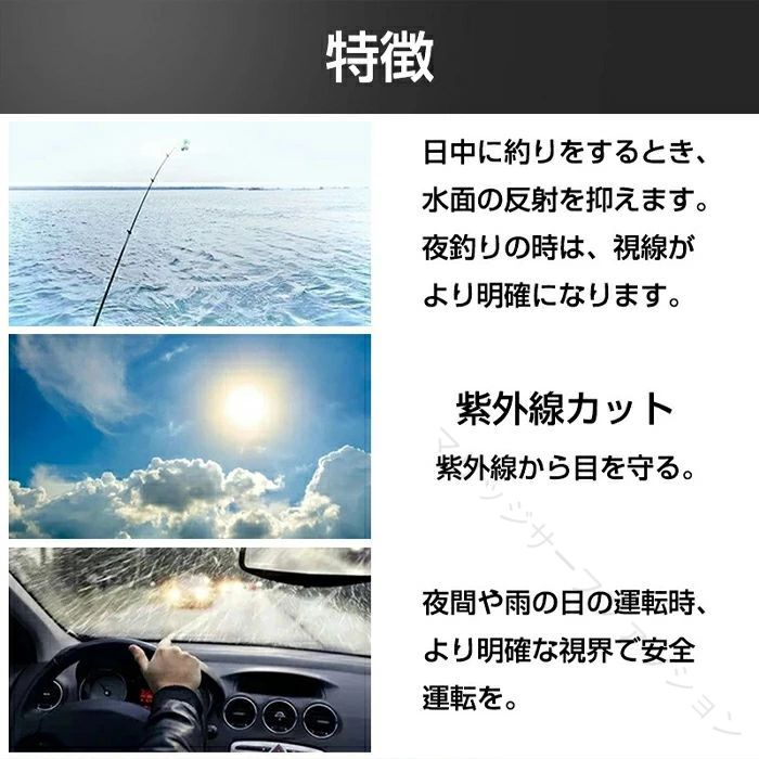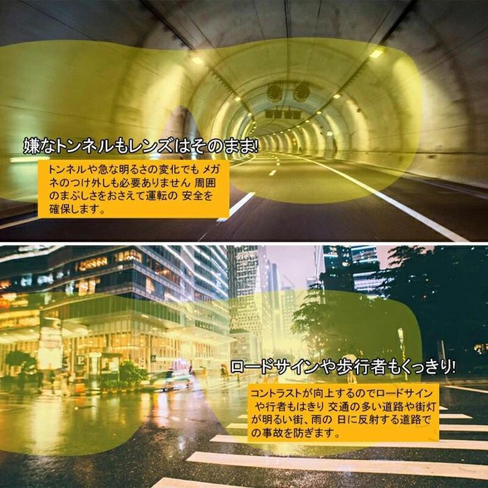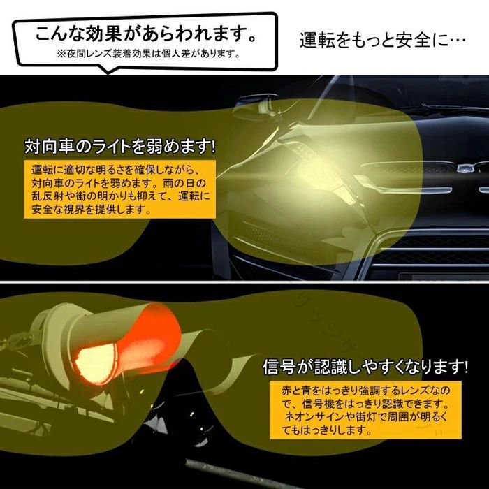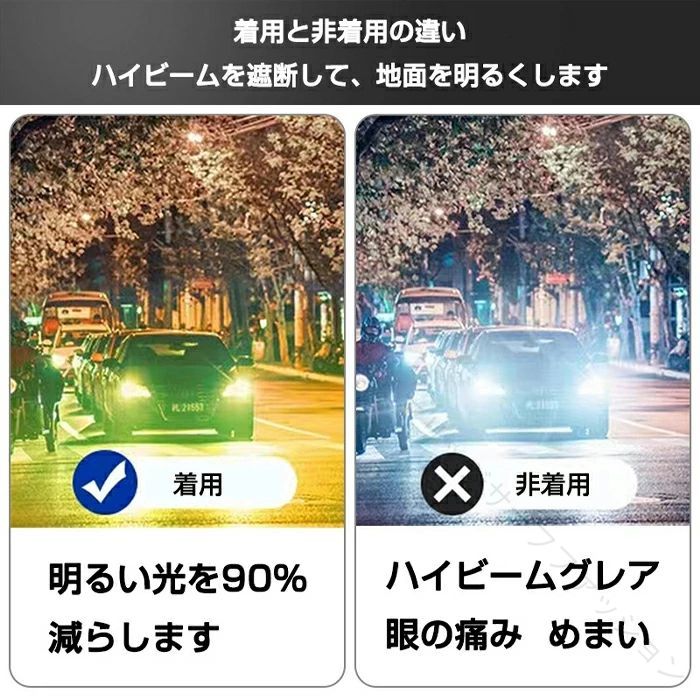 【特別なデザイン】 広いフレーム、ゆったりとした構造で圧迫感がない。再度レンズを採用し、見やすさが抜群。耐久性にも優れています。夜間や悪天候での運転時におススメです。雨の日は必需品です。 【目を守ります】 夜間の運転時、対向車のライトの眩しさを軽減します。目の疲労が緩和でき、あなたの目を守ります! 【特殊なサングラス】 普通のサングラスとは違い、眼鏡をかけたまま装着できるので、スポーツや野外活動、車の運転など幅広くお使いいただけます。 【アンチグレア】 メガネ越しのXメガネはアンチグレア機能を備えた特別なレンズで作られています、それはあなたが安全に運転するのを助けます。 【素材構成】