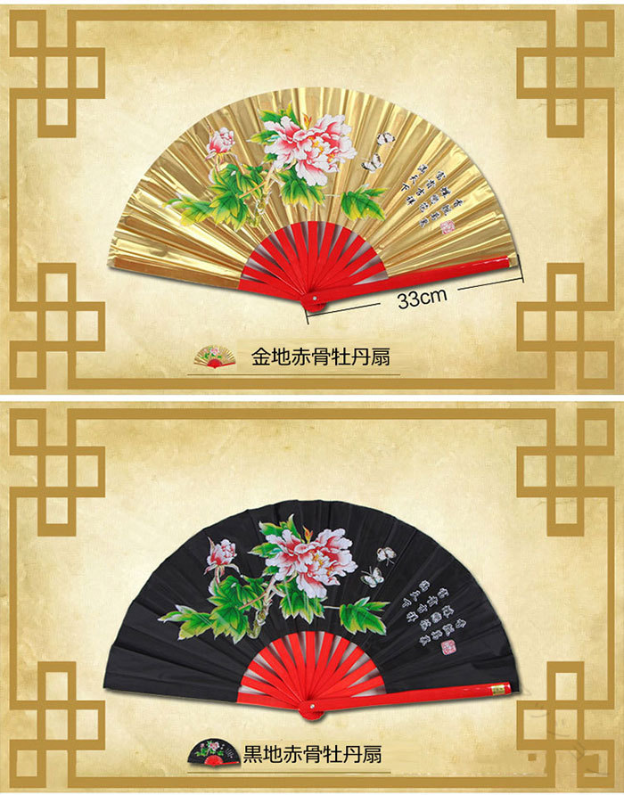 太極扇 竹製 赤金 青黒地 牡丹 4色 右扇 カンフー 太極拳 舞台 ステージ 演出 団体 お揃い 男女 兼用 ゴールド ブルー ブラック レッド