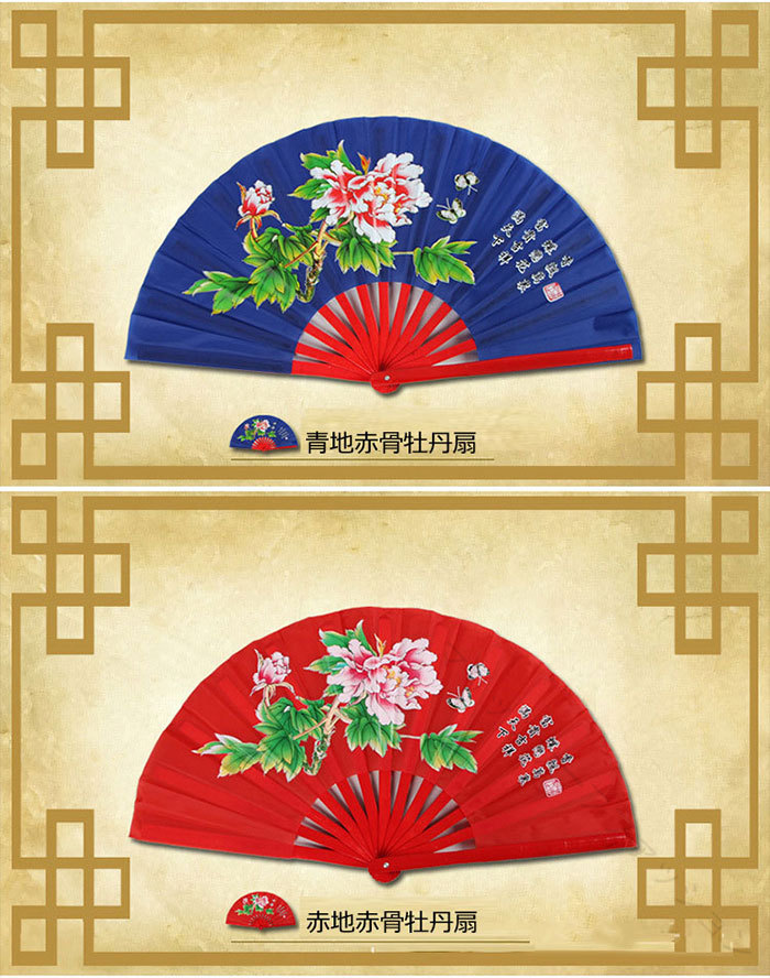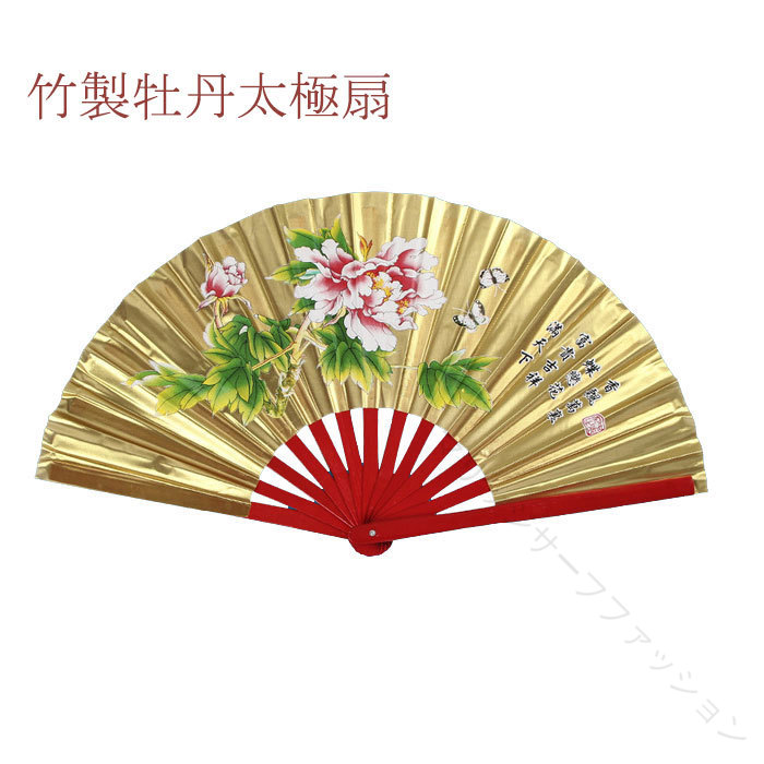 .太極扇 竹製 赤金 青黒地 牡丹 4色 右扇 は カンフー 太極拳 の 舞台 ステージ 演出 に 最適 です。団体 お揃い で 使用 できる 男女 兼用 の レッド ゴールド ブルー ブラック の 豊富 な カラー バリエーション を ご用意 し、伝統的 な デザイン と 実用性 を 両立 しています。。