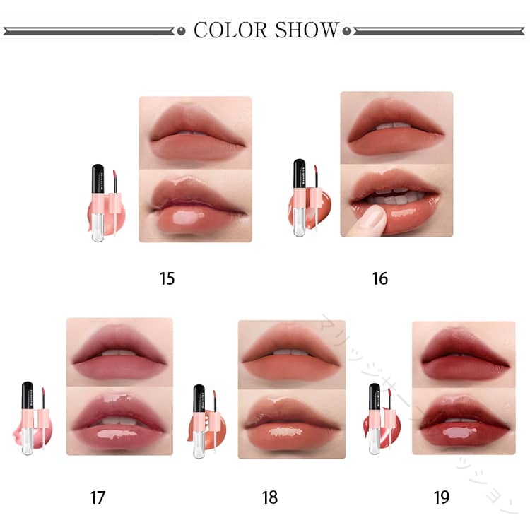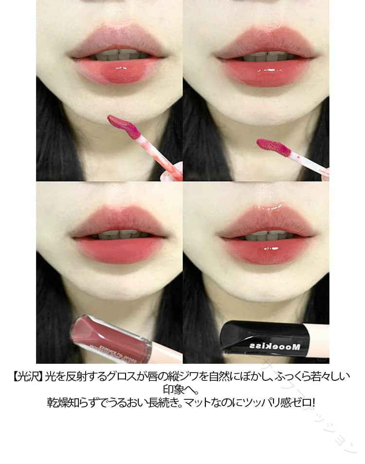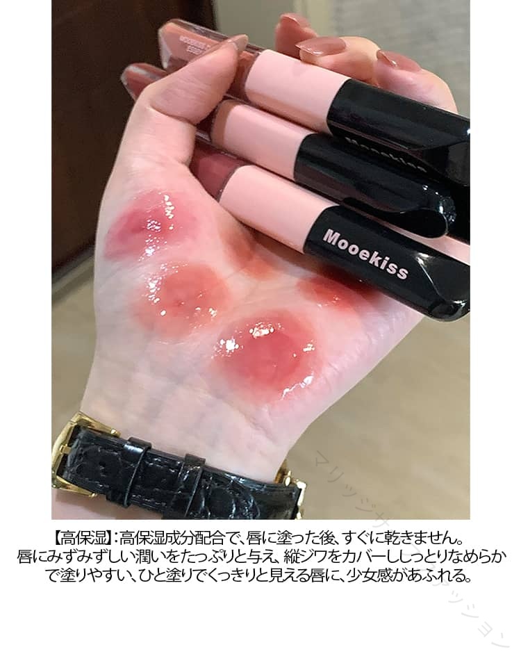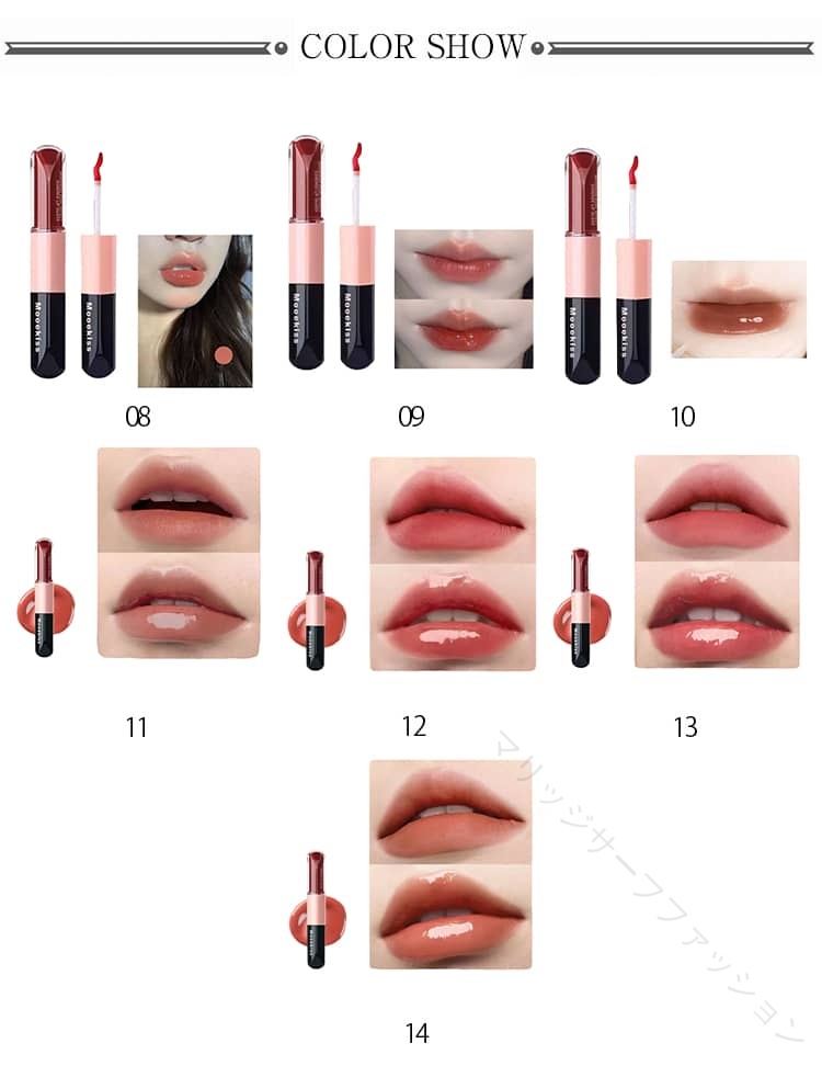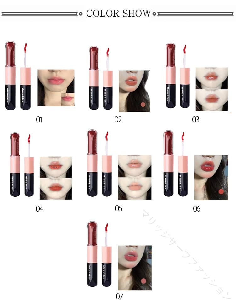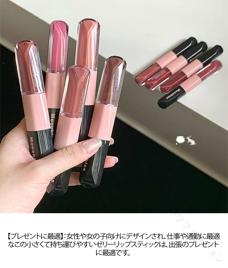 マット&グロスがこれ1本に!【全19色】【2in1リップ】 mooekissの新品、マットとグロスがこれ1本に。両端リップグロス、水感が軽く、透き通ってふっくらしていて、唇を優しく潤してくれます。さまざまな肌色やメイクスタイルに適している。【高保湿】:高保湿成分配合で、唇に塗った後、すぐに乾きません。唇にみずみずしい潤いをたっぷりと与え、 縦ジワをカバーししっとりなめらかで塗りやすい、ひと塗りでくっきりと見える唇に、少女感があふれる。【シリコンブラシ】 天然の植物抽出物が含まれており、刺激の強い添加物は含まれていません。フラット形状のシリコンアプリケーターが唇の輪郭までしっかりキャッチ。ムラなく、繊細に塗れるから、プロ級の仕上がりに。【光沢】 光を反射するグロスが唇の縦ジワを自然にぼかし、ふっくら若々しい印象へ。乾燥知らずでうるおい長続き。マットなのにツッパリ感ゼロ!【プレゼントに最適】:女性や女の子向けにデザインされ、仕事や通勤に最適なこの小さくて持ち運びやすいゼリーリップスティックは、出張のプレゼントに最適です。
