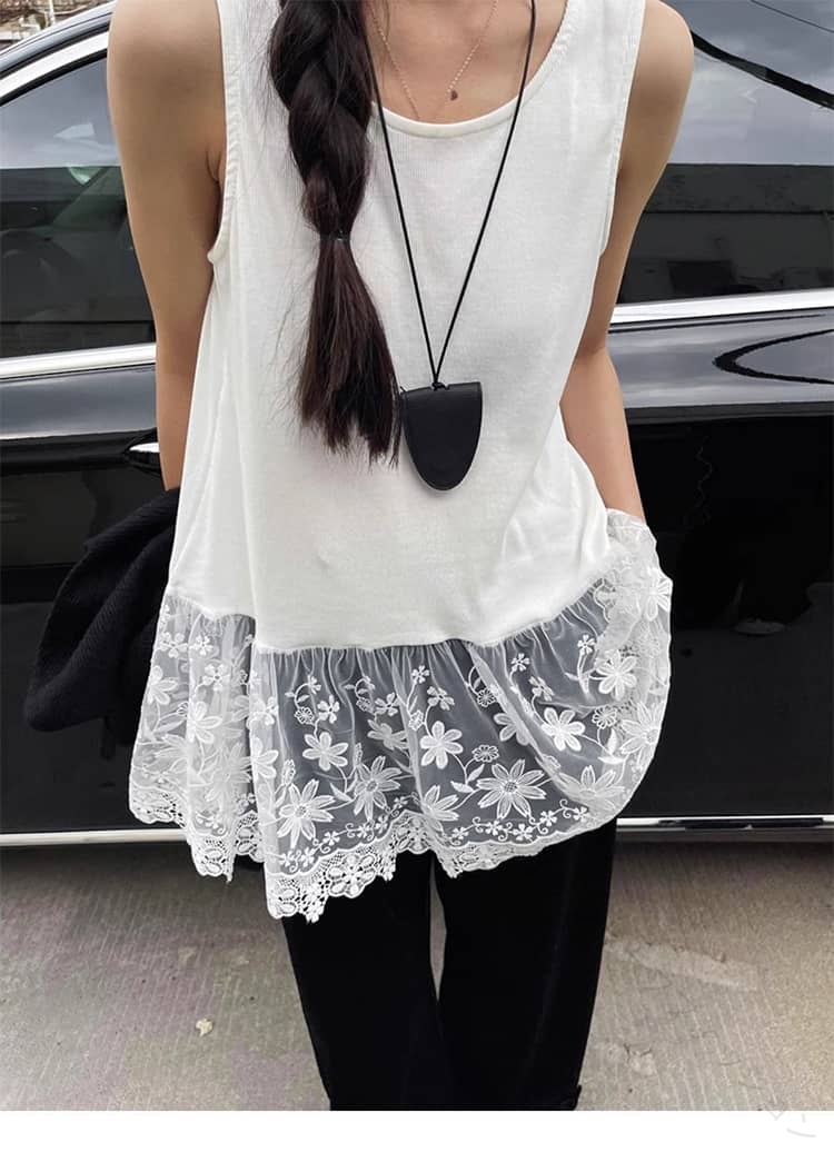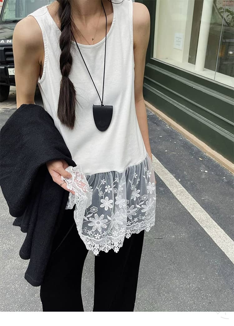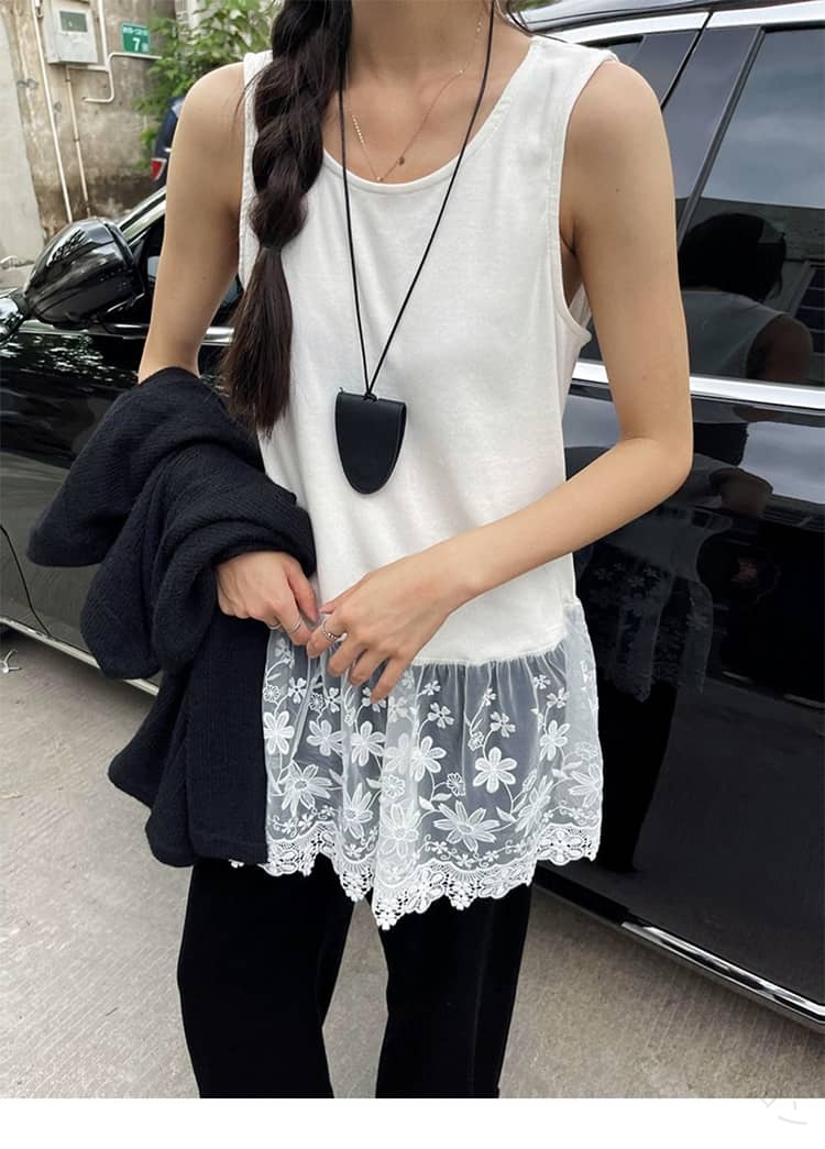 .裾レース キャミソール タンクトップ 付け裾 は スカラップレース の ロング ノースリーブ デザイン で レディース に最適 です。白 黒 の カラー展開 と 大きいサイズ もあり 春 夏 秋 冬 の 重ね着 や インナー として お尻が隠れる かわいい トップス として ロンt と レイヤード しやすい 仕様 です。。
