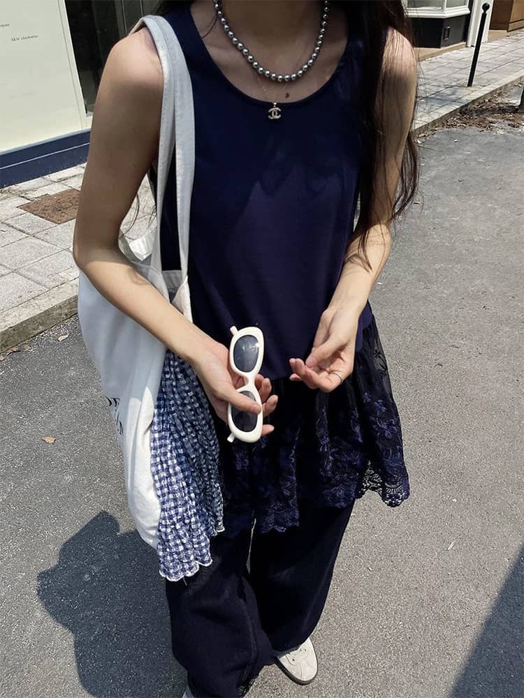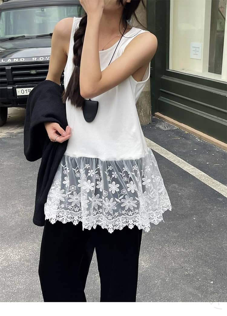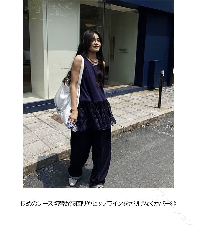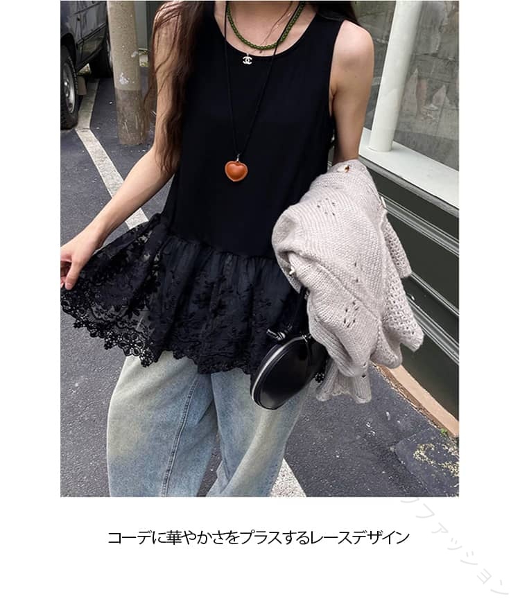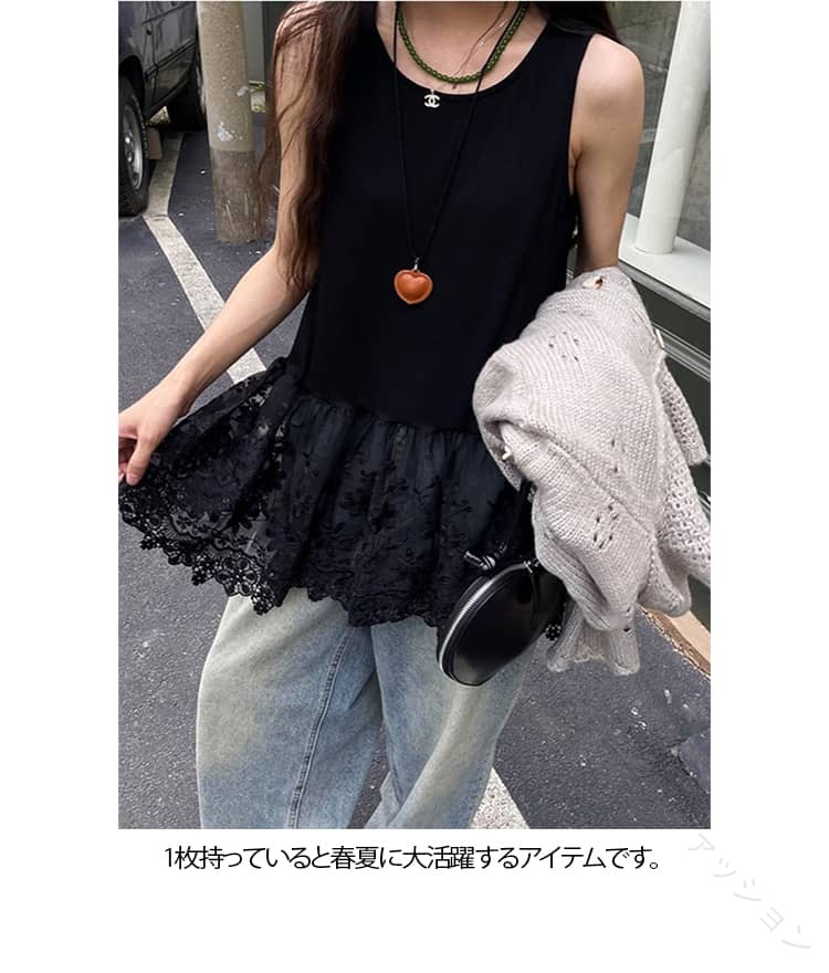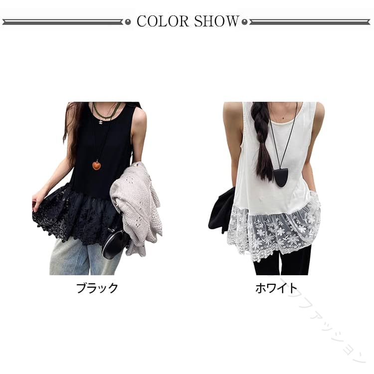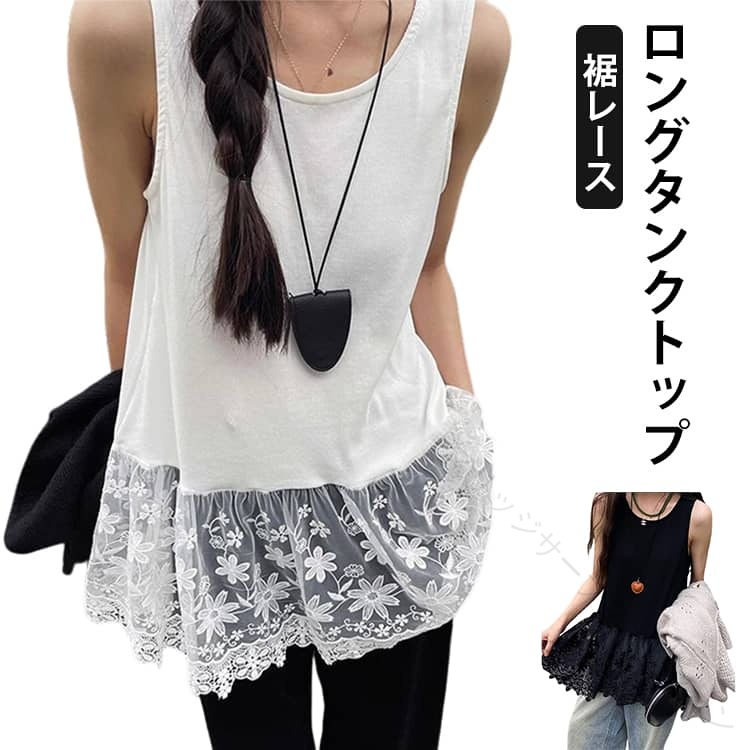 裾レース キャミソール タンクトップ 付け裾 スカラップレース ロング ノースリーブ レース切り替え レディース 白 黒 大きいサイズ 重ね着 インナー ロンt お尻が隠れる かわいい 夏 トップス