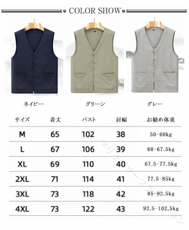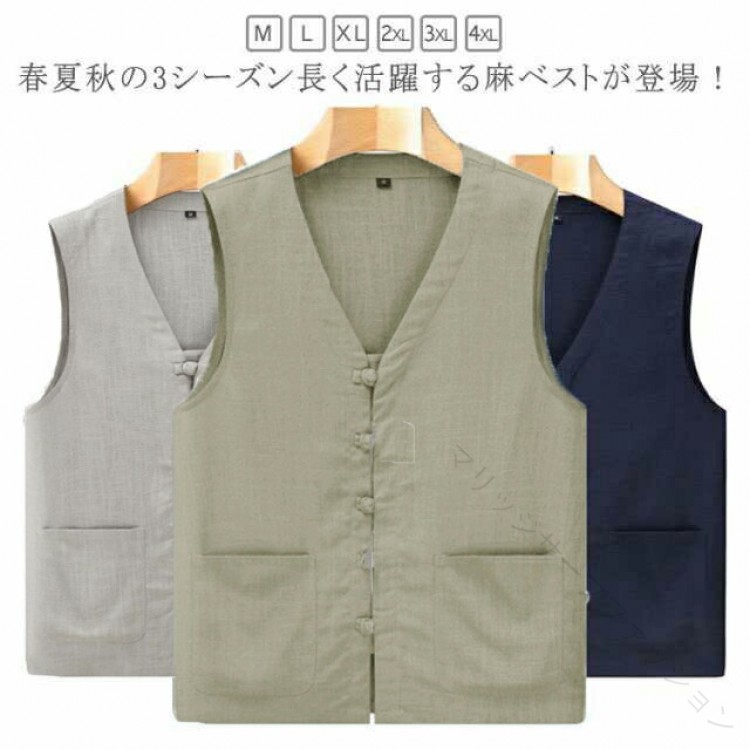 麻 ベスト メンズ ジレ サマーベスト メンズファッション 豊富 ネイビー グレー グリーン M L XL 2XL 3XL 4XL