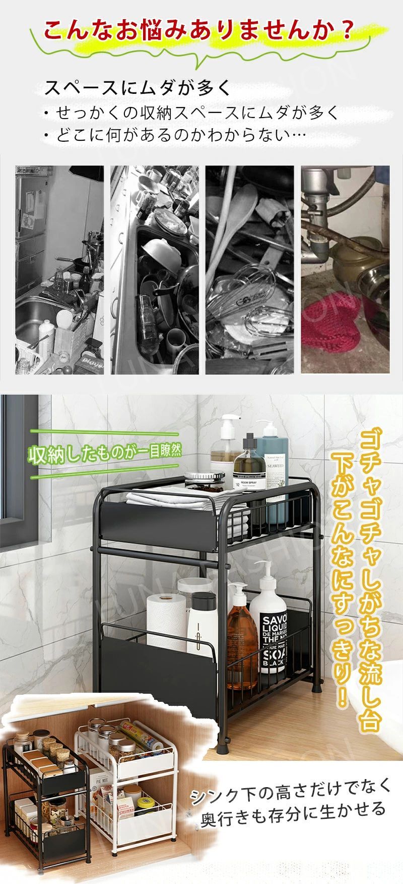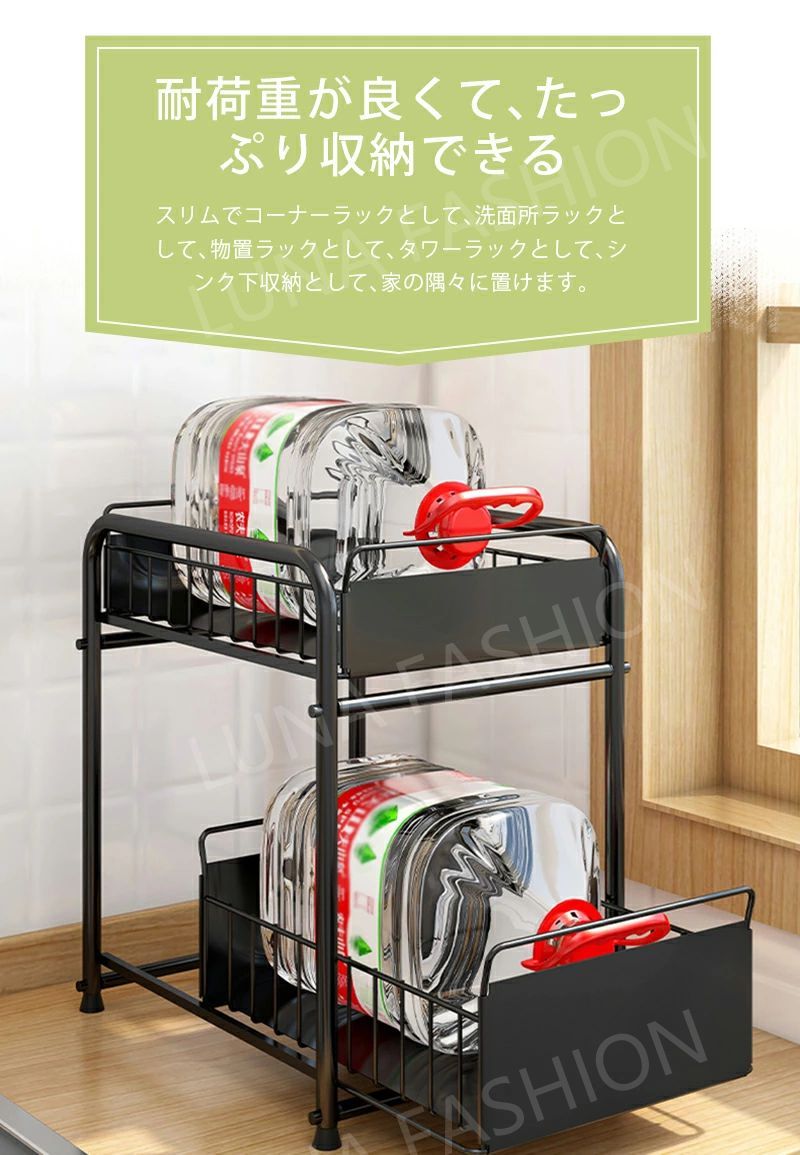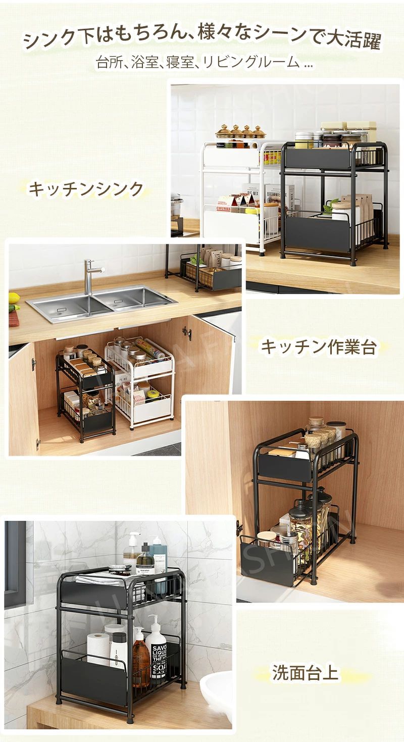 女性1人でも簡単に組み立てられるのシンク下収納ラック!スペースを有効活用し、かまど、シンク下、シンク上、戸棚、トイレや部屋など、さまざまな場所で活用できます。