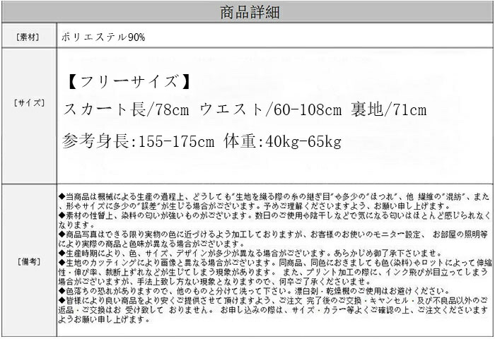 スカート長/78cm ウエスト/60-108cm 裏地/71cm