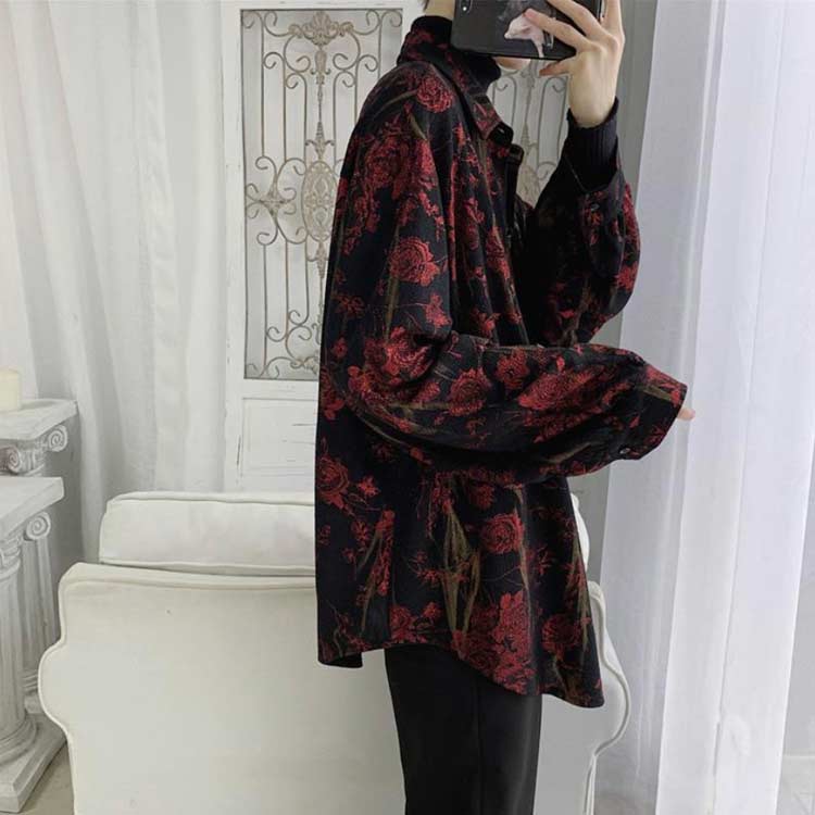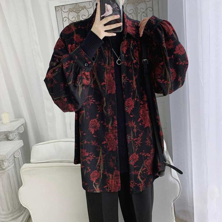 ゆったり カジュアルシャツ 地雷系 レトロ 花柄 開襟シャツ 南国風 長袖シャツ ブラウス 前開き 総柄 リゾートウェア 旅行 メンズアロハシャツ モード系 黒 花柄シャツ 普 韓国系
