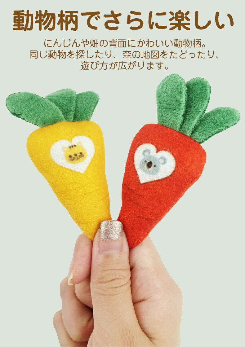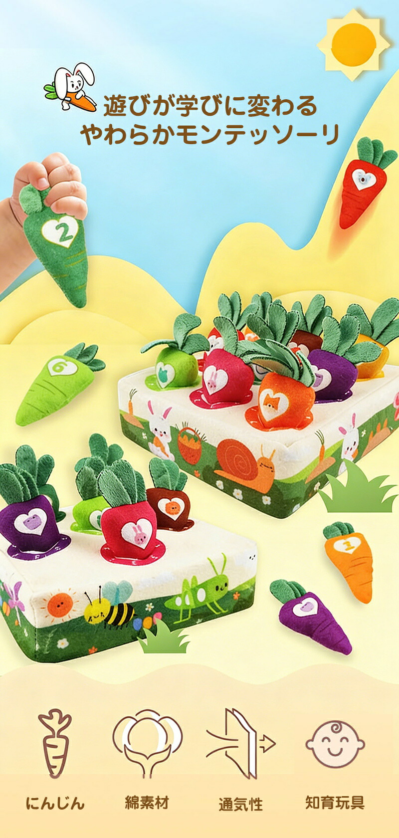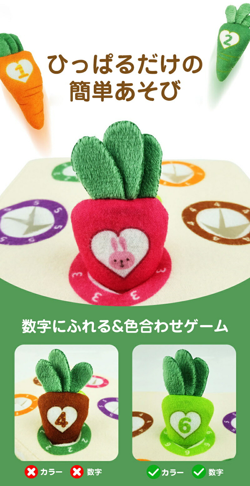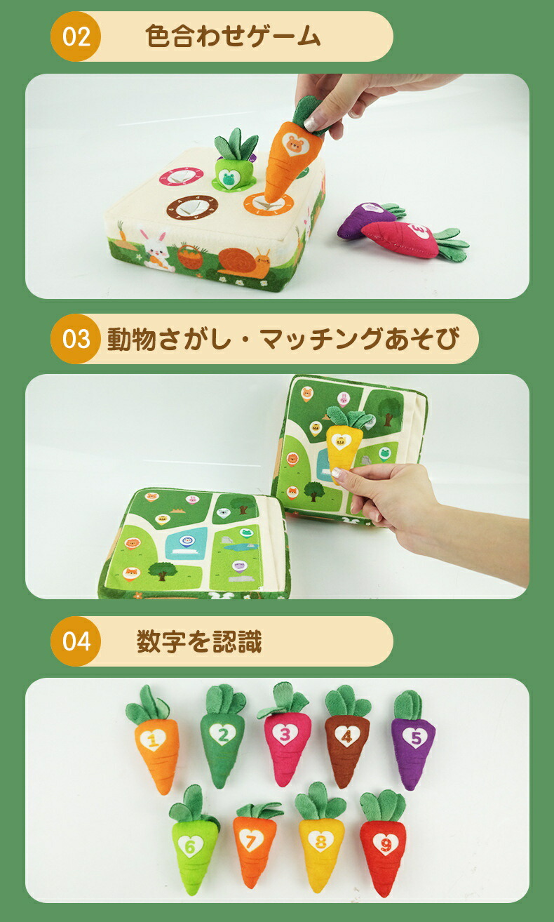 にんじんを抜くおもちゃ 布おもちゃ 赤ちゃん向け 0歳 1歳 2歳 3歳 カラフルな柄の畑 柔らかい布素材 にんじんに数字認識 森の地図付き 背面に動物柄を合わせる遊び 視覚 色合わせや動物柄のゲーム