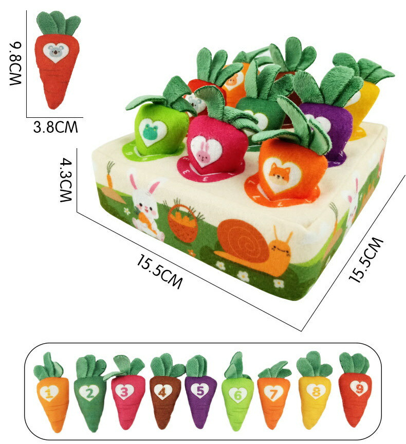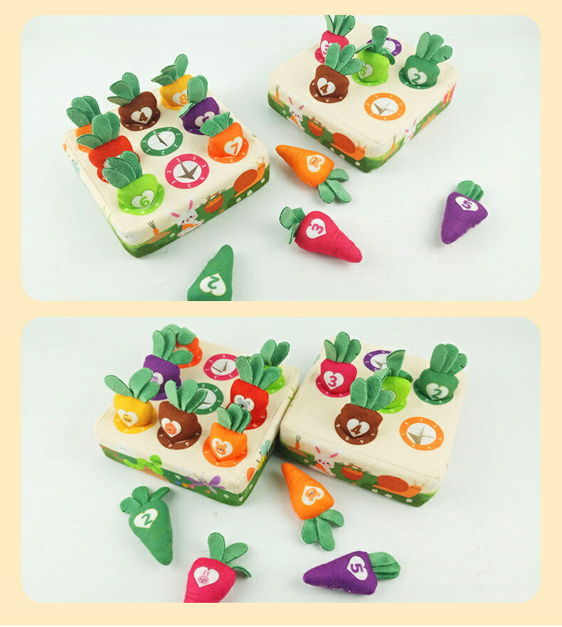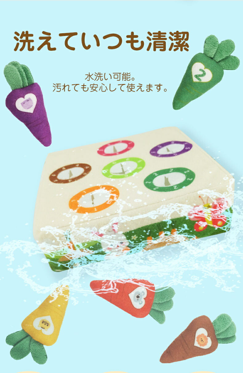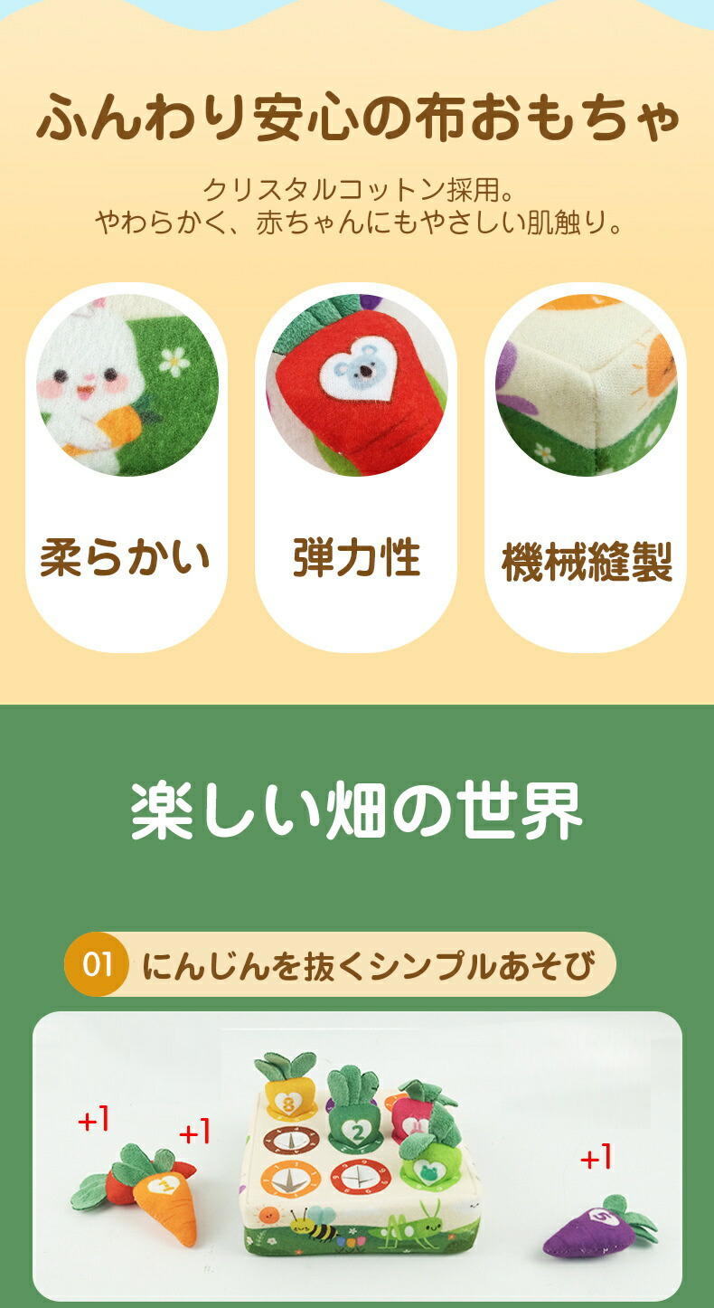 にんじんを抜くおもちゃ 布おもちゃ 赤ちゃん向け 0歳 1歳 2歳 3歳 カラフルな柄の畑 柔らかい布素材 にんじんに数字認識 森の地図付き 背面に動物柄を合わせる遊び 視覚 色合わせや動物柄のゲーム