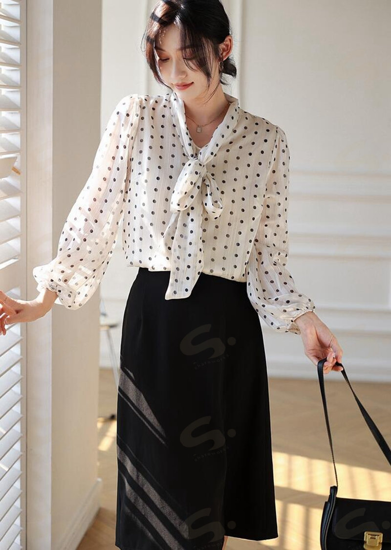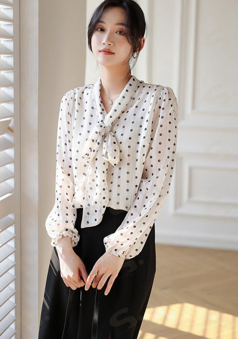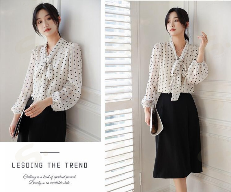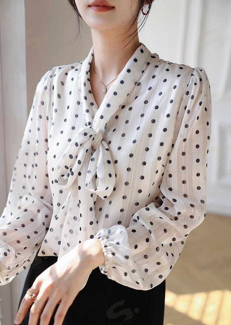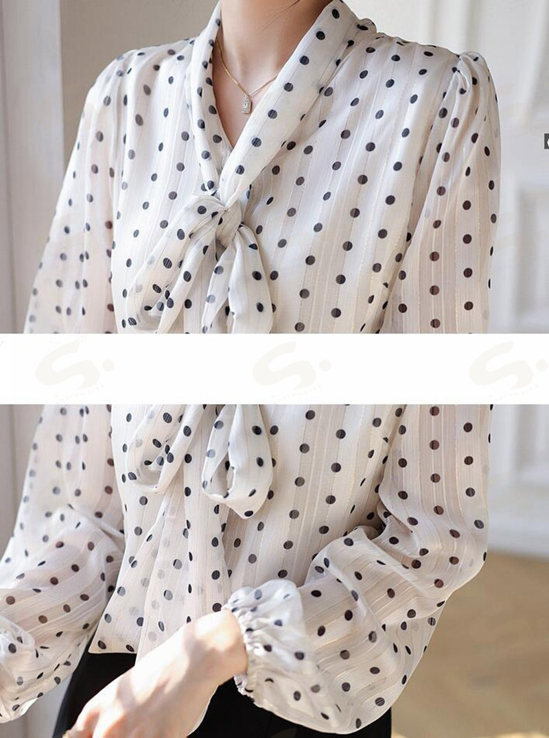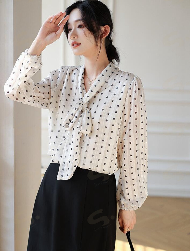 ブラウスレディース 春秋 長袖シャツ ボウタイシフォンブラウスドット水玉 Vネックフォマール通勤卒業式 卒園式 オフィス S M L2L 大きいサイズ