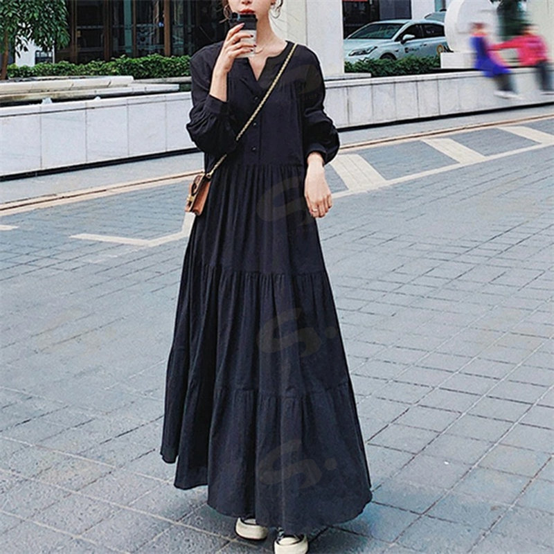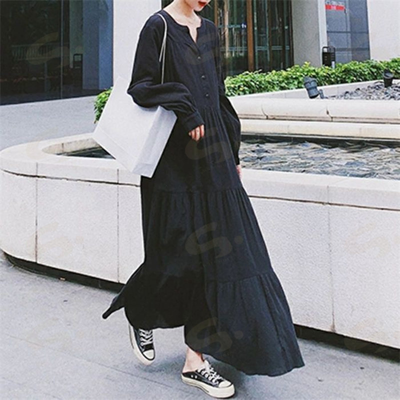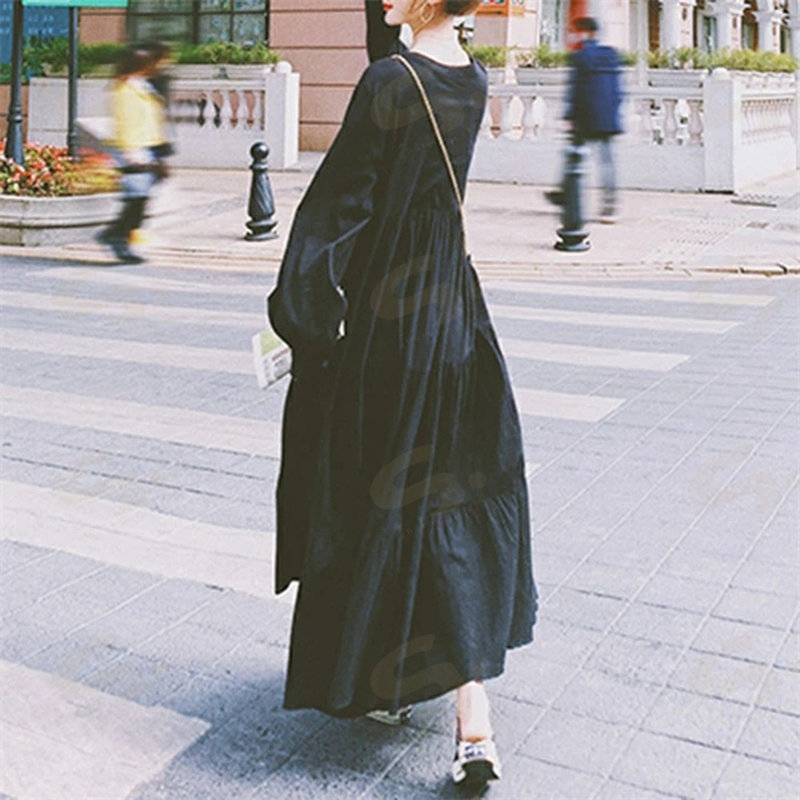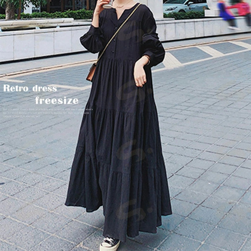 ワンピース ティアード レディース ロングワンピース ボリューム袖 長袖 ティアードワンピース ワンピ 黒 バルーン袖 ロング丈 無地 Aライン マキシ フレア ゆったり 着 せ カジュア 体型カバー