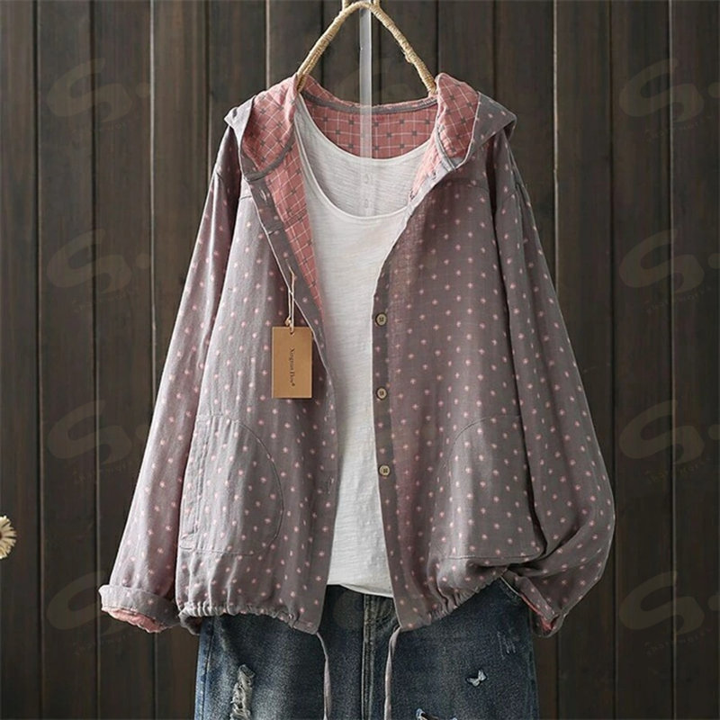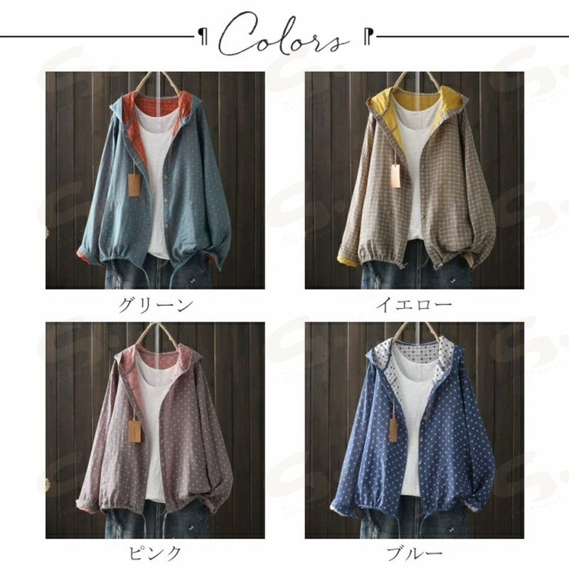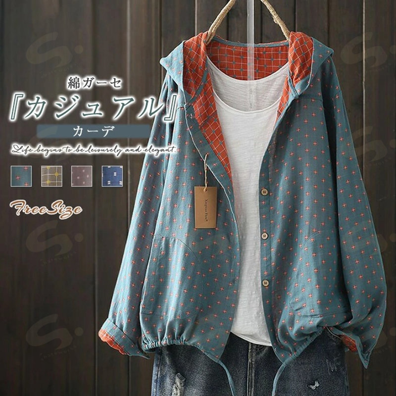 カーディガン ガーゼシャツ レディース 綿ガーゼ シャツ カーデ アウター 総柄 長袖 フード付き 薄手 ライトアウター 羽織 ポケット 柔らかい 上品 トップス オフィス シンプル カジ フォーマル