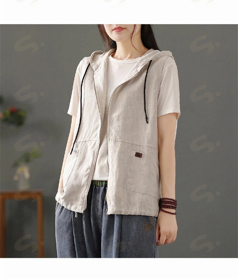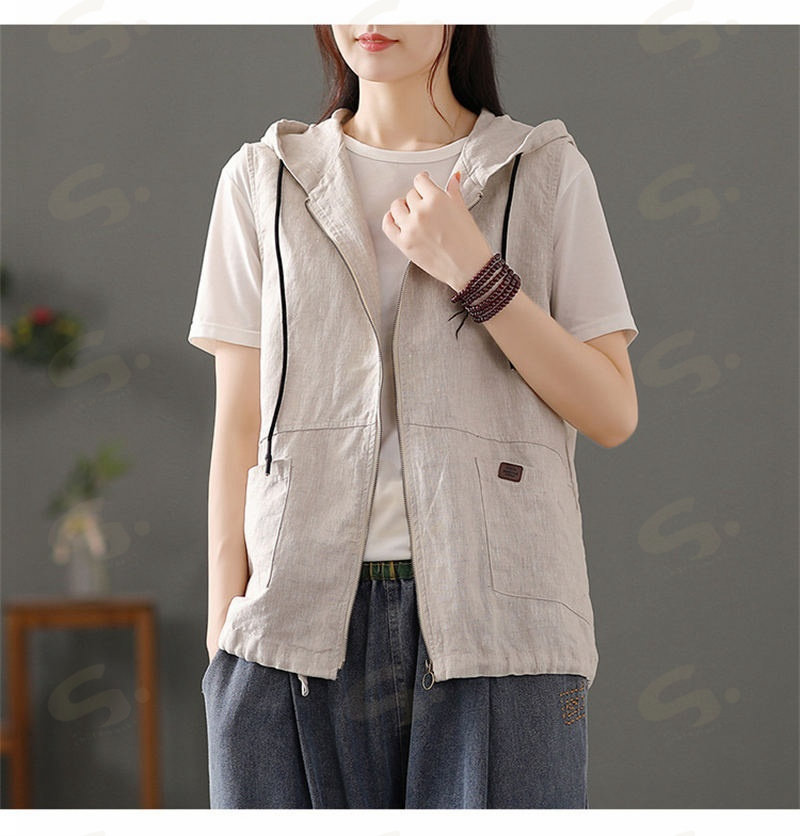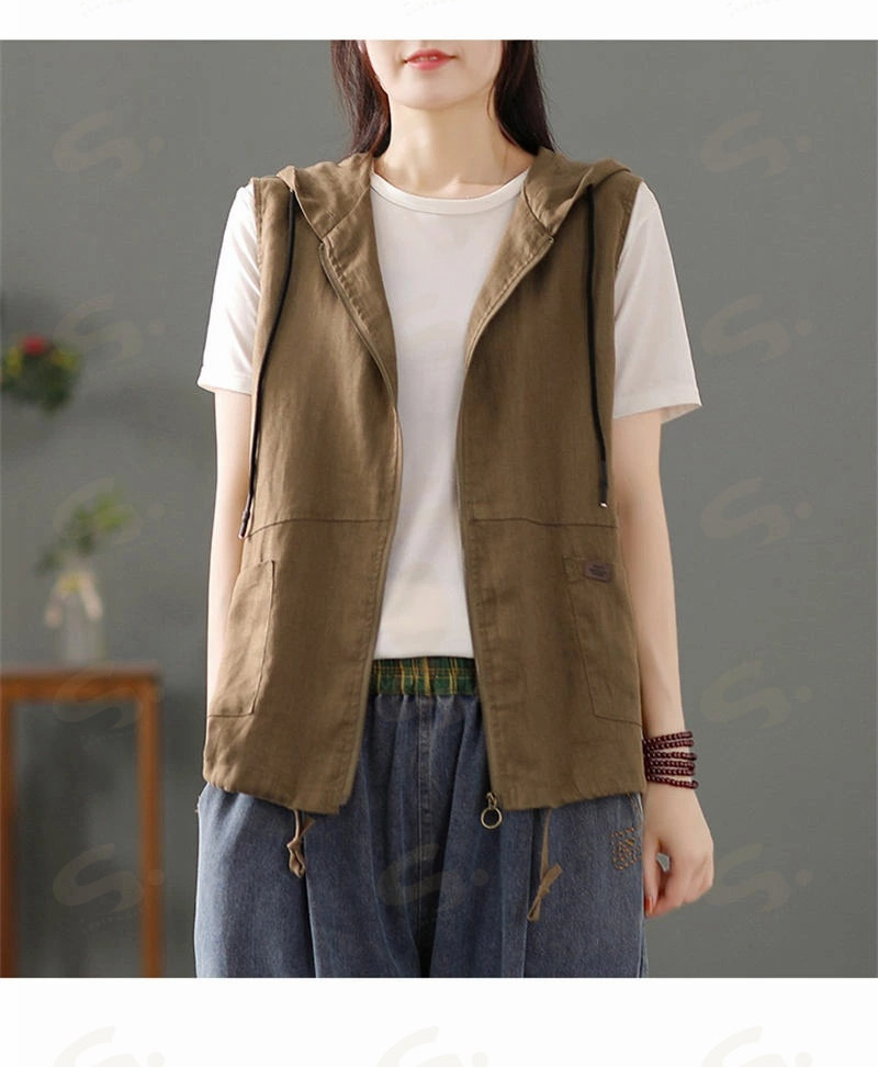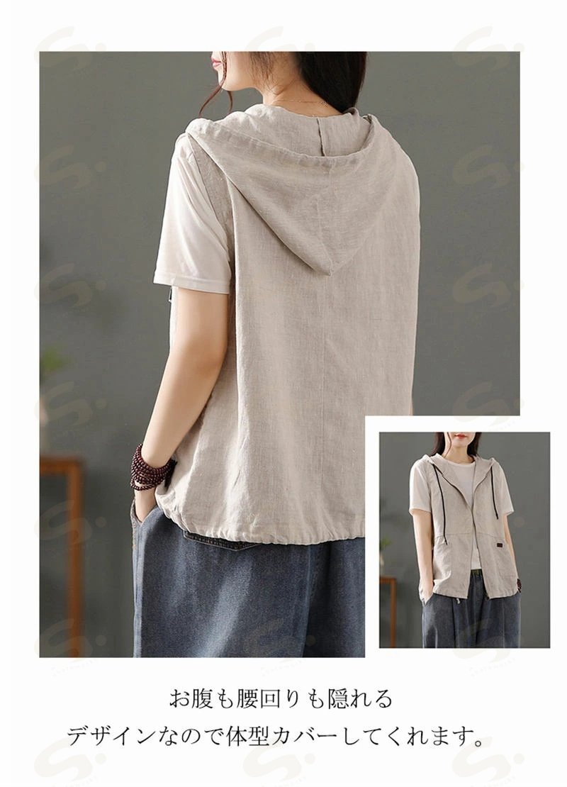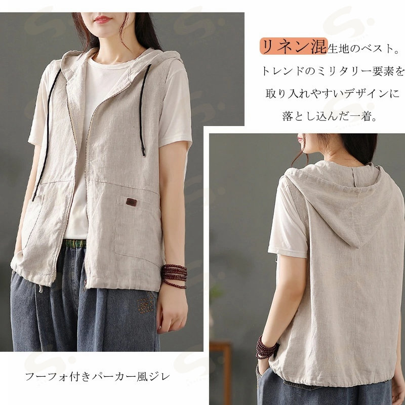 ベスト ジレ レディース 綿麻 リネンベスト 春 トップス アウター ノースリーブ トレンチベスト ジレンチ コート レイヤード 前開き 無地 羽織り 綿麻風 ライトアウター ショート丈 フード 羽織
