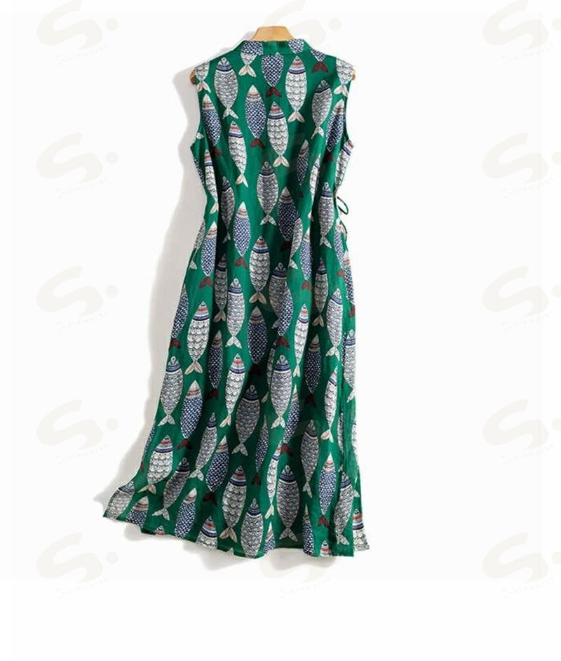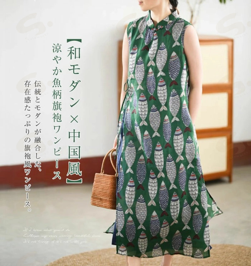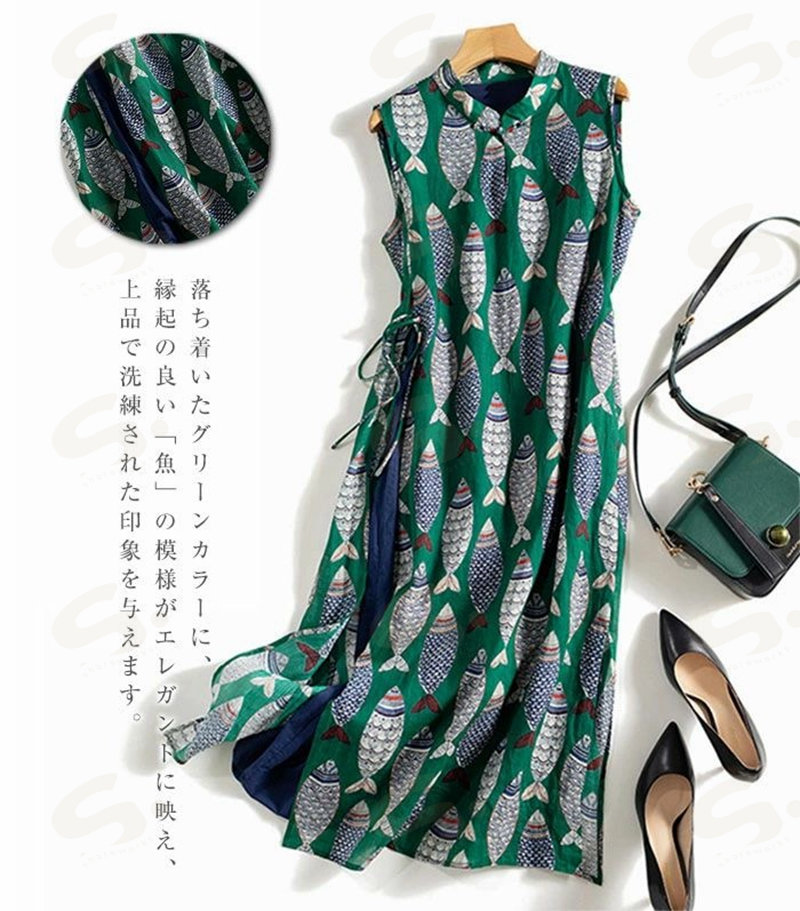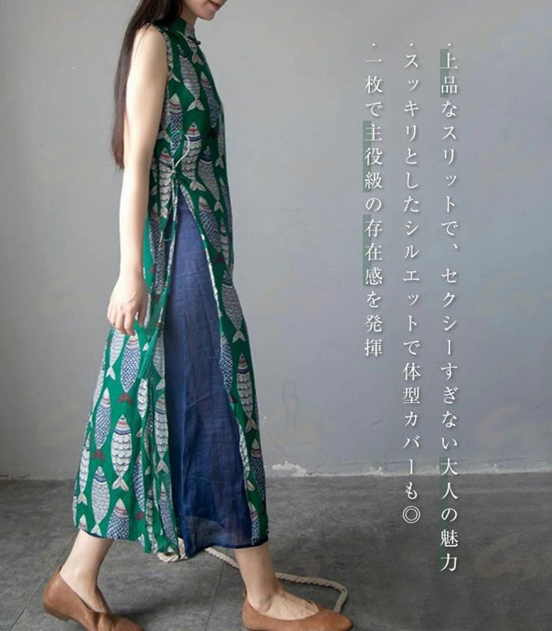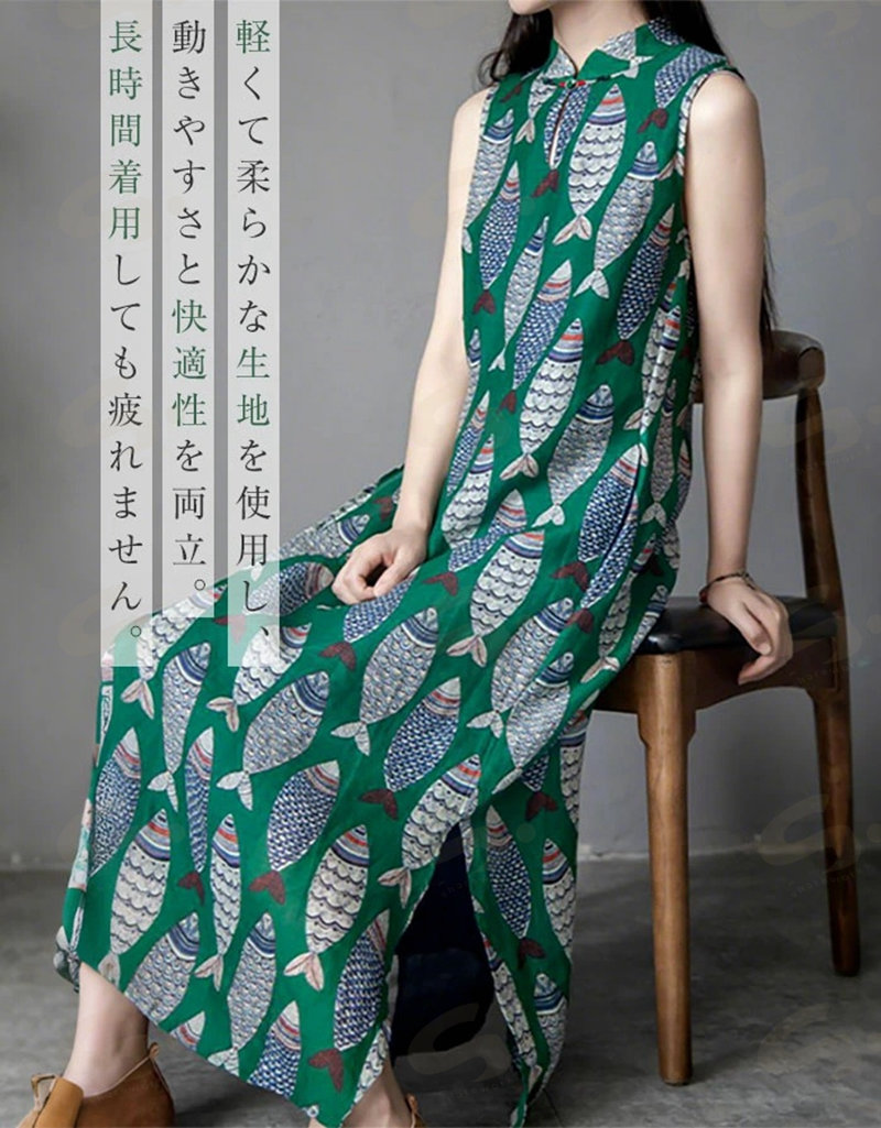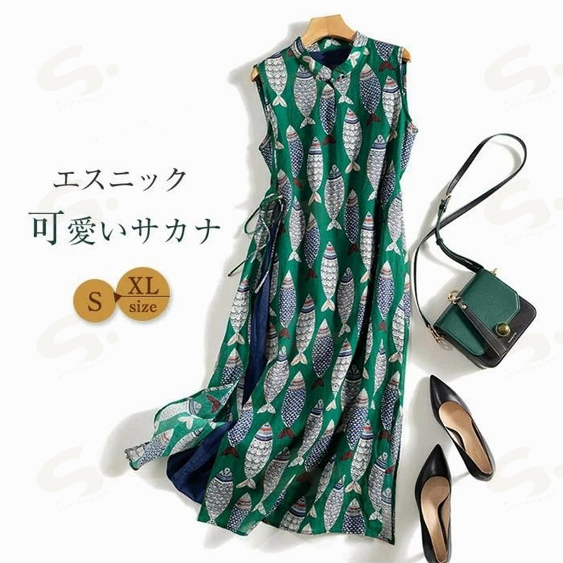 ワンピース ノースリーブ ロング レディース 吊りスカート プリント 魚 エスニック Aライン 涼しい 薄手 ロング丈 体型カバー ゆったり シンプル 立ち襟 可愛い オシャレ 20代 夏