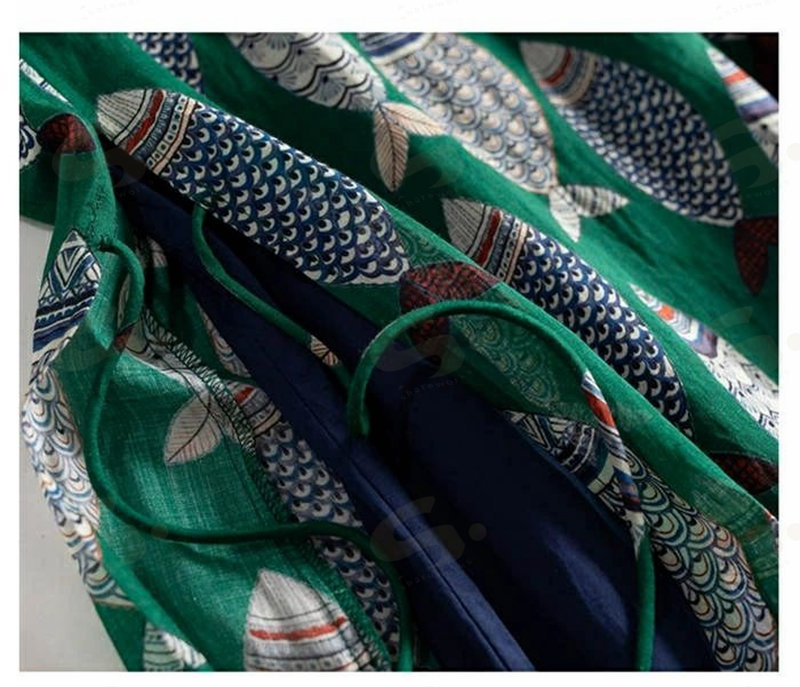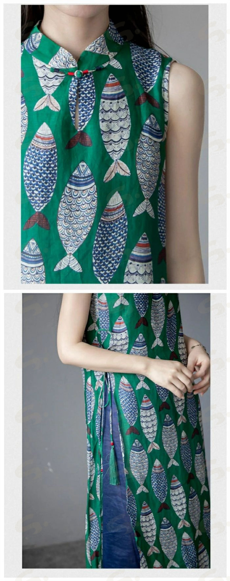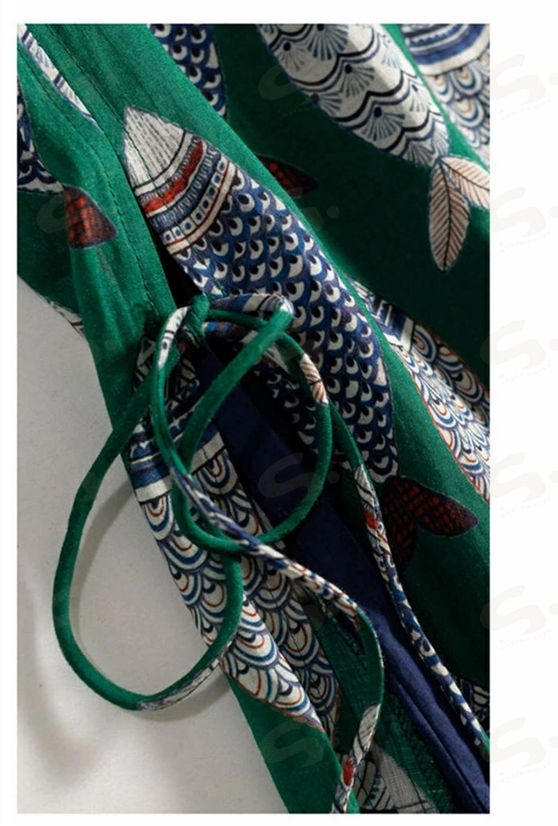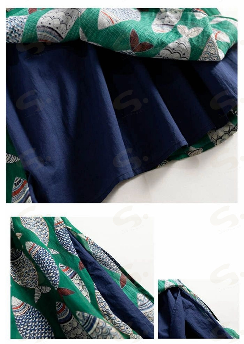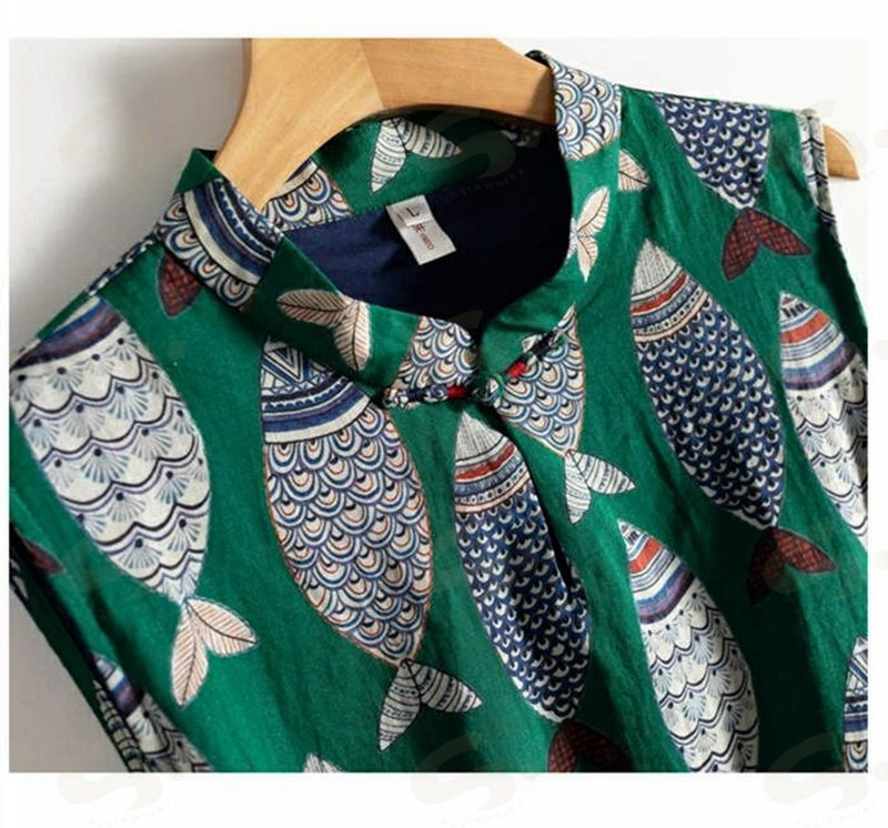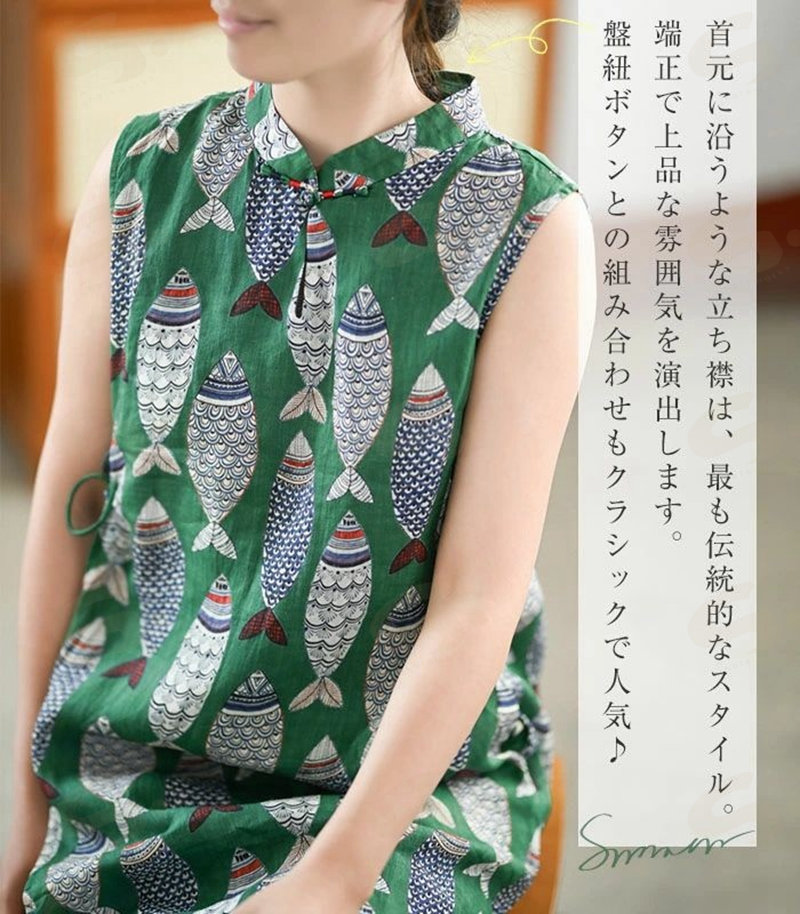 ワンピース ノースリーブ ロング レディース 吊りスカート プリント 魚 エスニック Aライン 涼しい 薄手 ロング丈 体型カバー ゆったり シンプル 立ち襟 可愛い オシャレ 20代 夏
