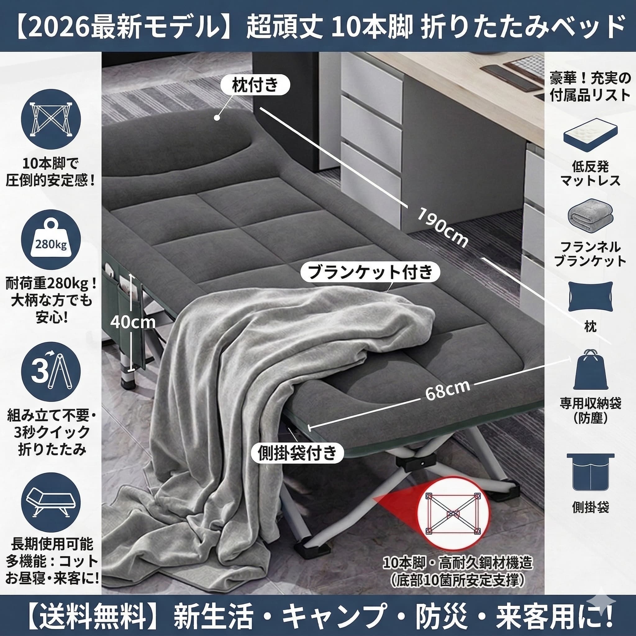 2026最新モデル 折りたたみベッド シングル 10本脚 簡易ベッド 耐荷重280kg 組み立て不要 マットレス付き コット 昼寝 キャンプ オフィス 庭 来客用 介護 頑丈 持ち運び 収納袋付 防災