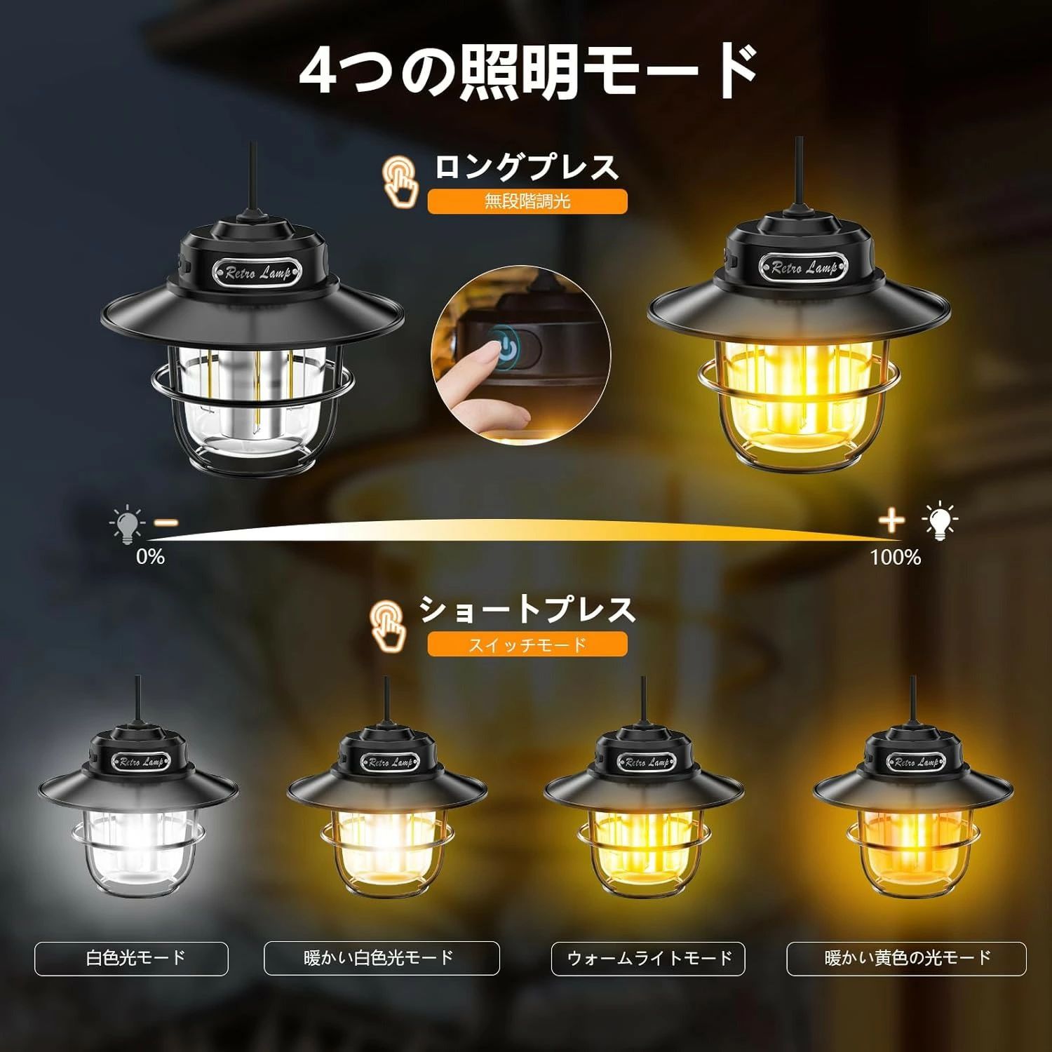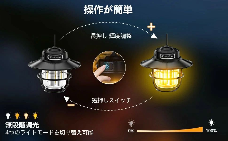 【無段階調光】このレトロなテント用キャンプライトには4つの照明モード (ウォームライト、ホワイトライト、ウォームイエローライト、ウォームホワイトライト) があり、あらゆる場面で完璧な雰囲気を作り出します。 無段階調光機能により、特定のニーズに合わせて簡単に明るさを調整できます。