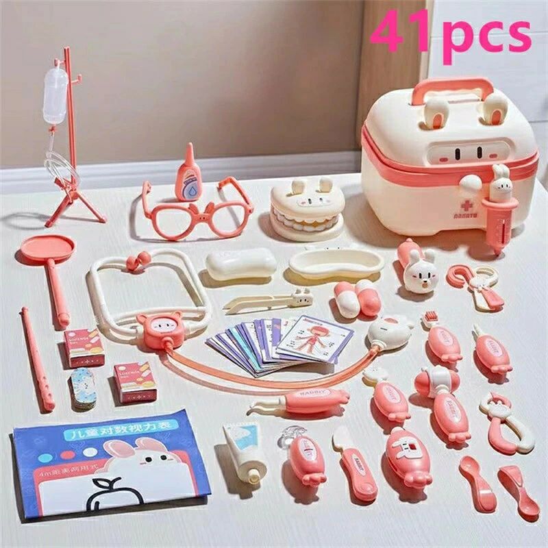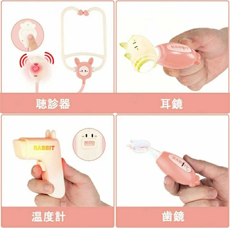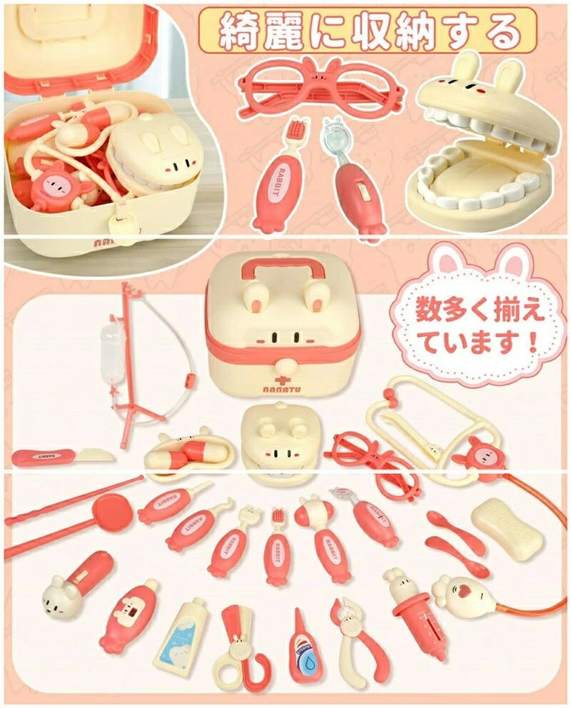注射器、血圧計、温度計、聴診器、耳鏡、口腔鏡、メガネ、点滴などがある41点/48点/のお医者セットです。可愛いウサギな医療箱に 医療道具などがたくさん入っていて、収納も便利です。聴診器などの内科、外科道具だけでなく歯医者さんの道具があるのでお医者さんごっこが大好きな子供はきっと喜びしてくれますよ。
