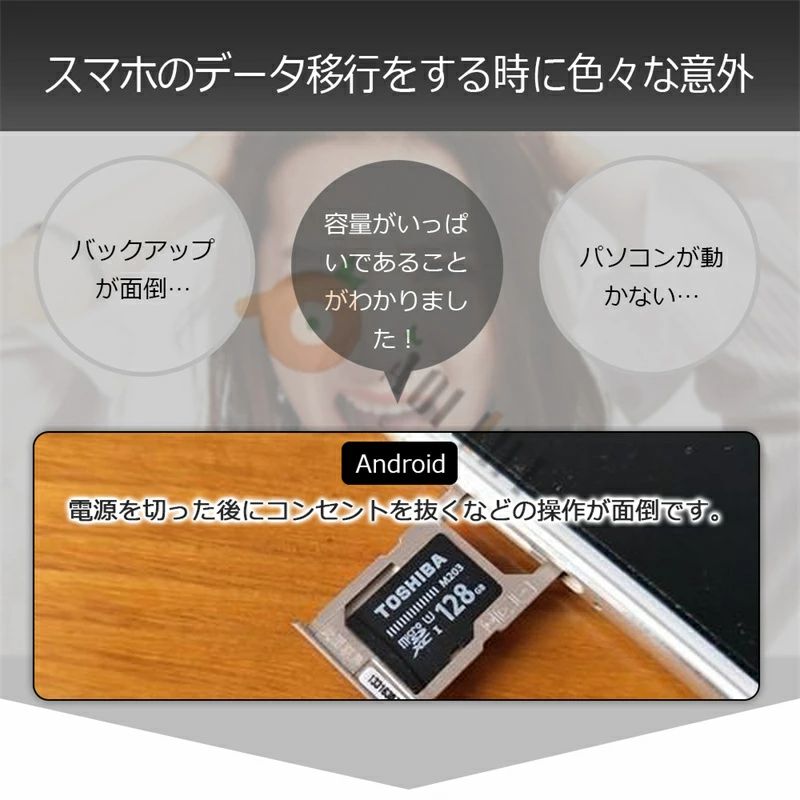 スマホの容量不足、ストレージ対策に SDカードリーダーがあれば簡単にSDカードや PCにデータ移動ができる PC、タブレット、スマホデータの転送 ほぼ全てのデバイスがOK 作業の効率化が上がる スマホからスマホへのデータ転送 クラウドやメール、ライン等の 通信制限の心配もなし WiFiも必要なし 各種フォト使用有料化に伴う代替えに ほぼ各種機材で撮った写真や動画を、スマホやタブレットで視聴できます。 最大1TB対応、大切な思い出をSDカードで保存できます。