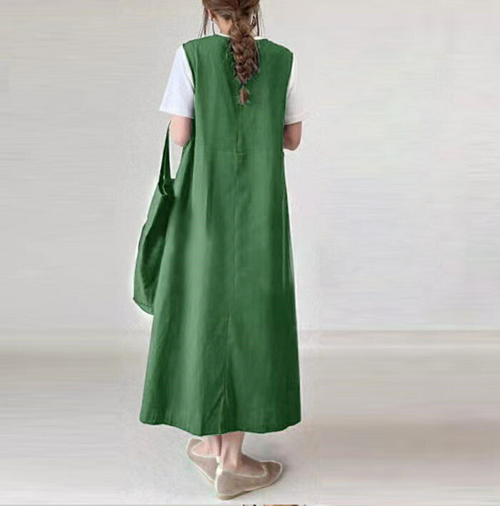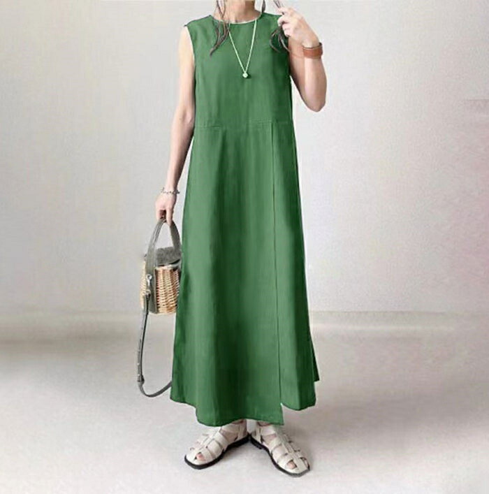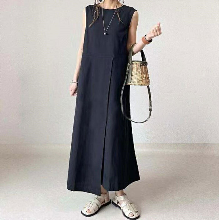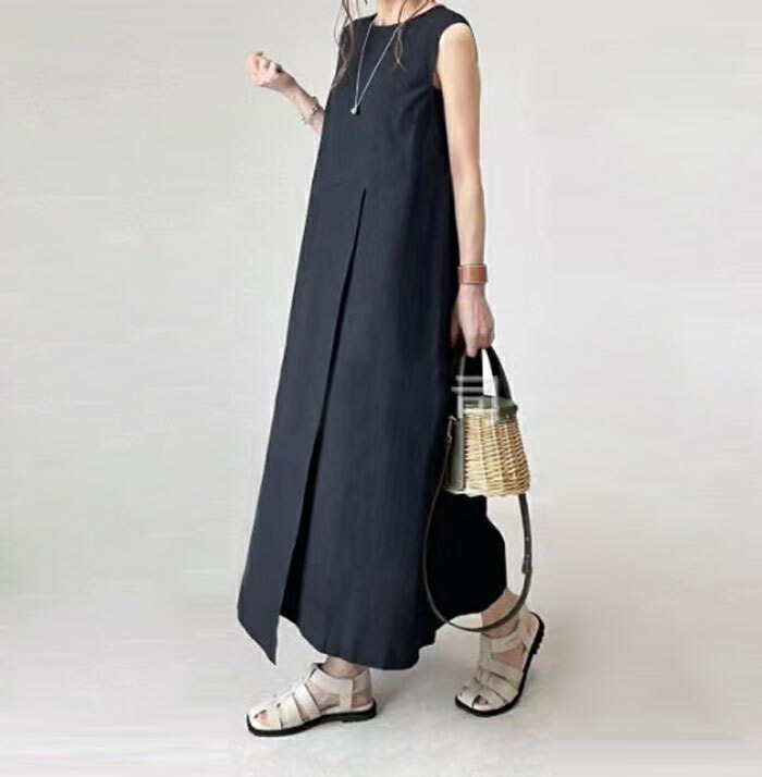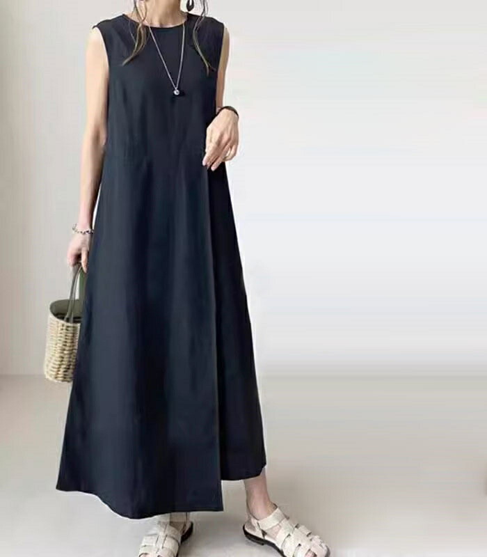 ワンピース 夏 ノースリーブ きれいめ ロング レディース リネン風 二の腕カバー 体型カバー 50代 40代 30代 お洒落 可愛い リネン風ノースリーブワンピース ロングワンピース aライン 黒