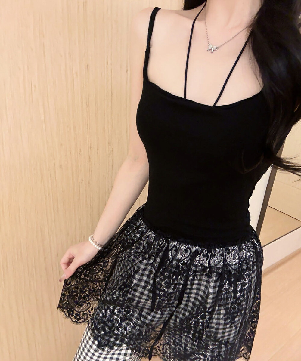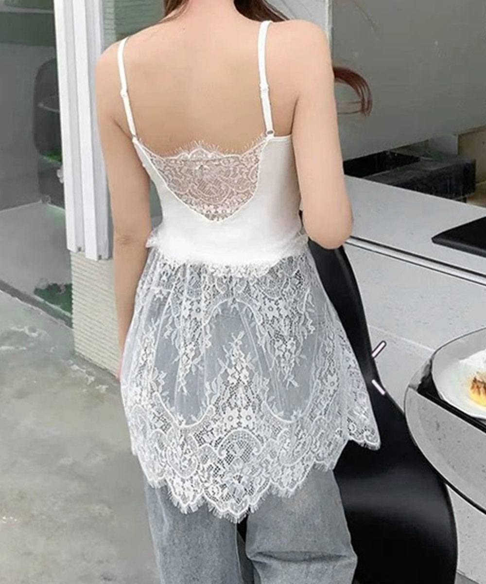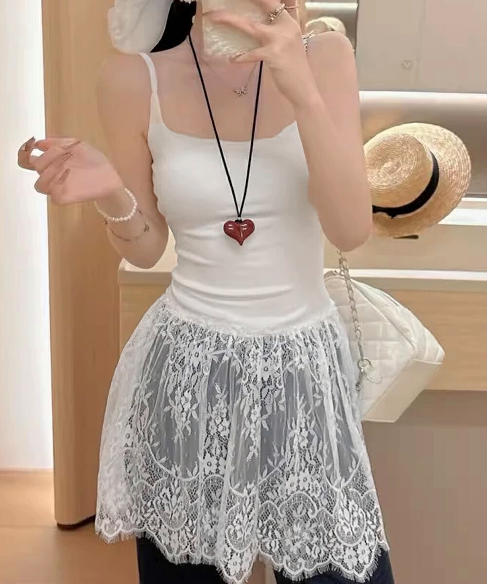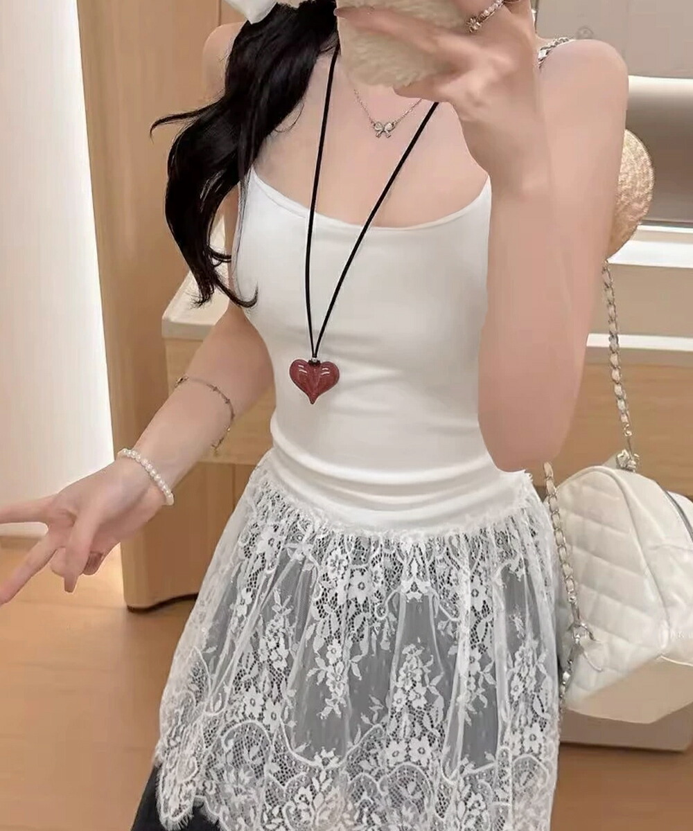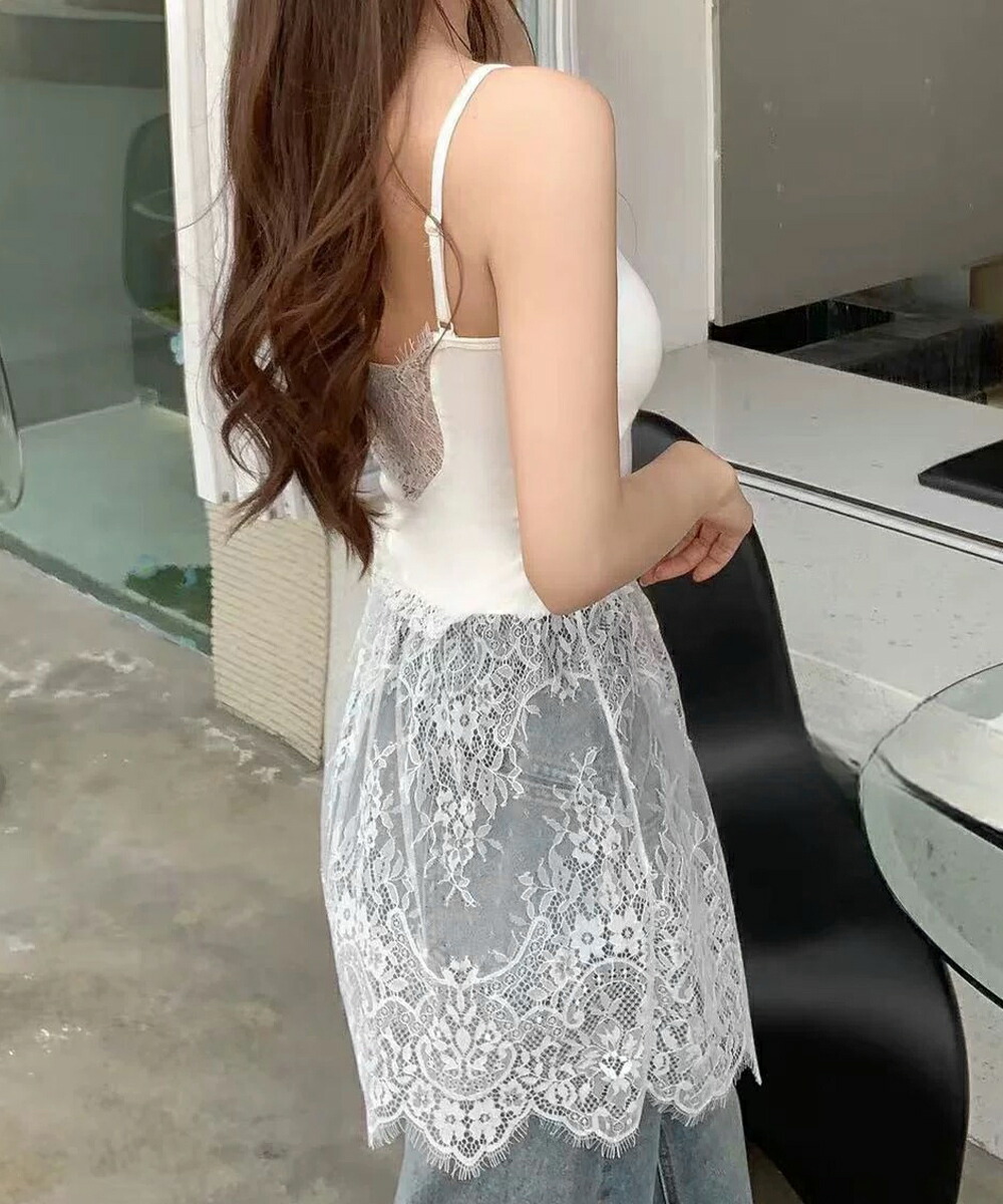 大人可愛い スカラップレースロングキャミ 肩紐調節可能インナーキャミソール 重ね着美背美胸 見せインナーレイヤードコーデ韓国っぽいムードが漂う、背中開きレースドッキングキャミソール。
