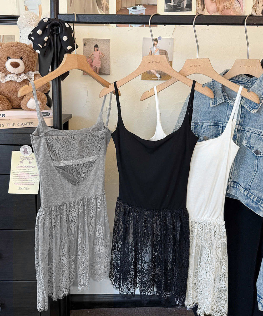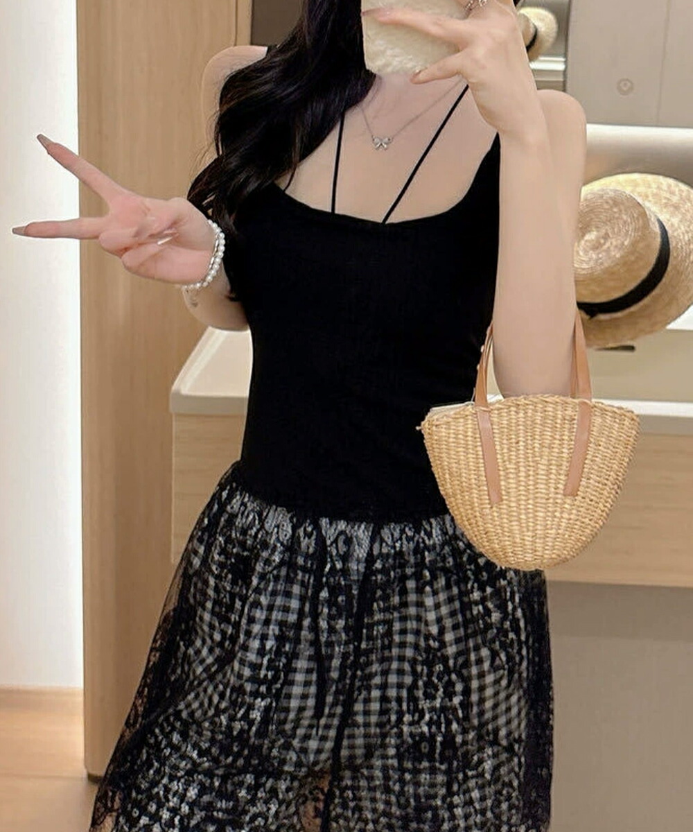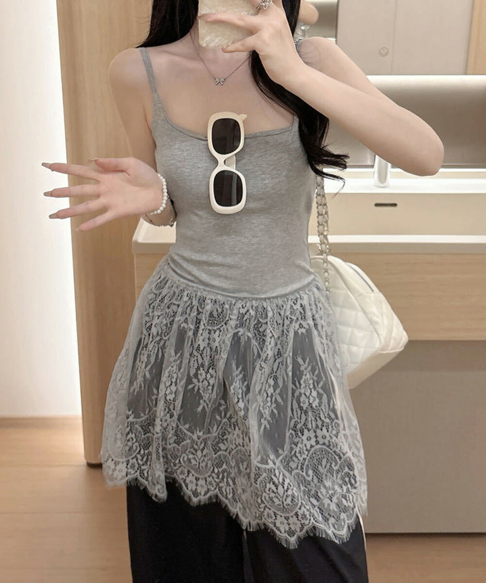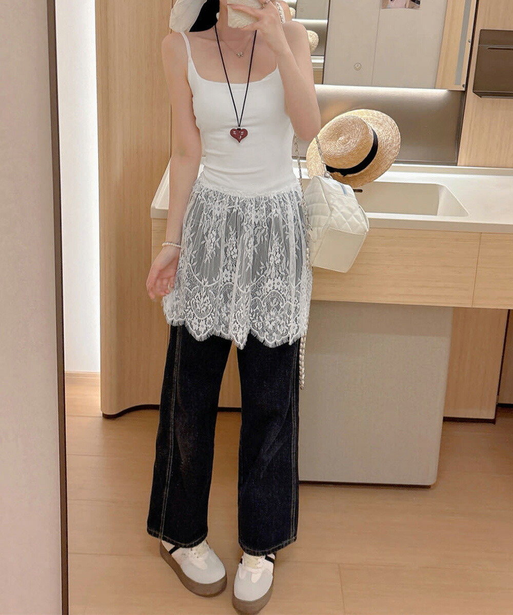 大人可愛い スカラップレースロングキャミ 肩紐調節可能インナーキャミソール 重ね着美背美胸 見せインナーレイヤードコーデ韓国っぽいムードが漂う、背中開きレースドッキングキャミソール。