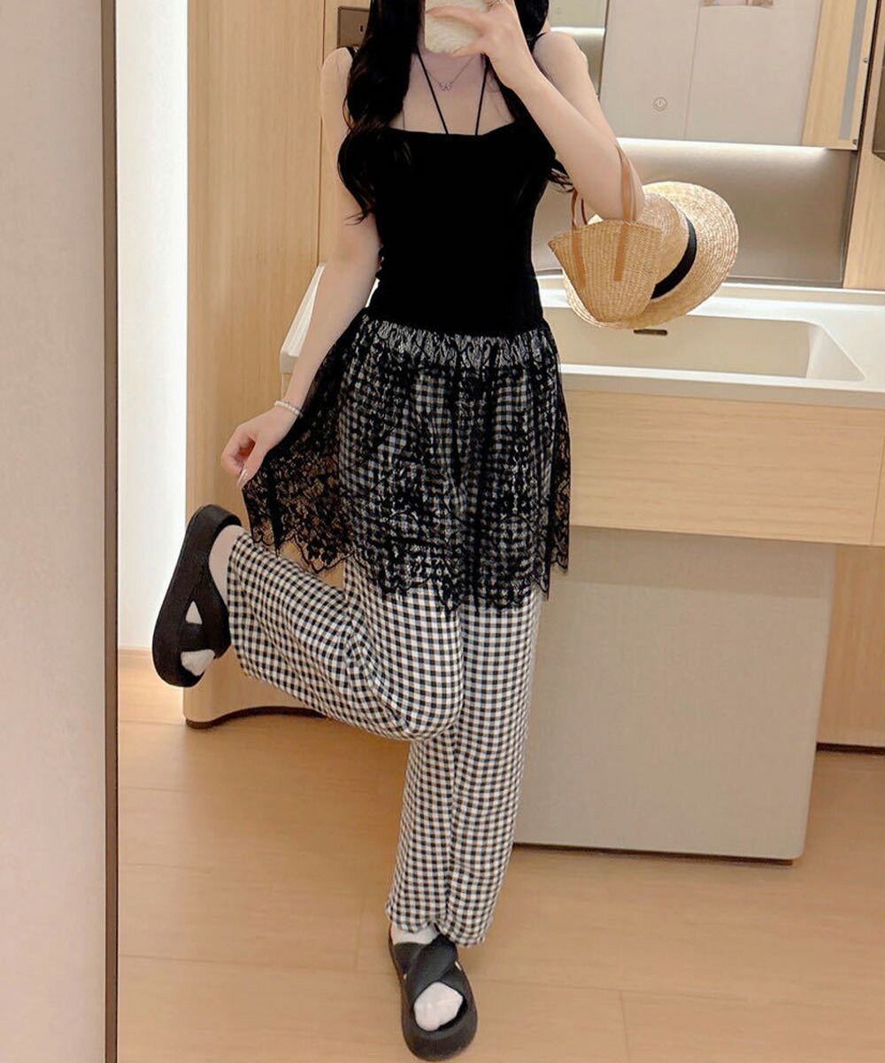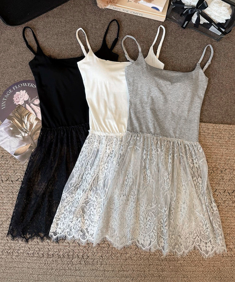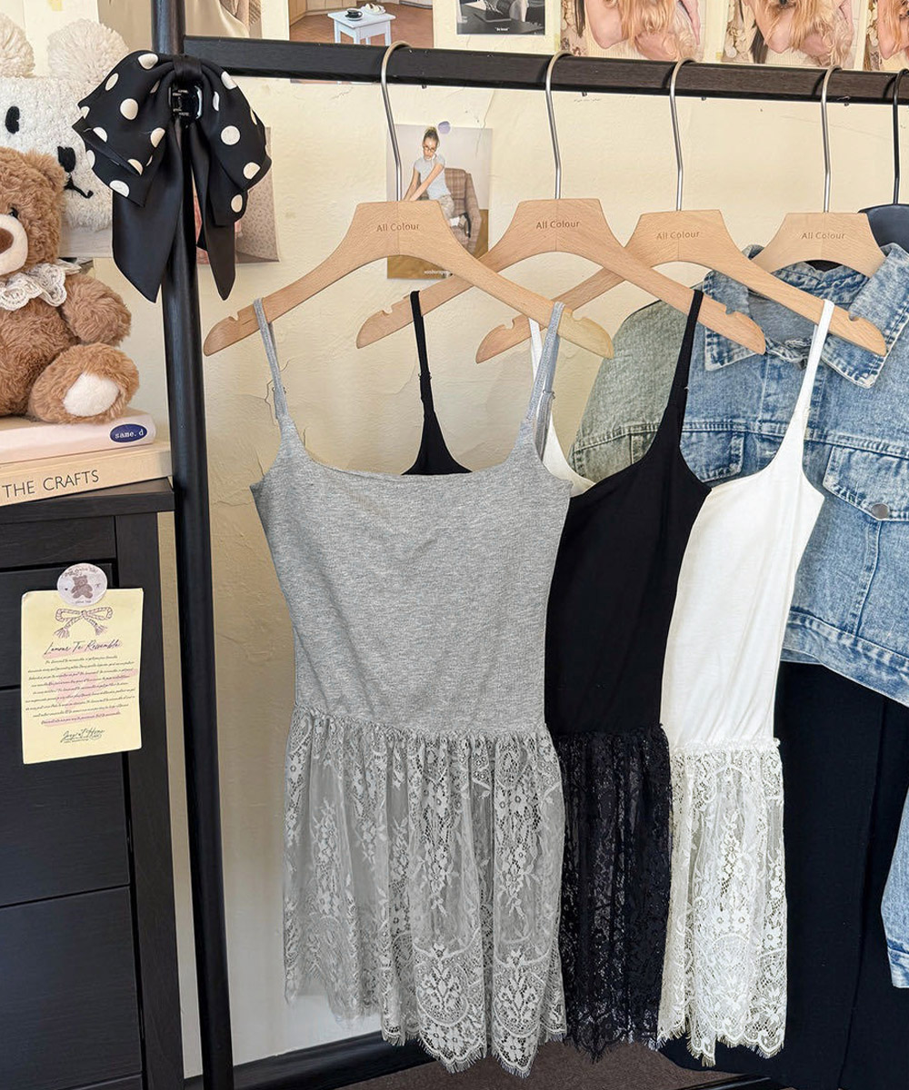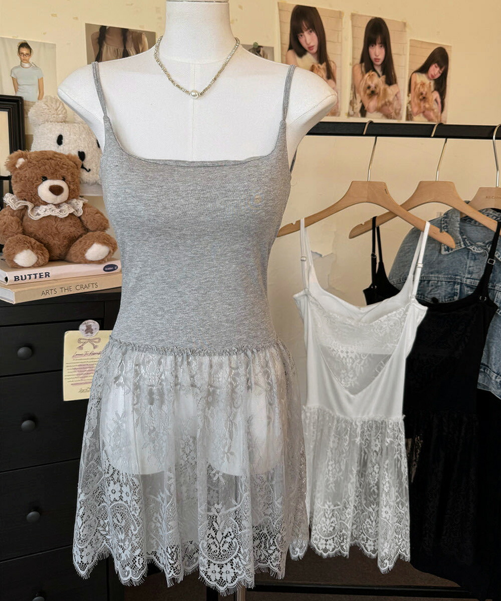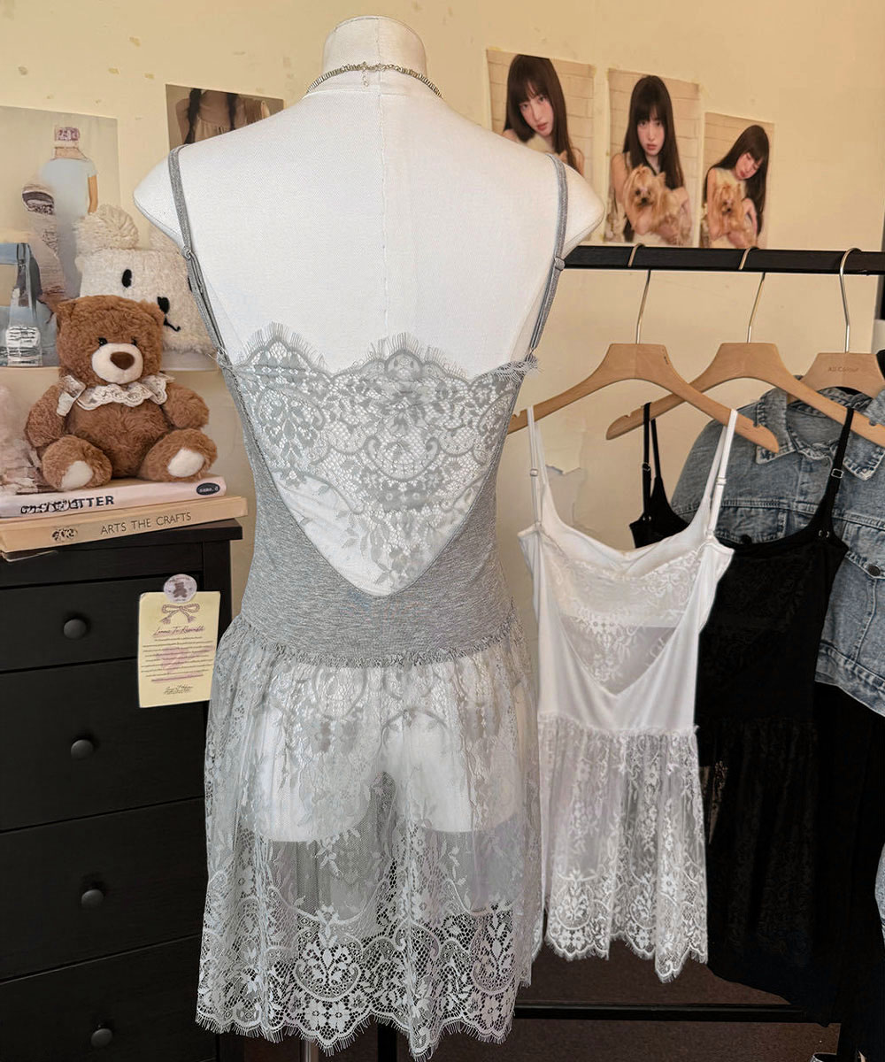 大人可愛い スカラップレースロングキャミ 肩紐調節可能インナーキャミソール 重ね着美背美胸 見せインナーレイヤードコーデ韓国っぽいムードが漂う、背中開きレースドッキングキャミソール。