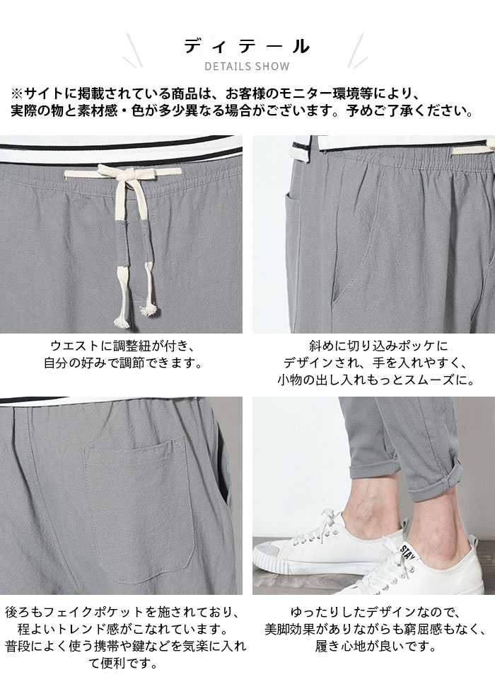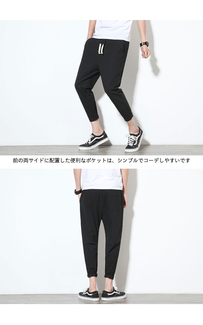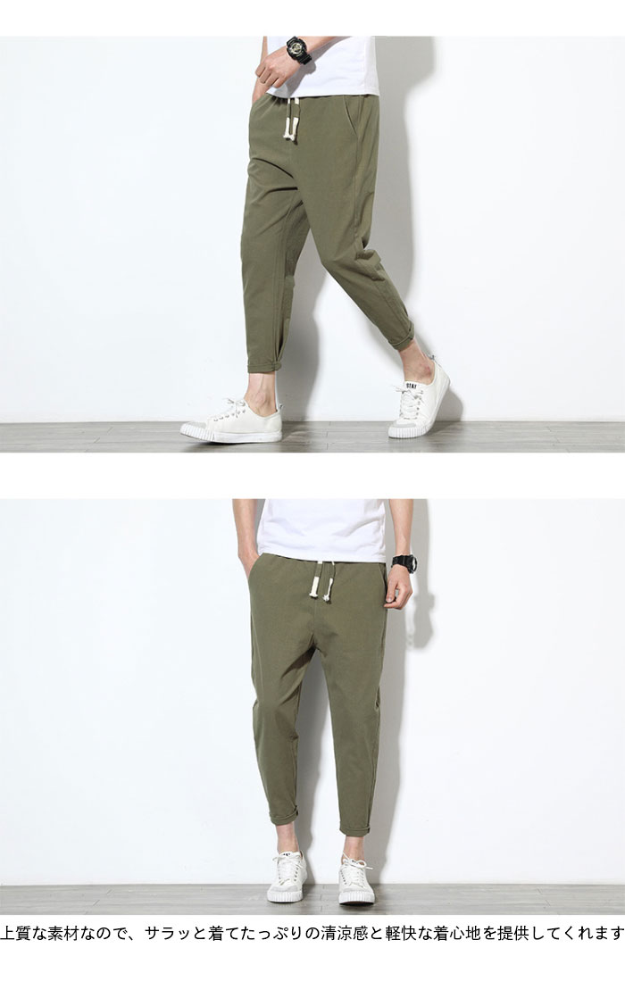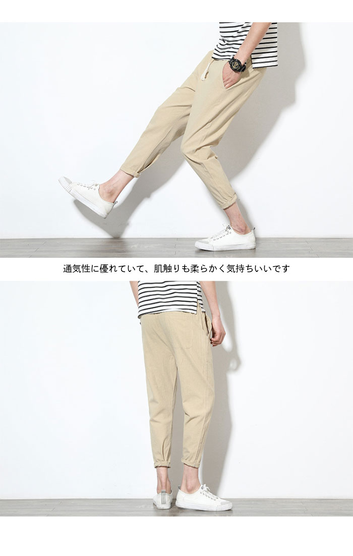 サルエルパンツ ズボン メンズ 9分丈 無地 リネンパンツ 綿麻パンツ ボトムス 涼しい アンクルパンツ おしゃれ ロングパンツ 夏服 メンズファッション パンツコーデ ゆったり 調整紐